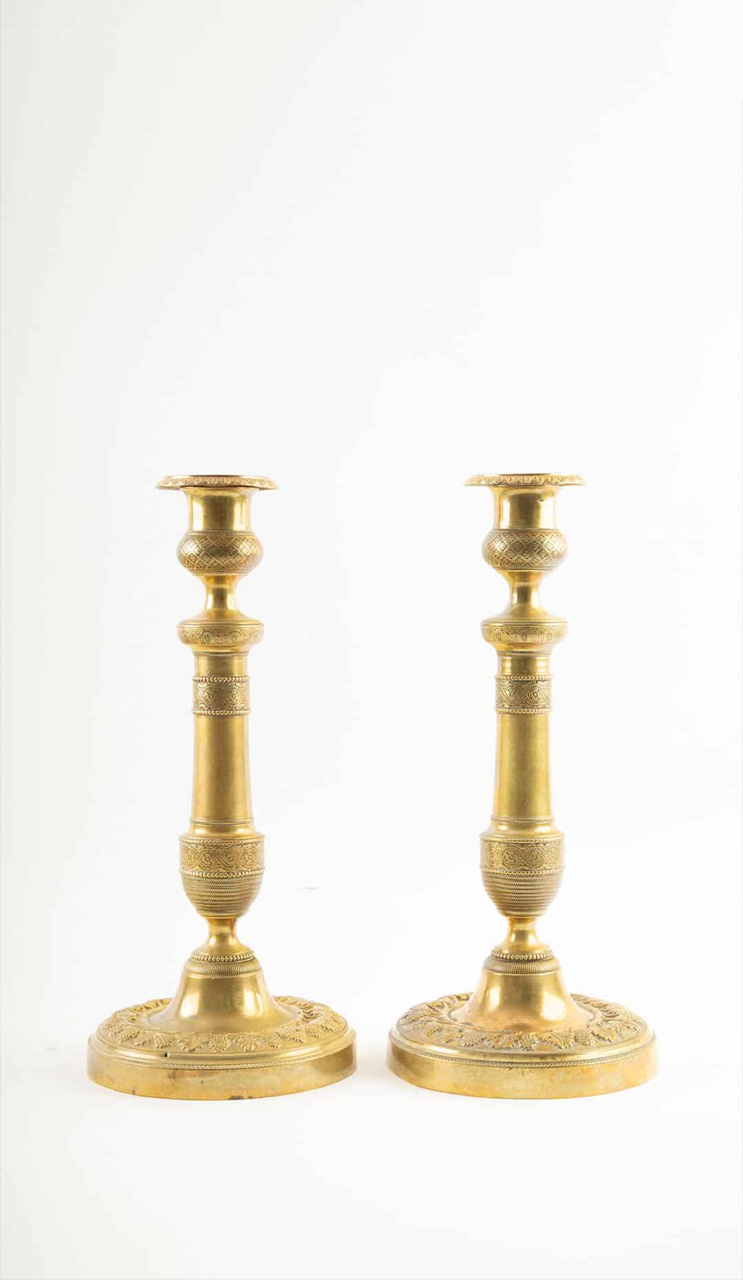 Pair of French Restoration Period Chased Gilt Bronze Candlesticks with Bobèches