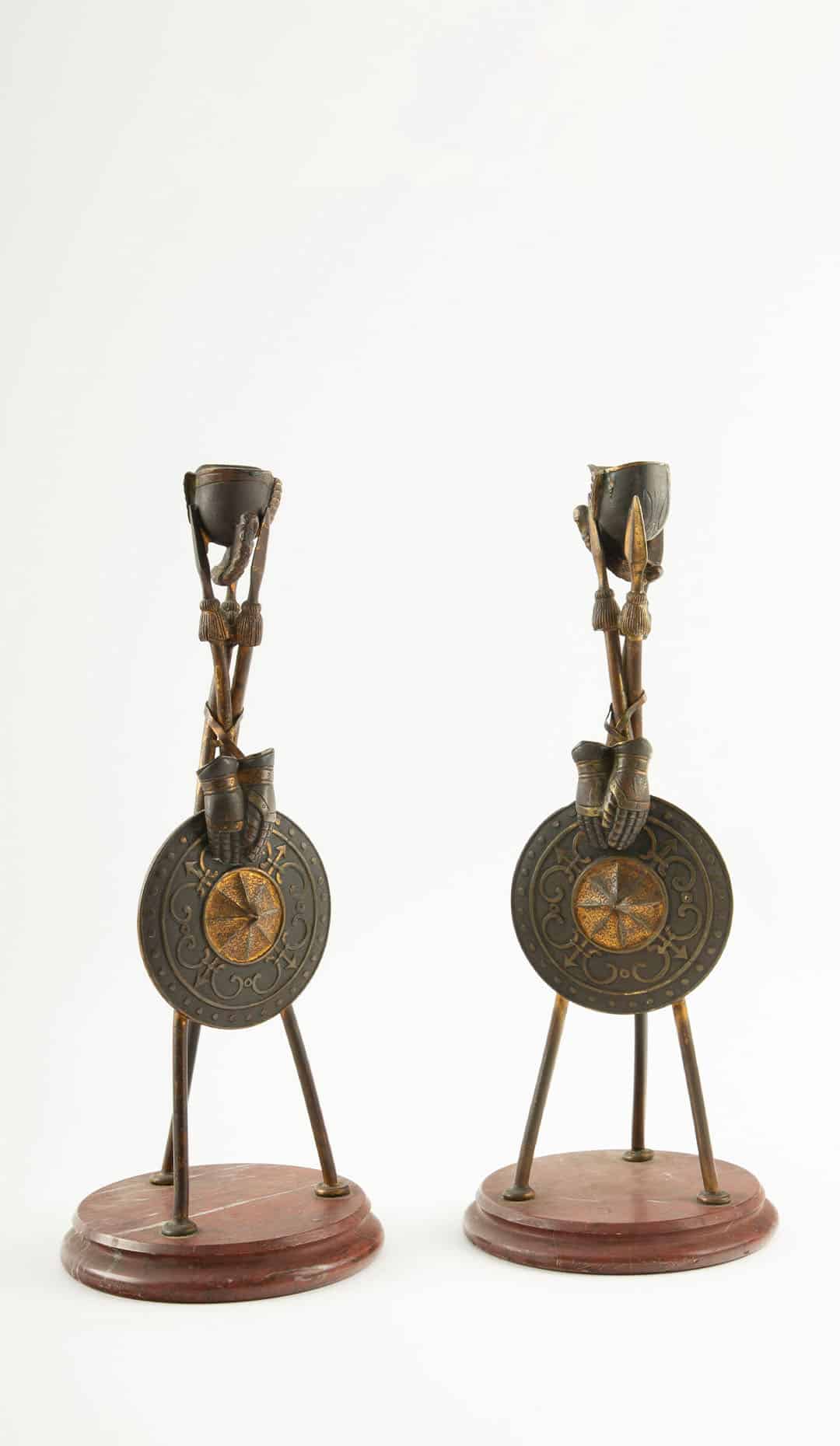 Pair of 19th-C French Bronze Tripod Candlesticks- Martial Motifs on Marble Bases
