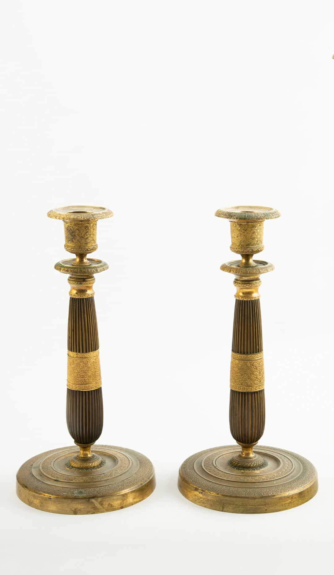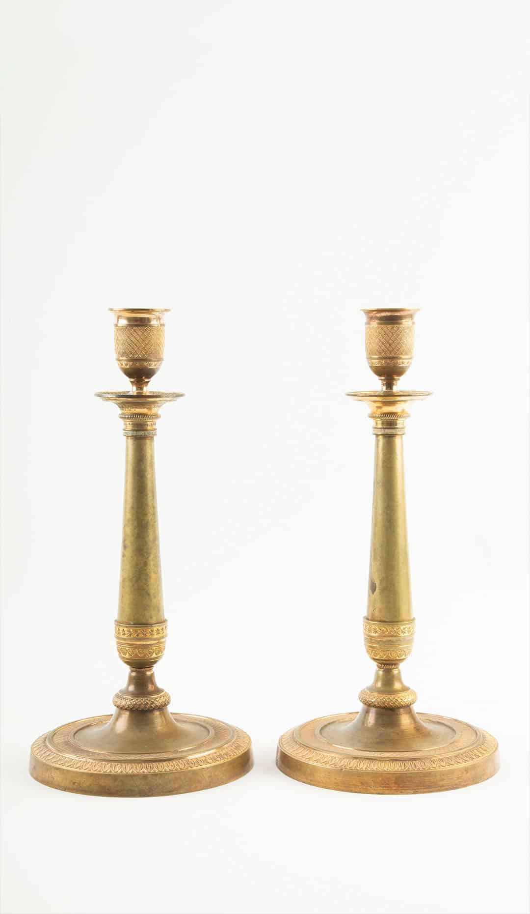 Pair of French Empire Period Gilt Bronze Candlesticks with Guilloché Decoration