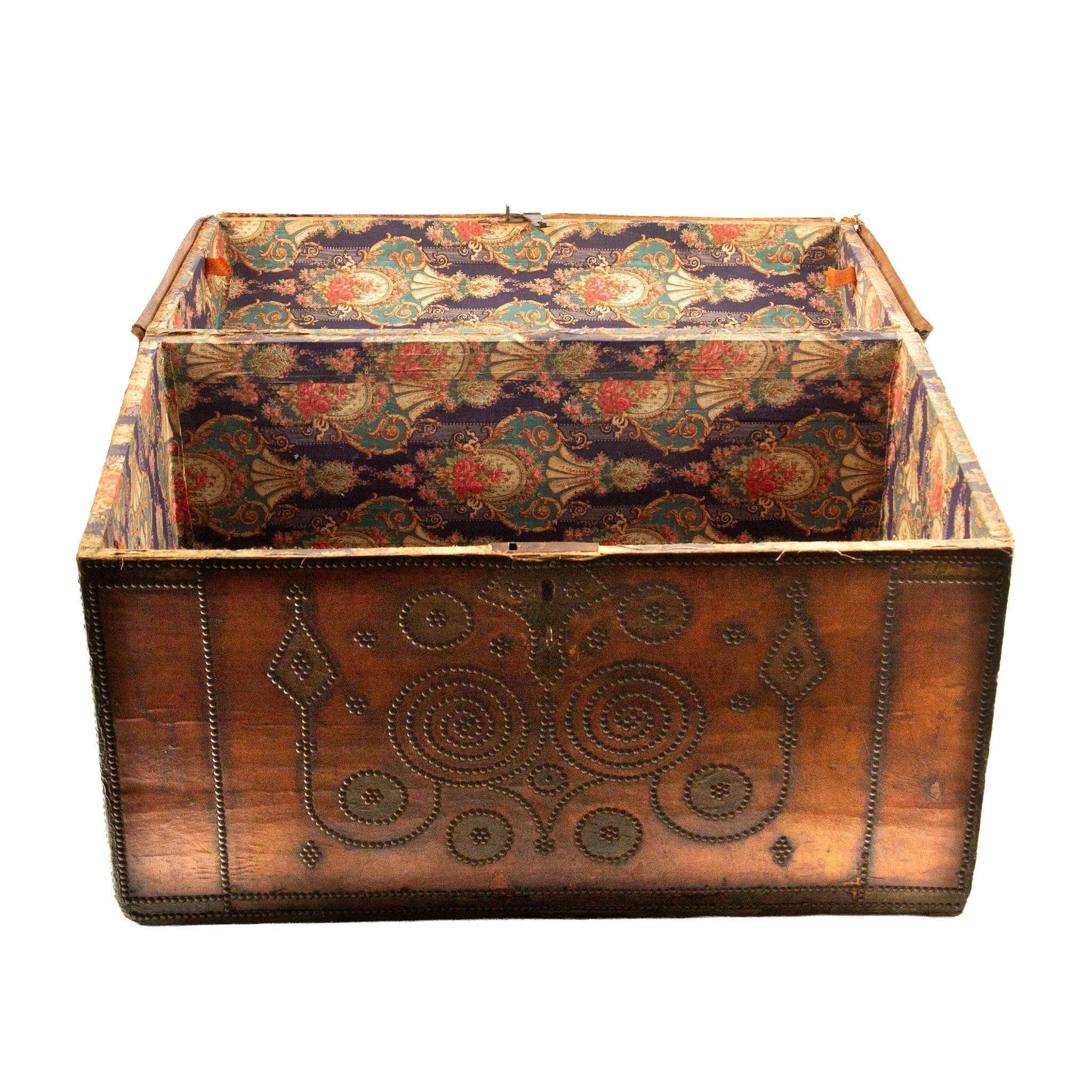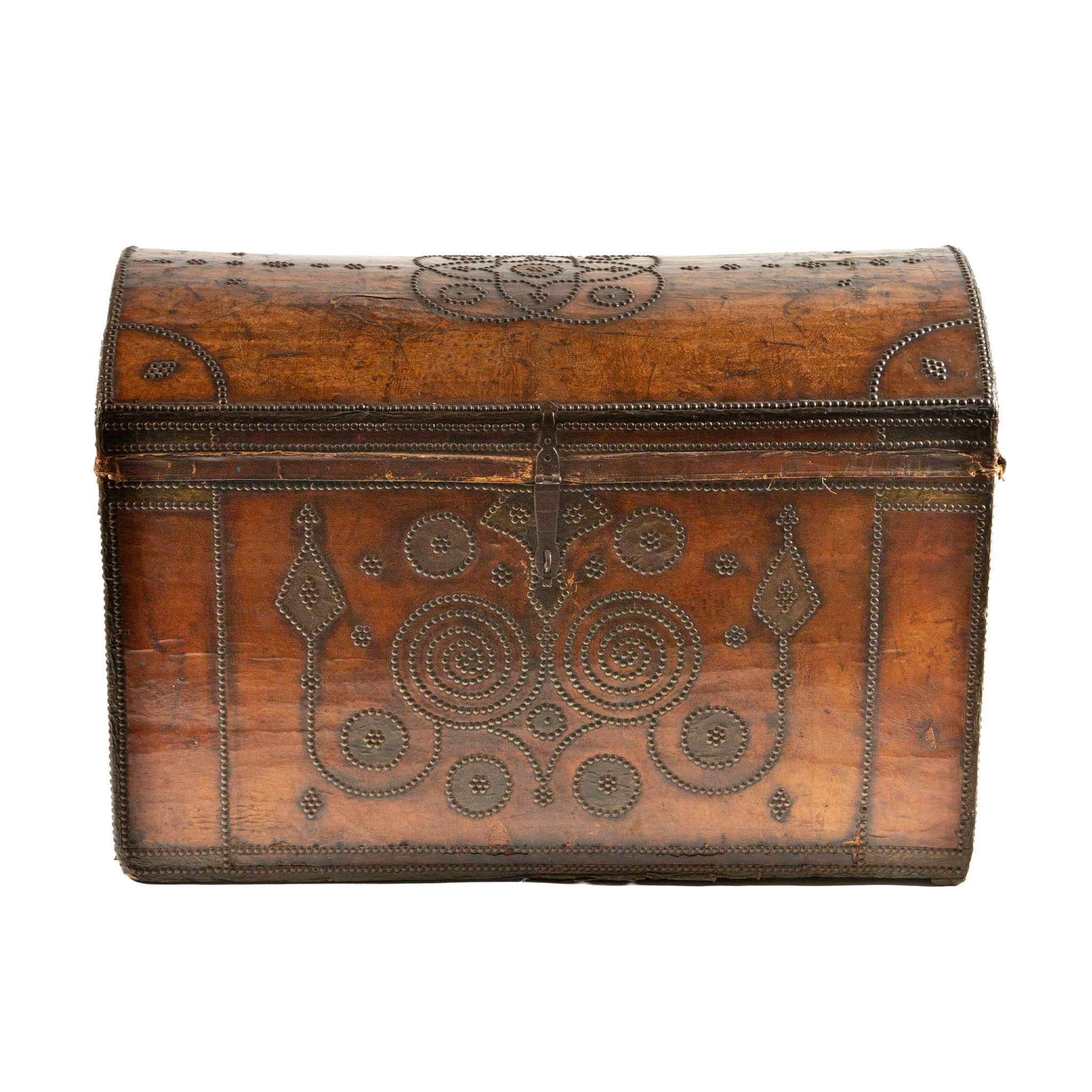 A substantial provincial coffre (trunk) of oak sheathed in richly patinated, amber-toned leather and embellished on every face with elaborate nail-head (clouté) patterns—spirals, lozenges, and border bands executed in hundreds of brass studs. The arched lid lifts on forged strap hinges and secures with its original hasp and staple; pierced iron side handles facilitate carrying. Representative of the trunks made in Southern France for travel or dowry storage, it combines sturdy joinery with Baroque decorative flair. Wear, scuffs, and minor losses consistent with age enhance the warm surface and attest to centuries of service. Dimensions: 37 in W × 25.25 in H × 21 in D.