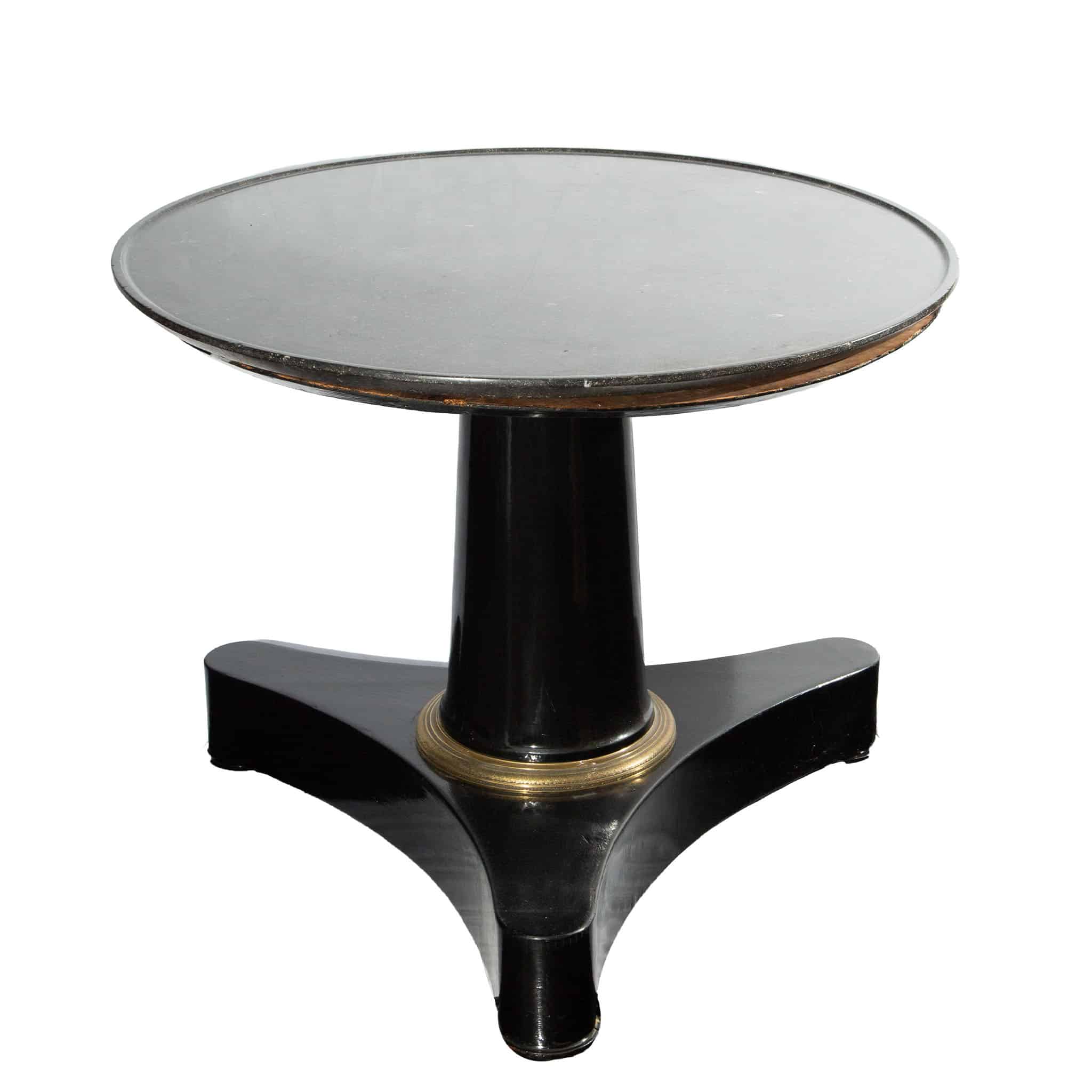 The table is supported by a tapered cylindrical central column, finished in a deep piano-black lacquer, resting on a tri-form base with rounded corners. The transition between the column and the base is encircled by an engine-turned gilt-bronze collar decorated with fine geometric patterns—an element suggestive of Empire or late Neoclassical influence. The ormolu retains its period tooling and appears original.