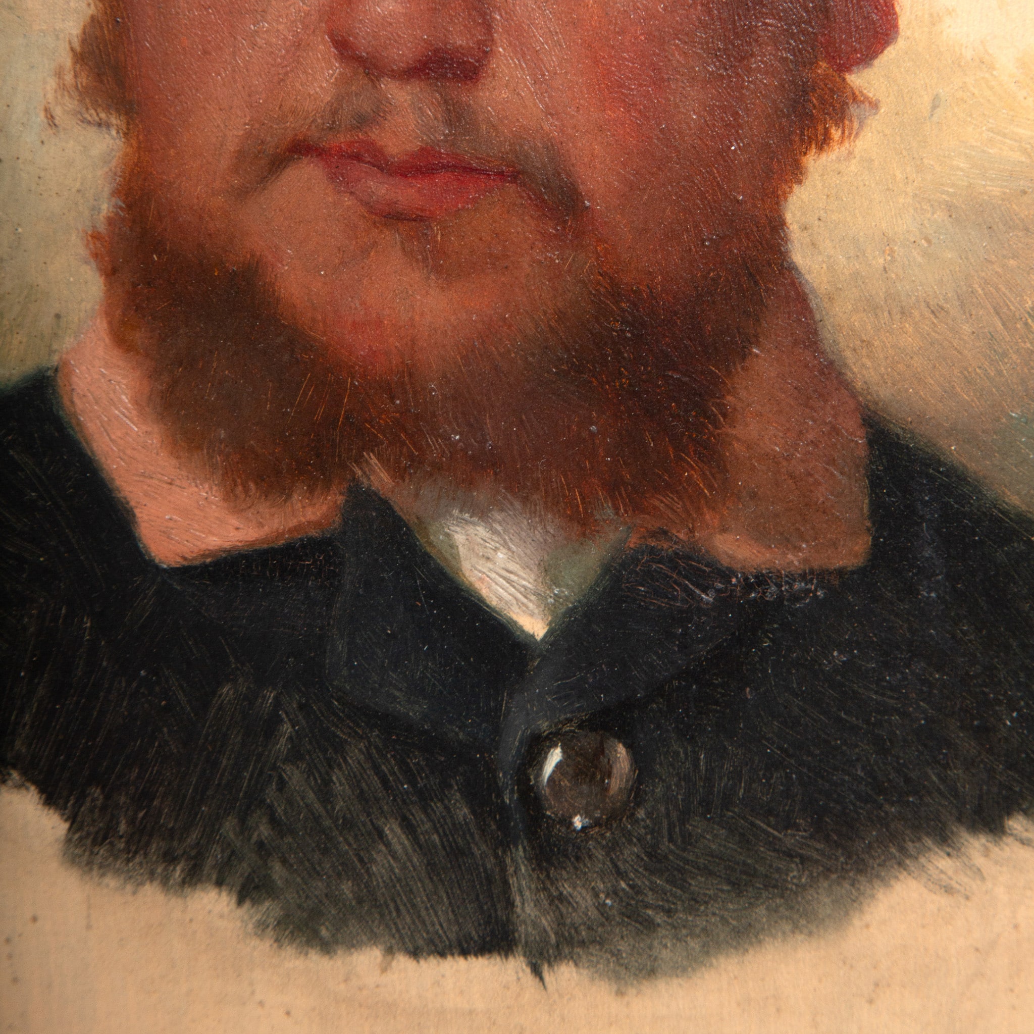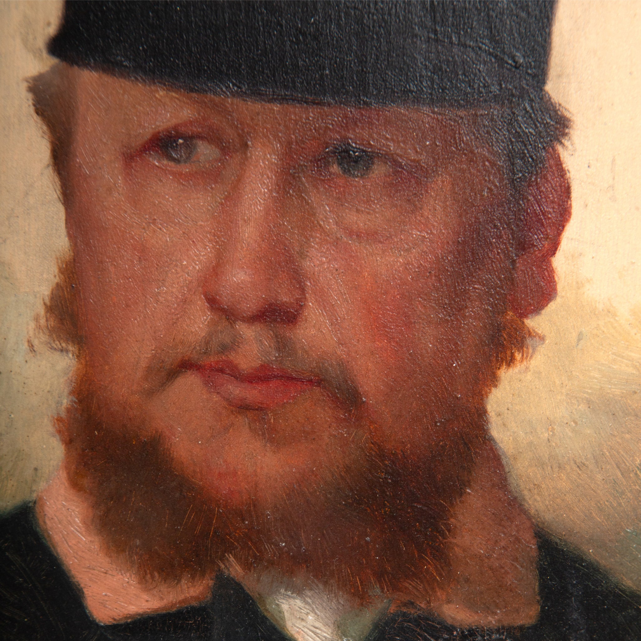 The softly neutral background keeps the focus on the subject’s expression, while the use of panel support and intimate scale suggest a personal or private commission rather than a formal salon work. Housed in a period black-painted frame with a gilt liner, the portrait has strong presence despite its modest size and will appeal to collectors of French sporting art, 19th-century realism, and character-driven portraiture.