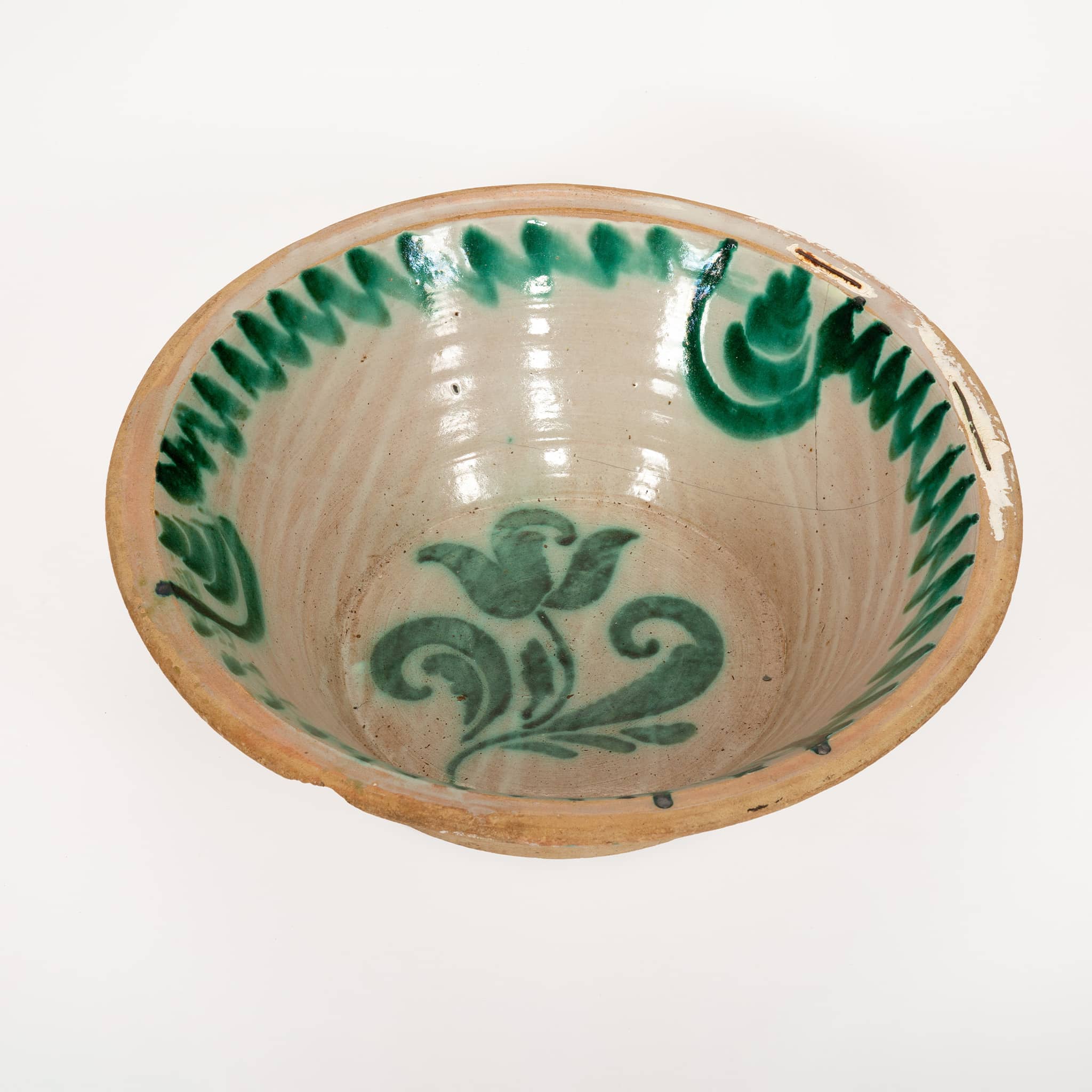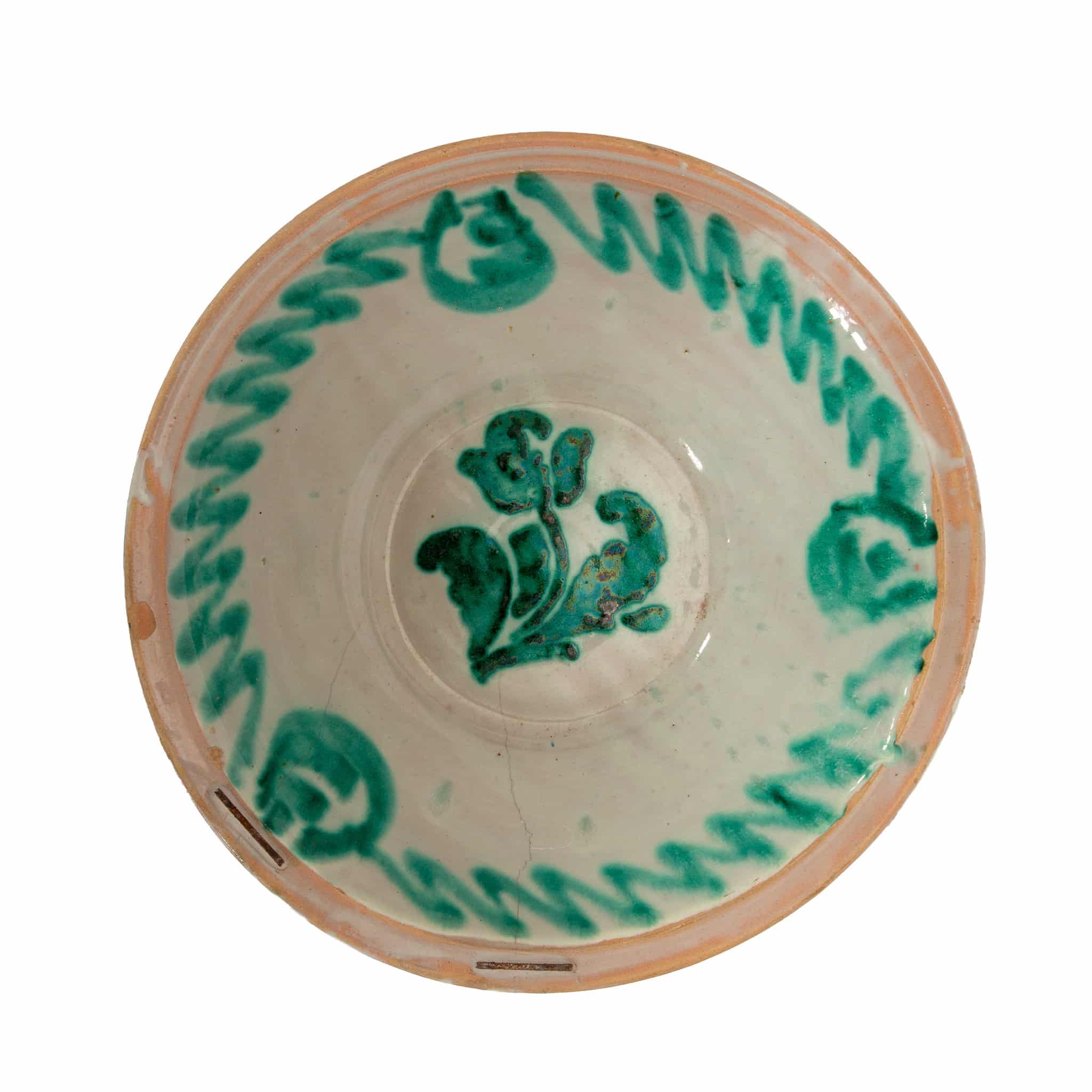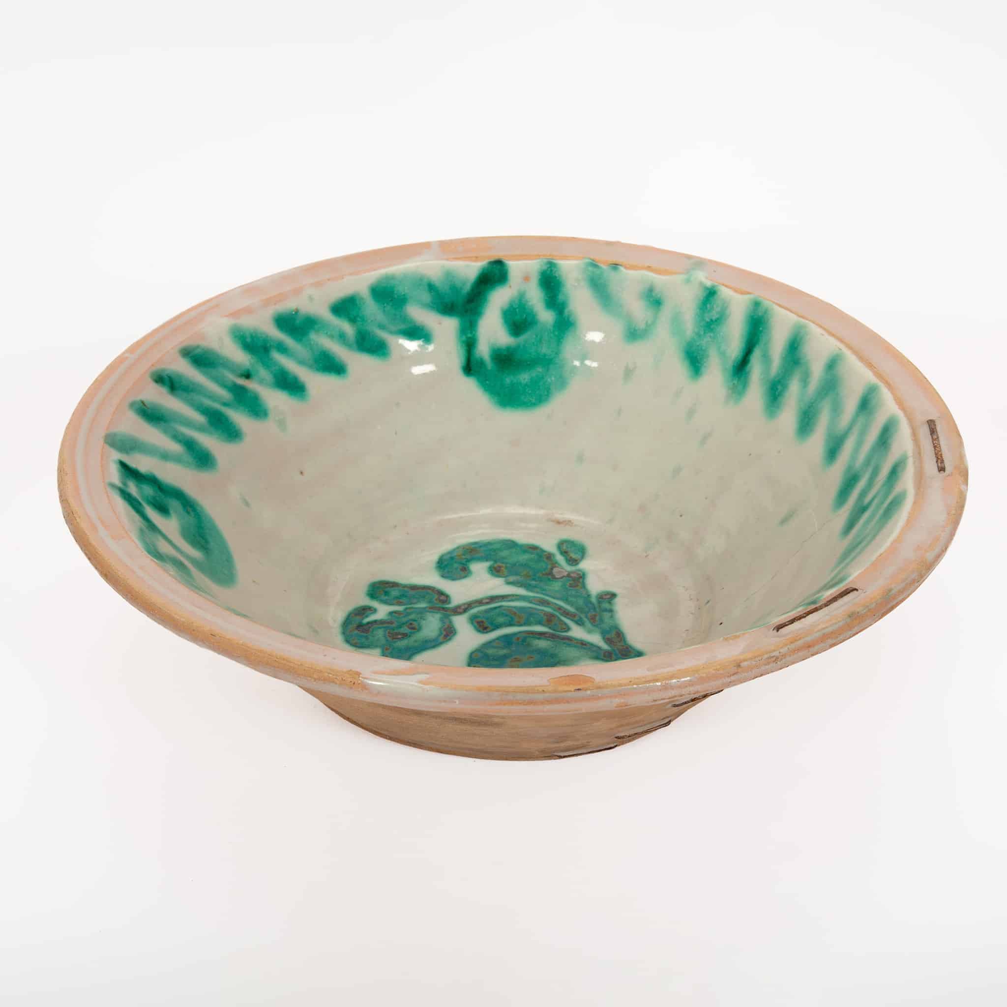 A 19th-century Spanish Fajalauza lebrillo from Granada, measuring 15 inches in diameter. A lebrillo is a wide ceramic bowl with a pronounced rim, first produced in Andalusia in the 15th century and traditionally decorated in green and white with a terracotta rim. These bowls were essential all-purpose household objects, used for laundry, food preparation, and bathing children, and were made in eight different sizes according to their function.