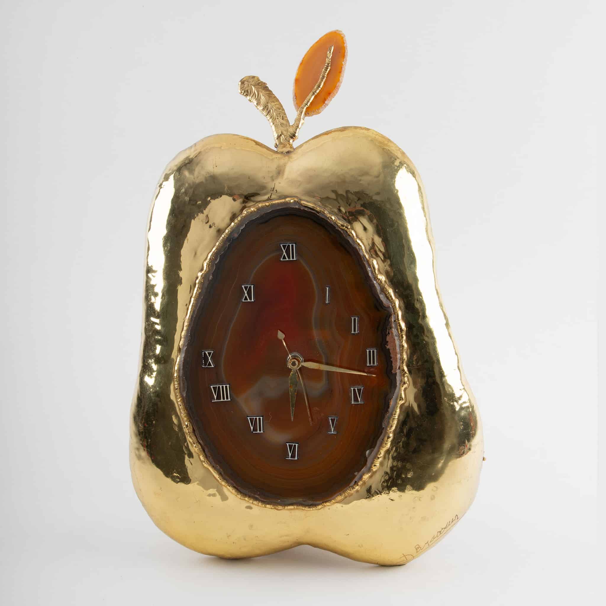 This whimsical yet refined mid-20th-century clock-lamp takes the form of a stylized apple, executed in gilt metal and centered with a naturally banded agate slice that serves as the clock dial. The agate is fitted with applied Roman numerals and elegant clock hands, while a sculptural stem and an agate-set leaf crown the composition, reinforcing the organic inspiration at the heart of the design. The interplay between polished stone and gilded metal lends the piece both visual warmth and tactile richness.
