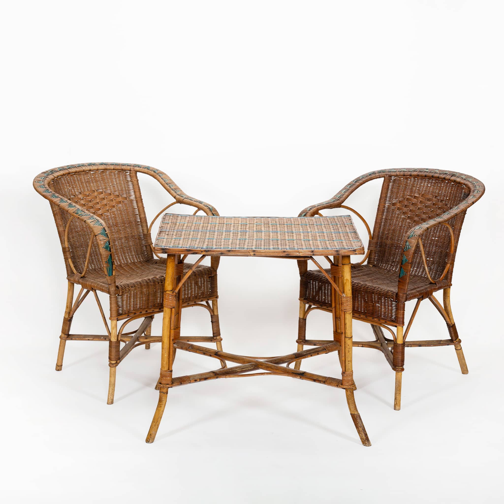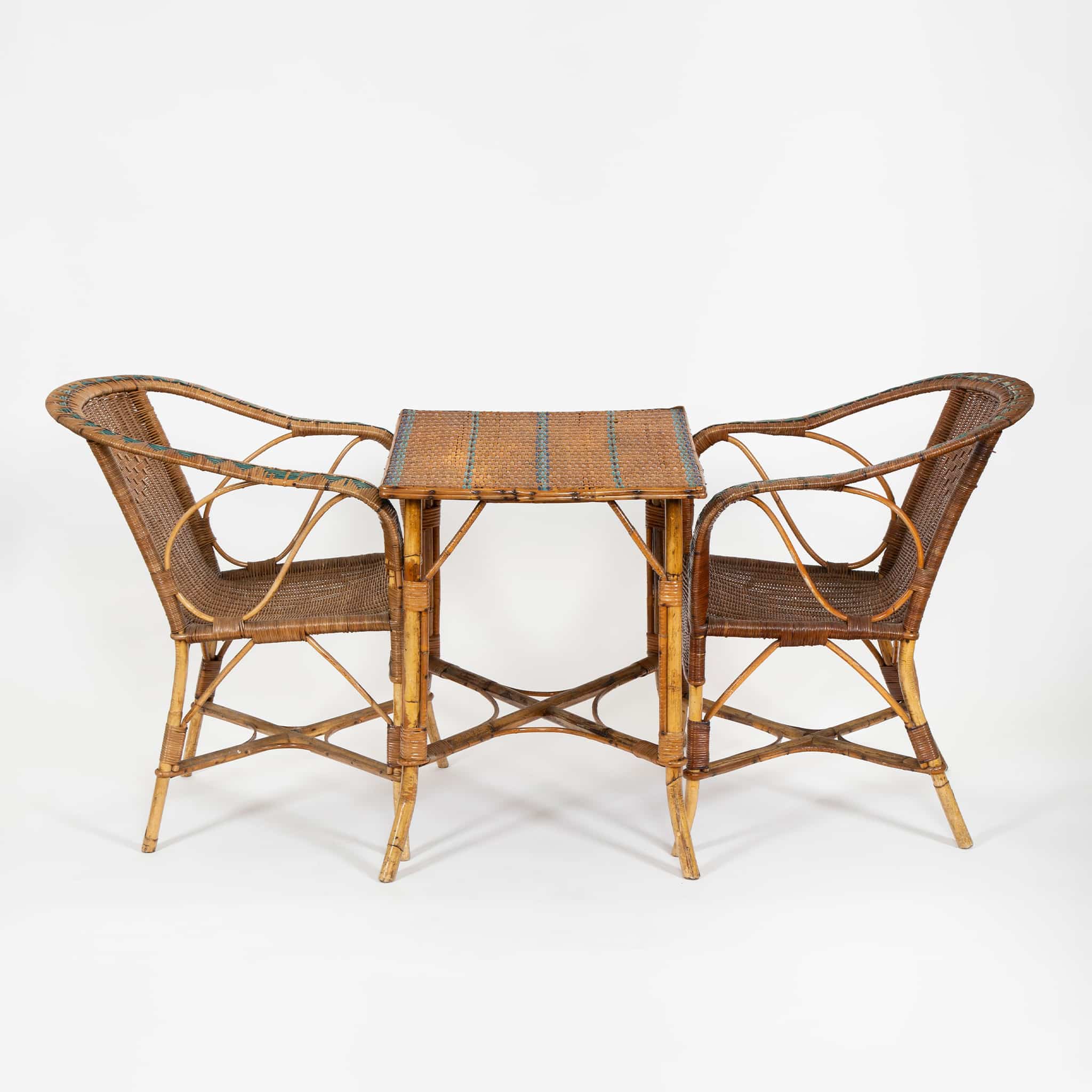Decorative turquoise-toned bindings accent the edges of the backs and frames, introducing a subtle graphic detail that enlivens the warm honeyed tones of the rattan. The accompanying side table echoes the same construction and materials, with a woven top and slender bamboo base designed to nest comfortably between the chairs.
