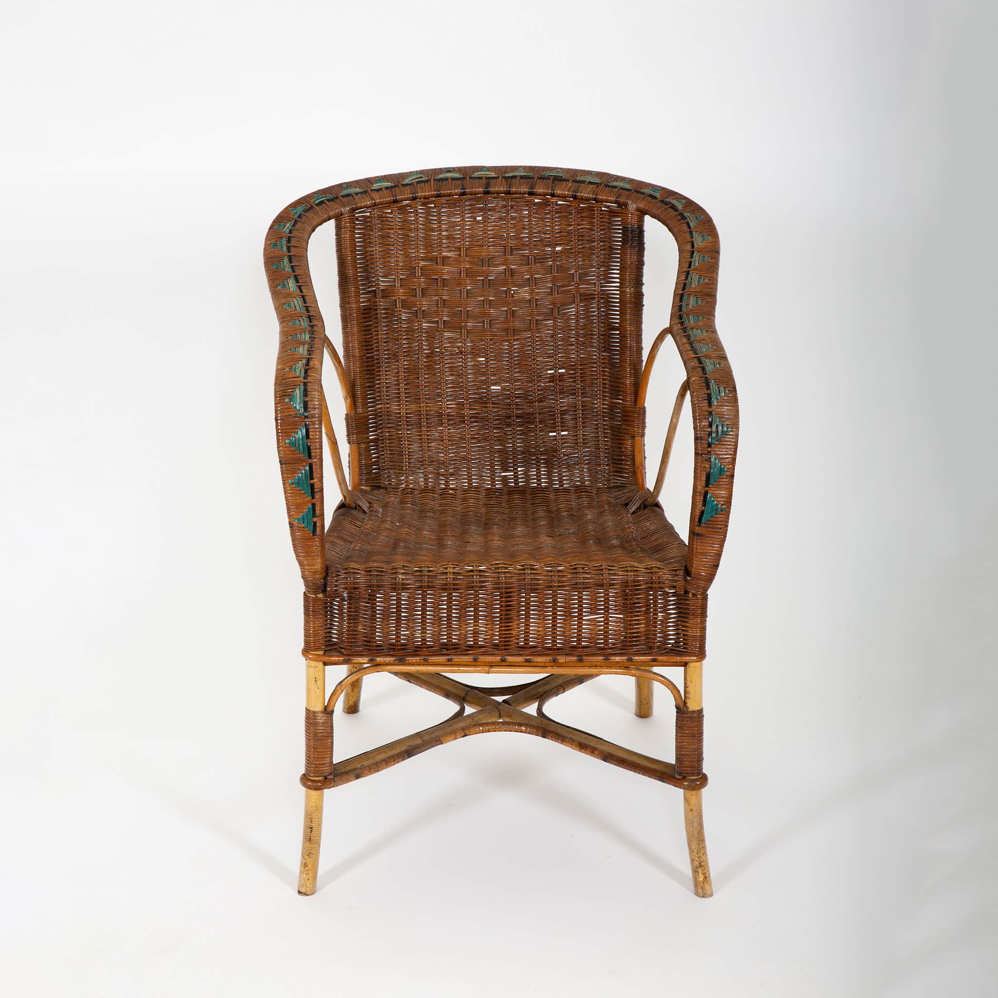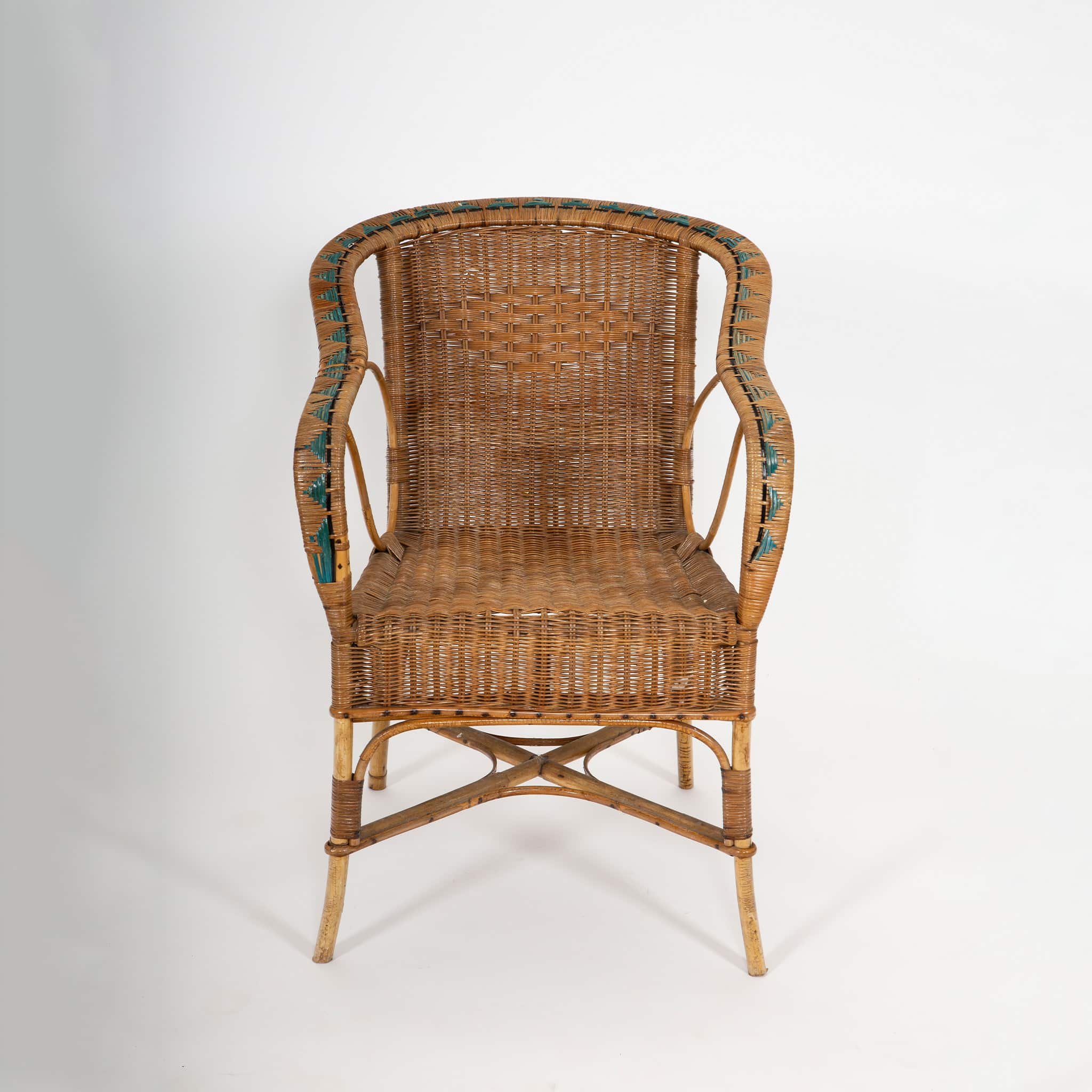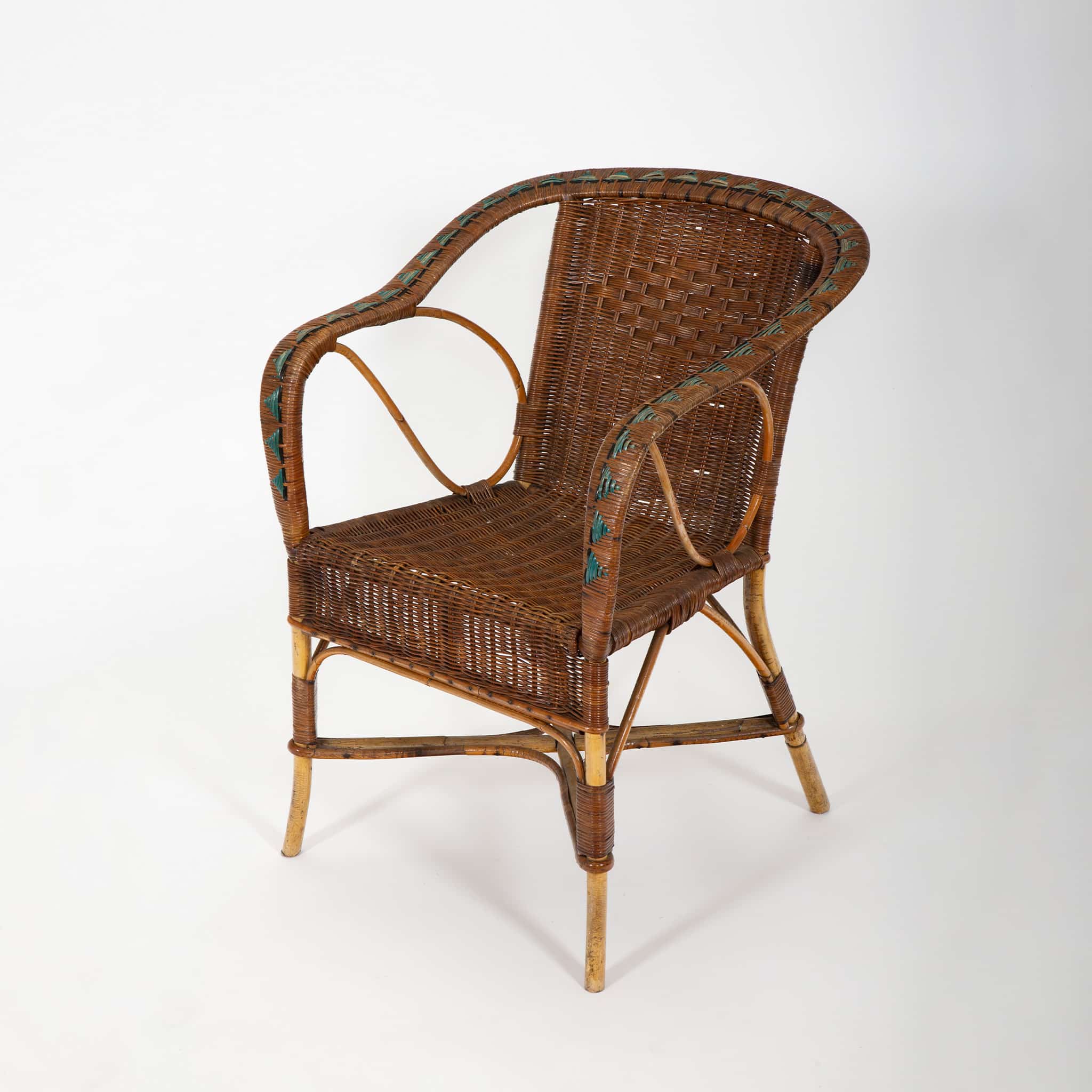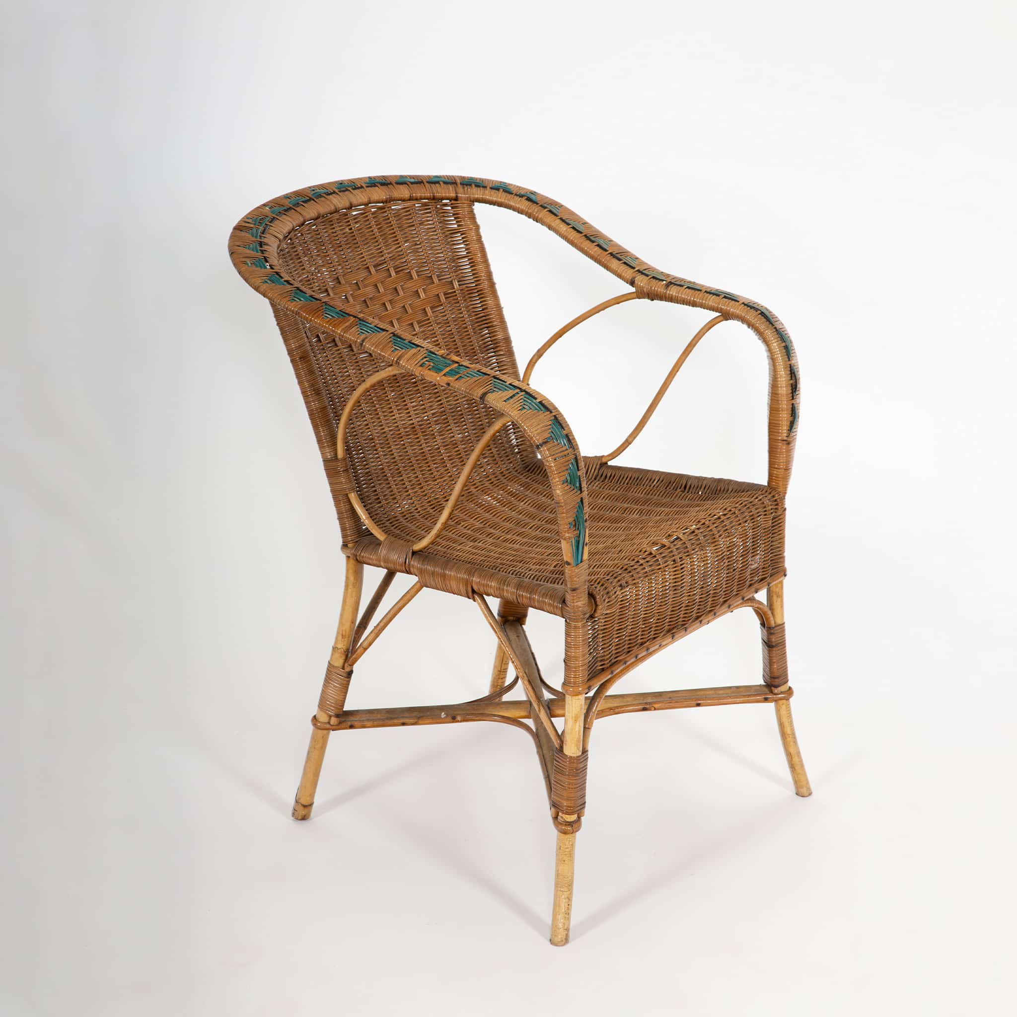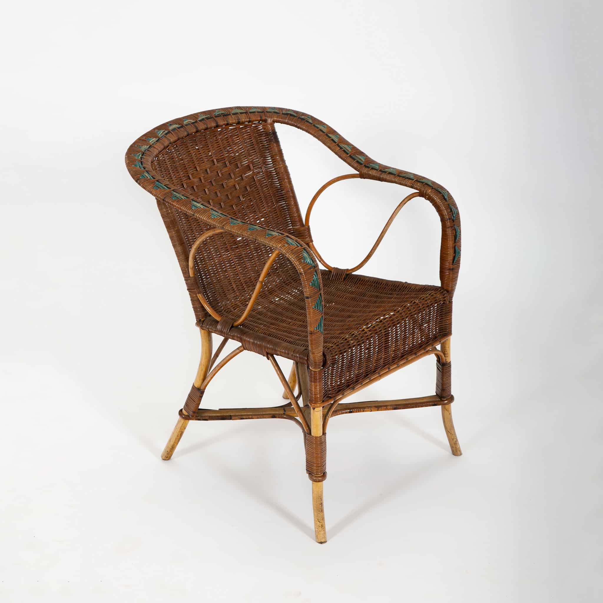Such sets were popular in winter gardens, verandas, and indoor sitting rooms, reflecting the period’s fascination with light, natural materials and relaxed yet sophisticated leisure furnishings. While the maker is unrecorded, the quality of execution and stylistic details are consistent with French artisanal workshops specializing in rattan and bamboo furniture during the postwar era.