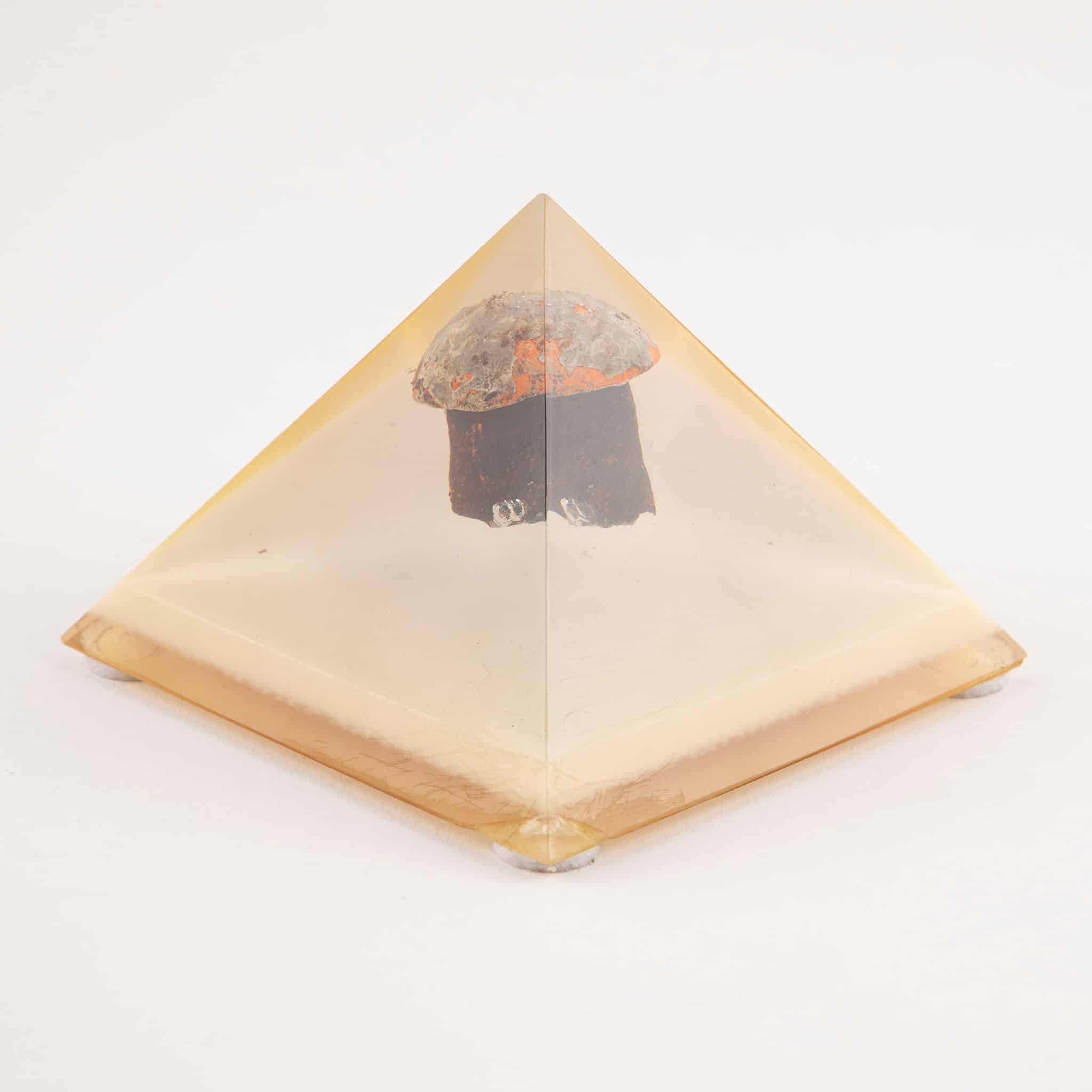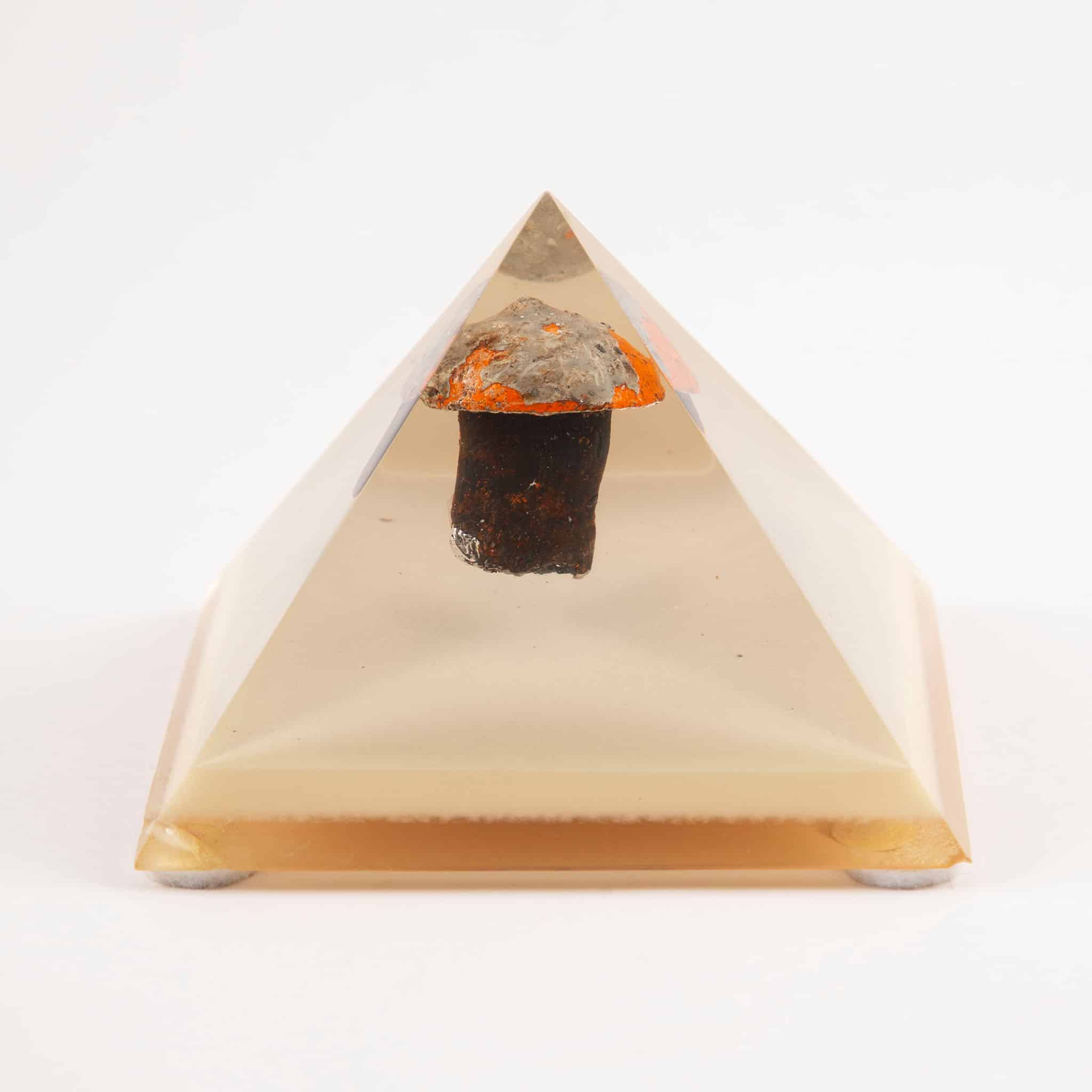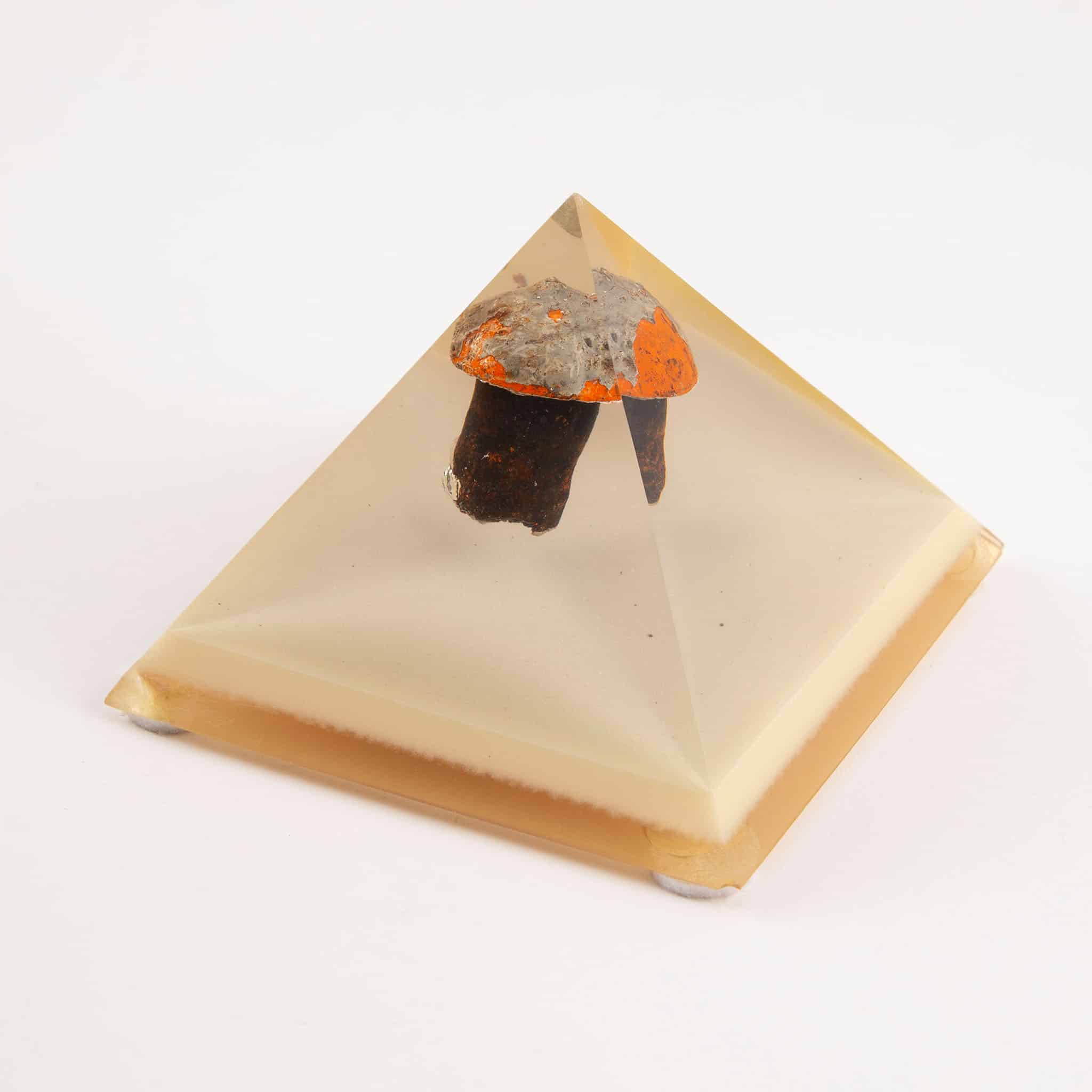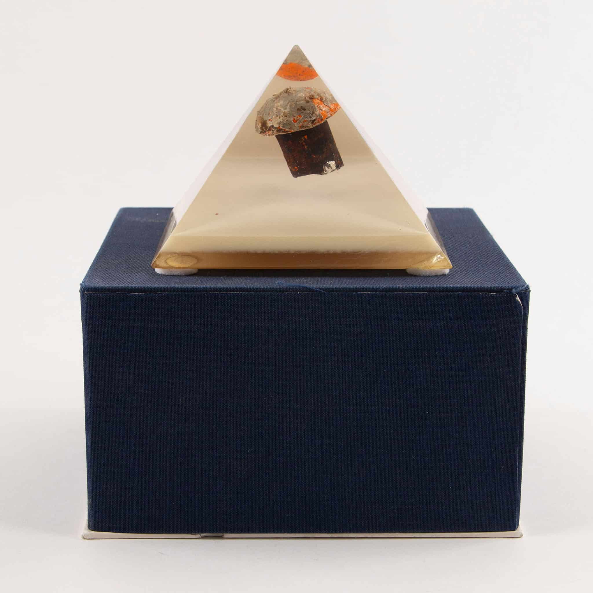 A historic wrought-steel rivet—one of the 2,500,000 fasteners driven red-hot to join the 18,038 iron elements of Gustave Eiffel’s tower for the 1889 World’s Fair—preserved in a clear cast-Lucite (Plexiglas) pyramid with an integral, printed certificate of authenticity numbered “152.” Traces of the Tower’s early paint schemes remain visible: the bright orange layer corresponds to the “Venice Red” primer applied for the 1900 Exposition Universelle, later over-coated by the yellow-brown hue adopted in 1907 and a precursor to today’s “Eiffel Tower Brown.” A rare, tangible fragment of the most famous monument of the Industrial Age, suitable for desk, library, or curio cabinet. Dimensions (pyramid): 4 ½ in W × 4 ½ in D × 3 in H (≈ 11.5 × 11.5 × 7.5 cm).