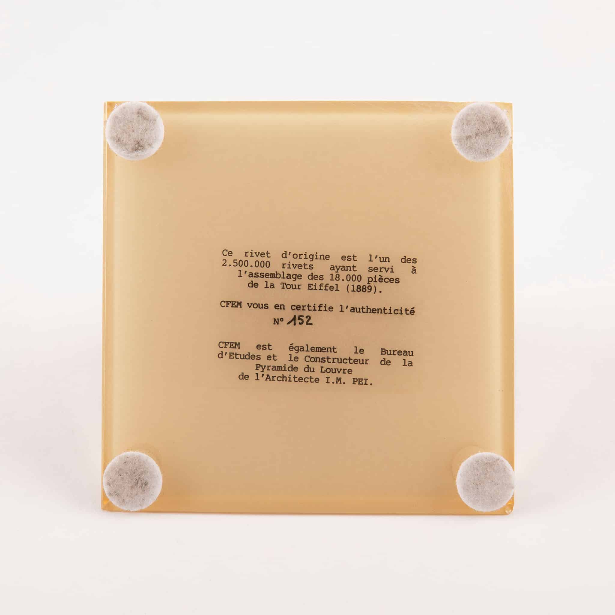 Original Eiffel-Tower Rivet, Exposition Universelle de Paris 1889 — No. 152, Encapsulated in Lucite Display Pyramid