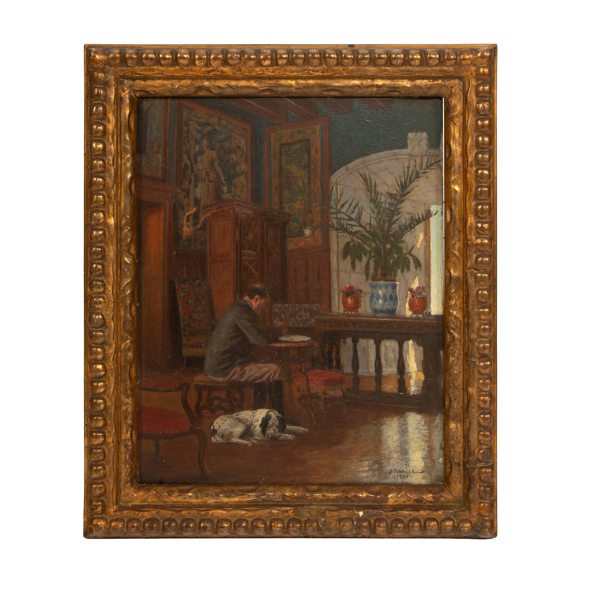 At Work: 1905 Painting of a Writer and His Dog in a Chic Salon, Signed J. Barcal