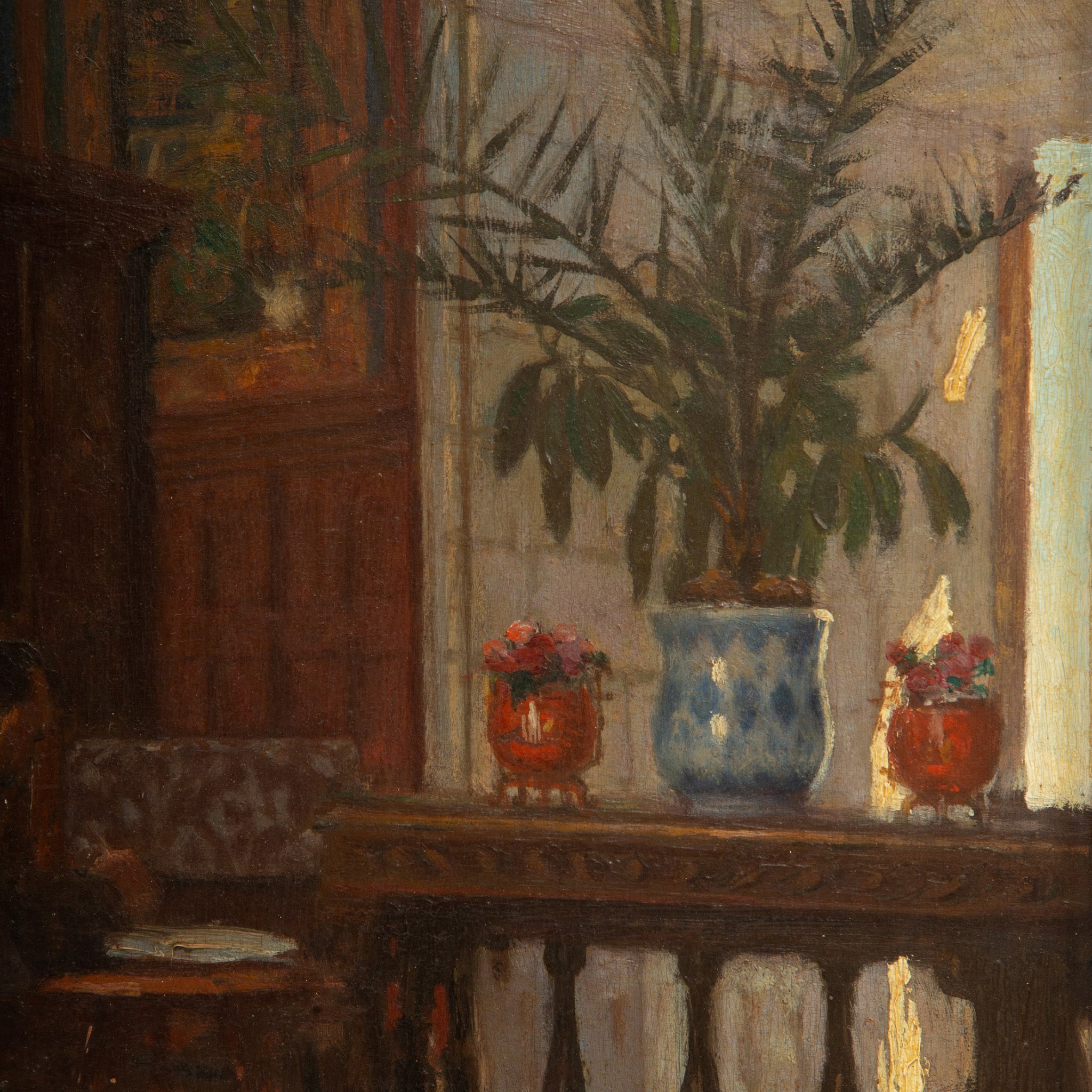 Decorative screens, potted plants, and ceramics suggest a refined private interior, lending the scene a quiet narrative intimacy and contemplative mood. The work reflects the tradition of late 19th-century genre painting, in which everyday moments are imbued with psychological depth and atmospheric sensitivity. Housed in a substantial period gilt frame, the painting possesses both charm and strong decorative presence.