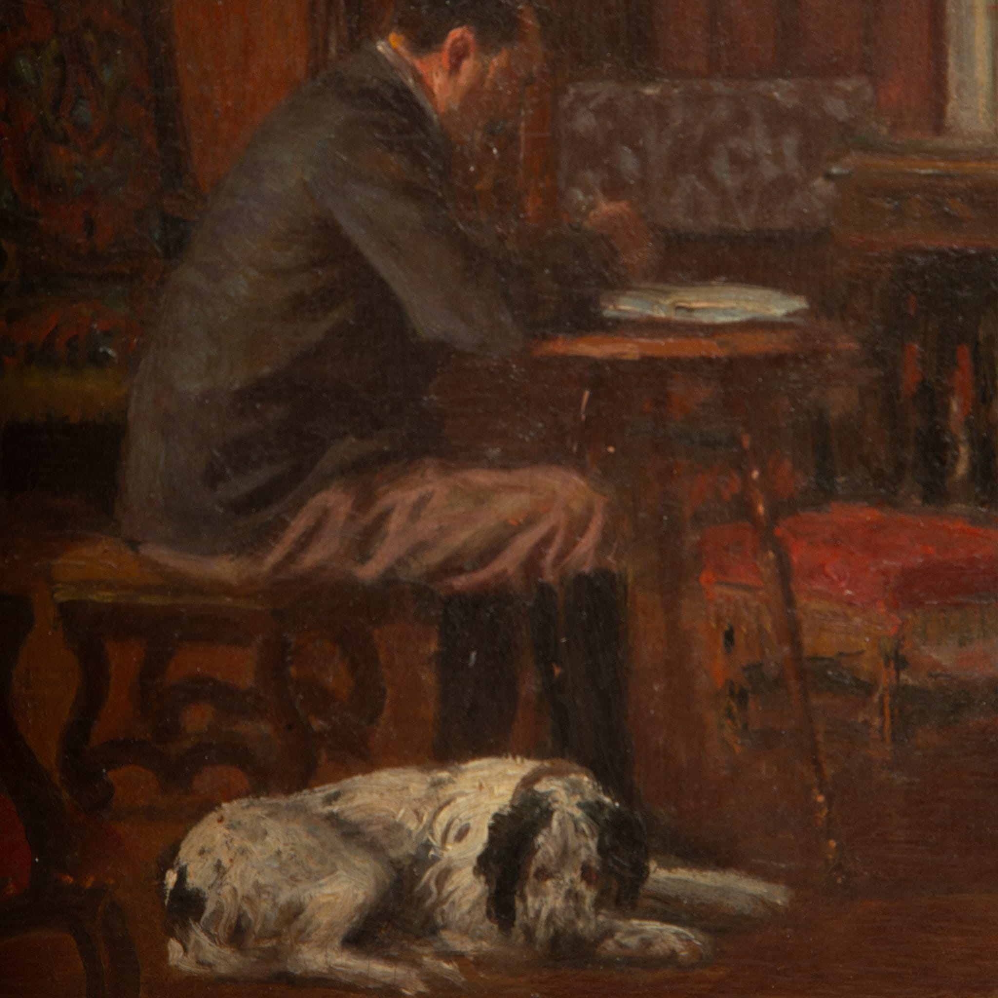 This evocative early 20th-century interior scene depicts a solitary writer seated at his desk in a richly appointed room, accompanied by his loyal dog resting at his feet. Painted in oil on panel, the composition is rendered in warm, subdued tones with careful attention to light, texture, and reflection, particularly in the polished floor and softly illuminated architectural details.
