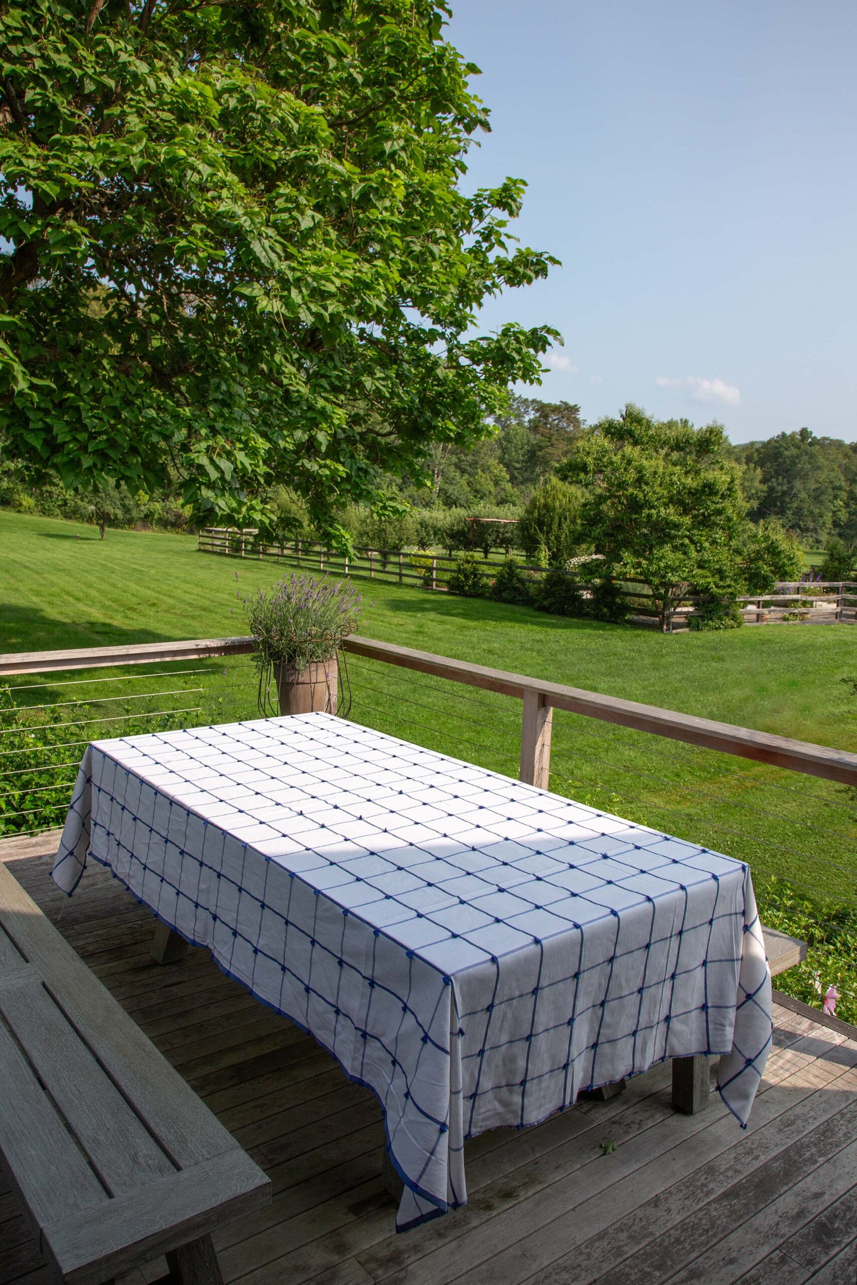 Blue Pom-Pom Tablecloth is beautiful addition to any dining table. Hand woven with 100% cotton by skilled artisans in Morocco exclusively for Creel and Gow. Available in three different sizes, including a small square measuring approximately 5.75' x 5.75', a large square measuring approximately 7.5' x 7.5', and a large rectangle measuring approximately 9' x 6.5', there's a perfect fit for any table setting.