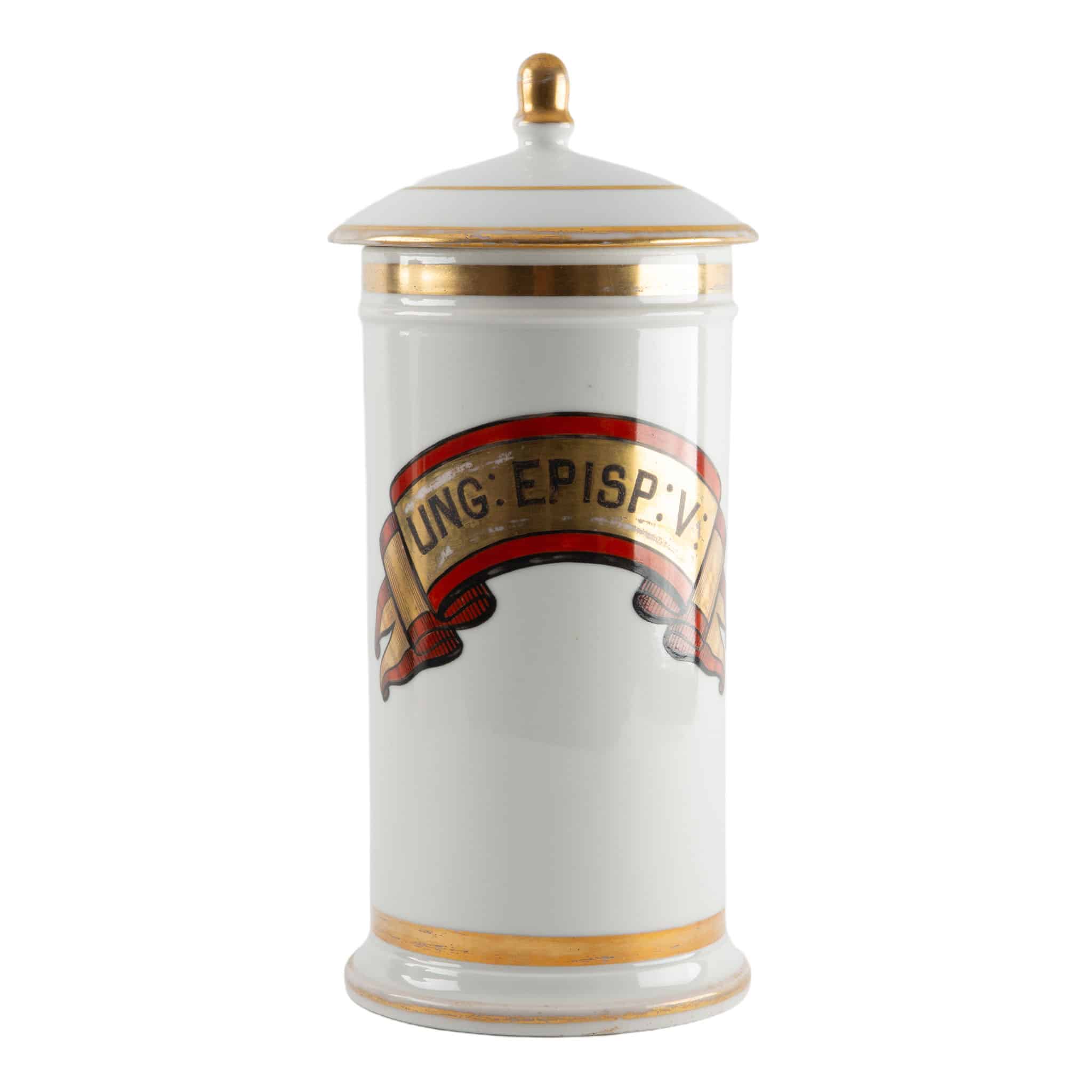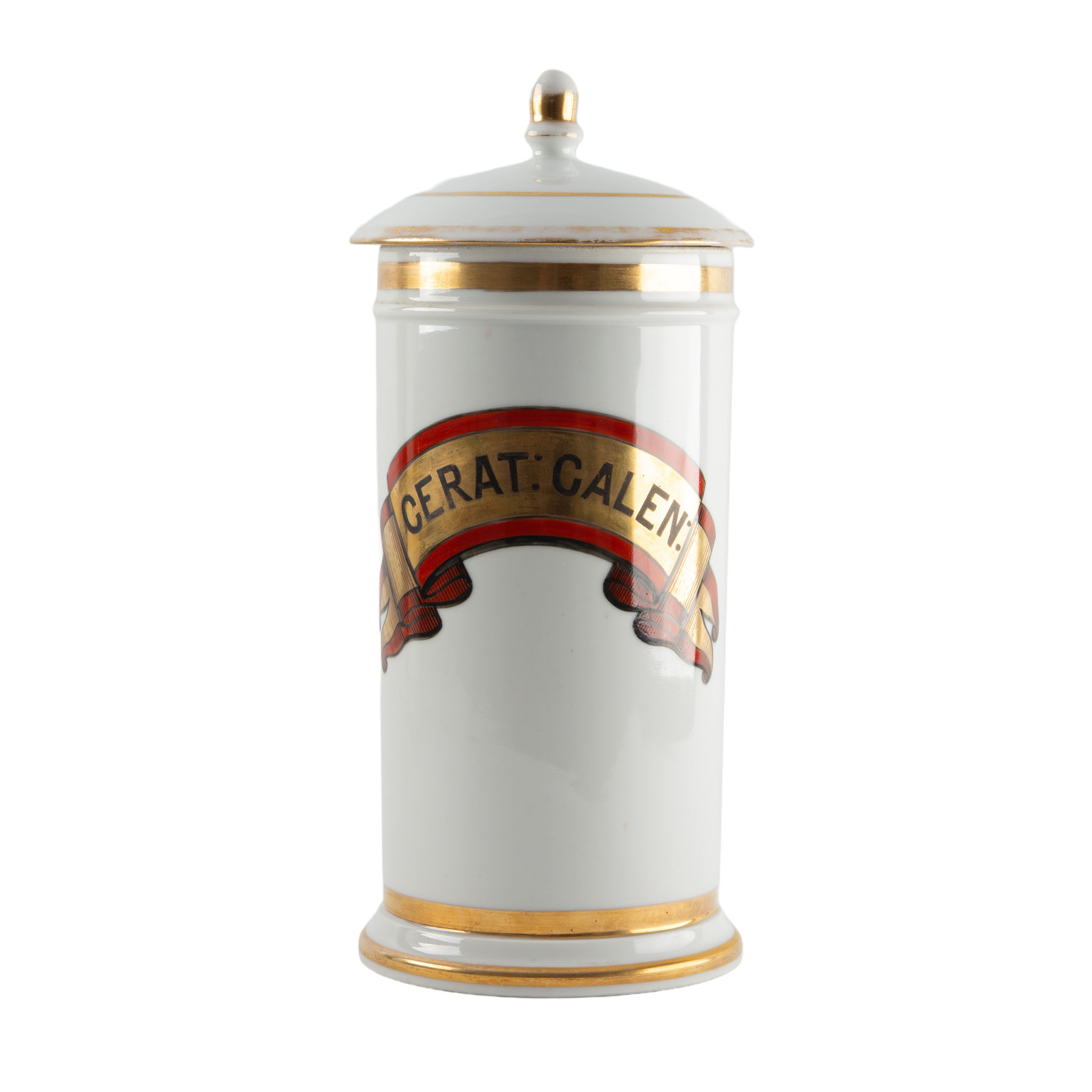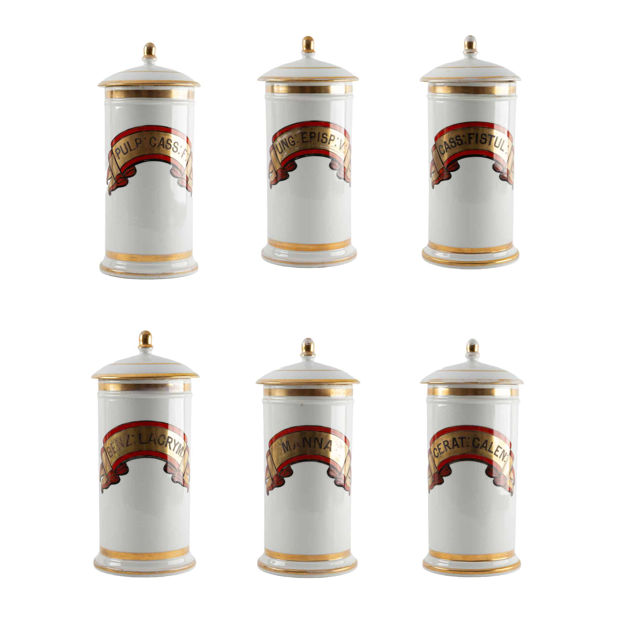 A fine set of six 19th century cylindrical porcelain apothecary jars (pharmacy Jars), each with a domed lid and gilt finial knop. The white ground bodies are decorated with hand-painted red and gilt scroll cartouches bearing Latin pharmaceutical inscriptions, including Pulv. Cass., Ung. Episp., Cass. Fistul., Dent. L. Lacrym., Manna, and Cerat. Calend.