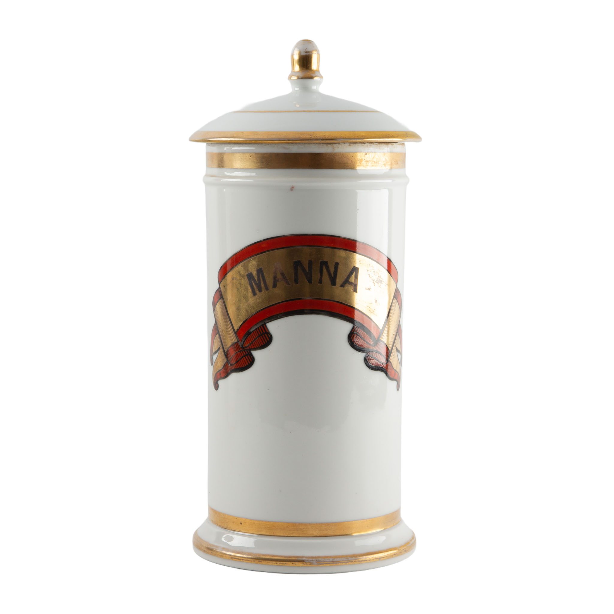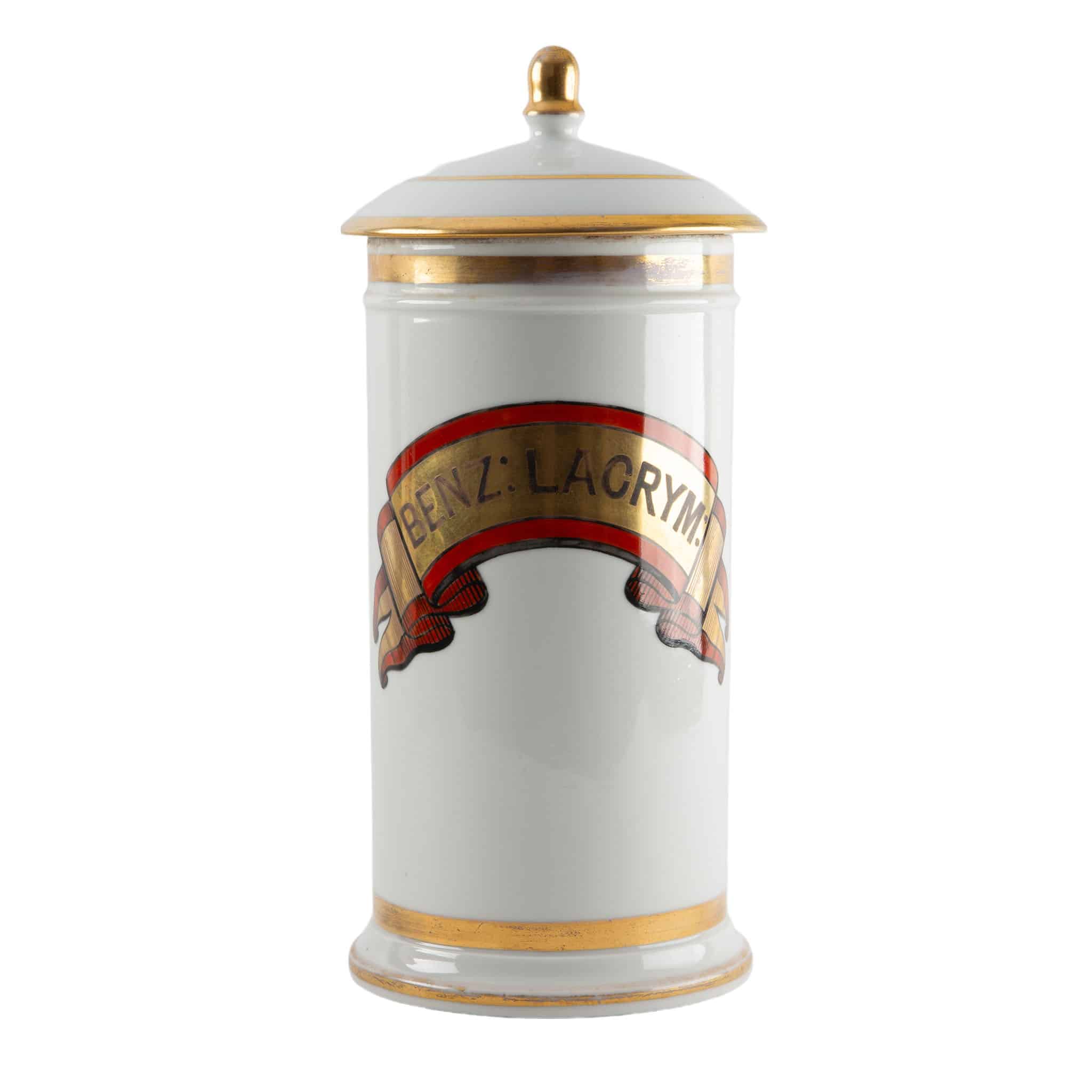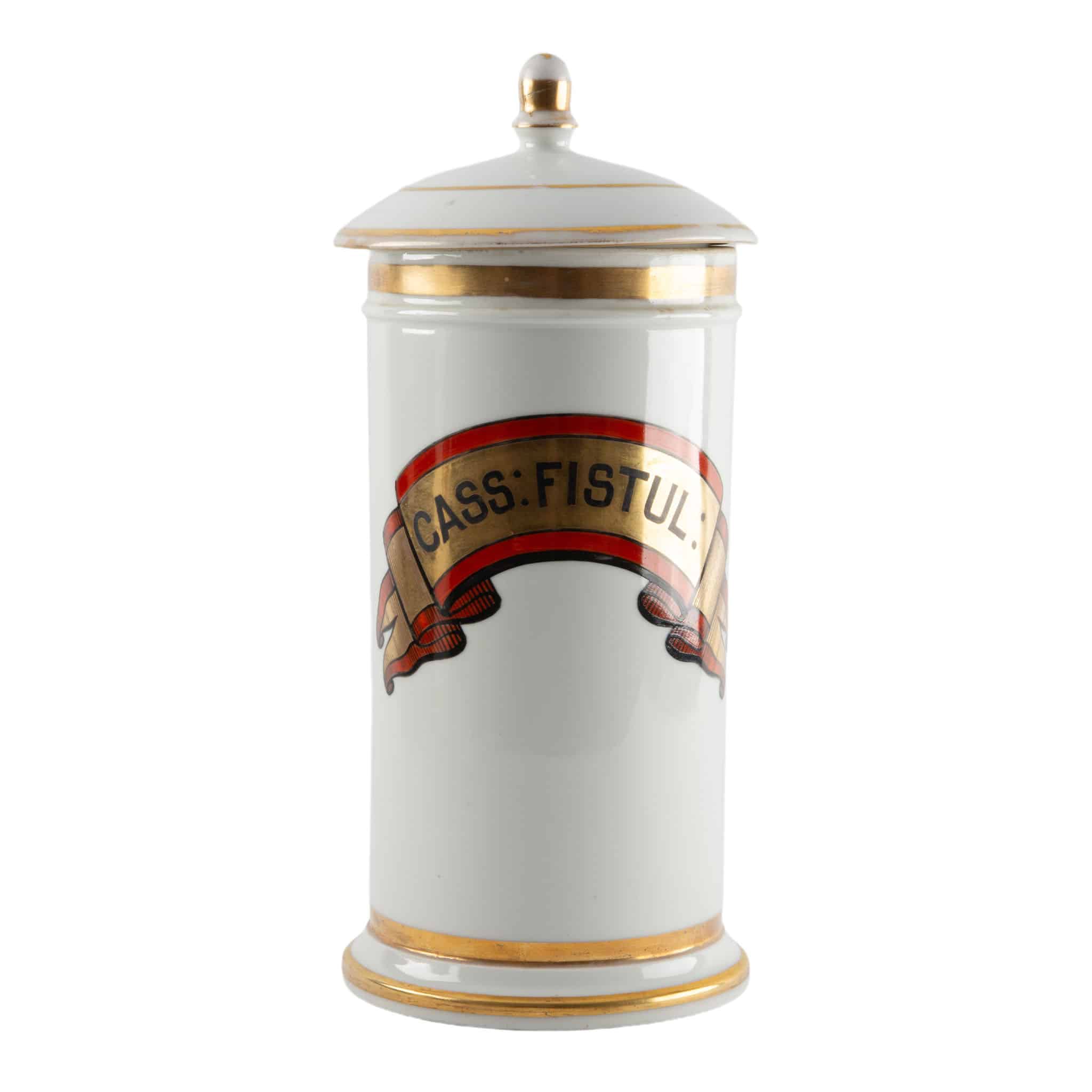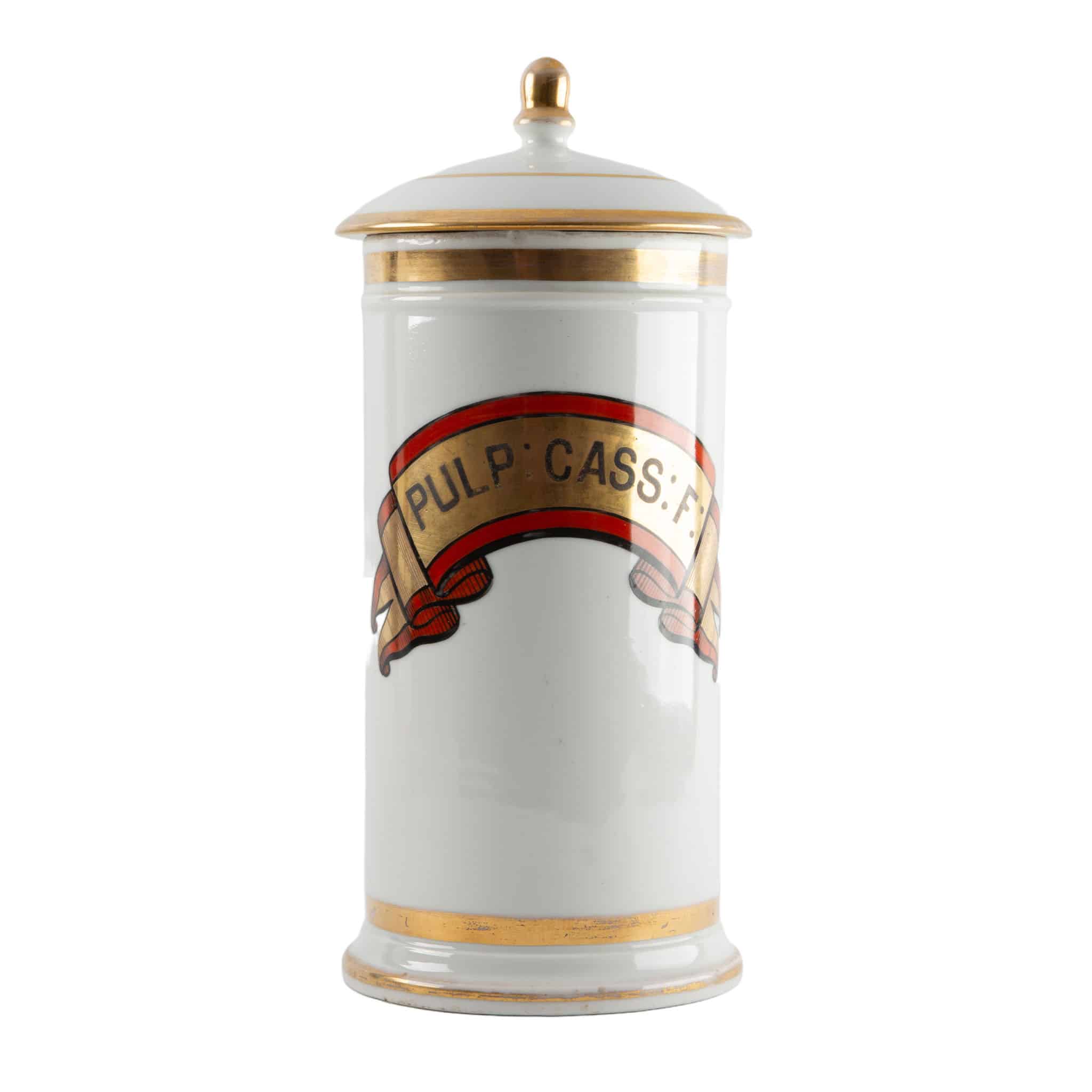 A fine set of six 19th century cylindrical porcelain apothecary jars (pharmacy Jars), each with a domed lid and gilt finial knop. The white ground bodies are decorated with hand-painted red and gilt scroll cartouches bearing Latin pharmaceutical inscriptions, including Pulv. Cass., Ung. Episp., Cass. Fistul., Dent. L. Lacrym., Manna, and Cerat. Calend.