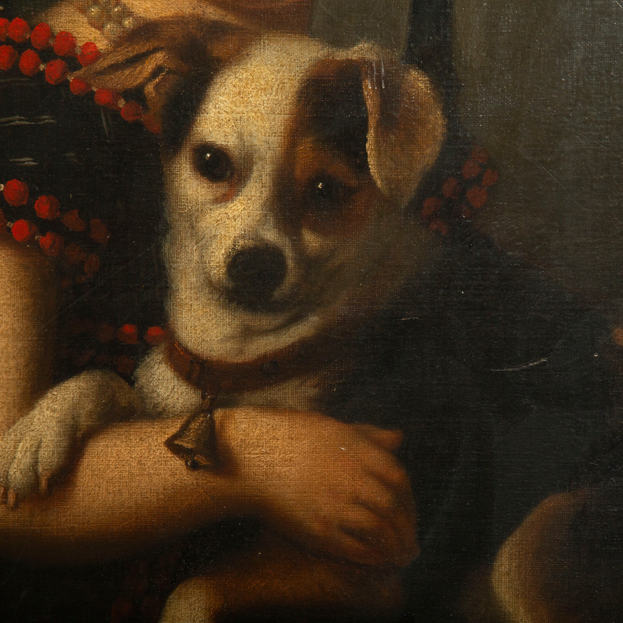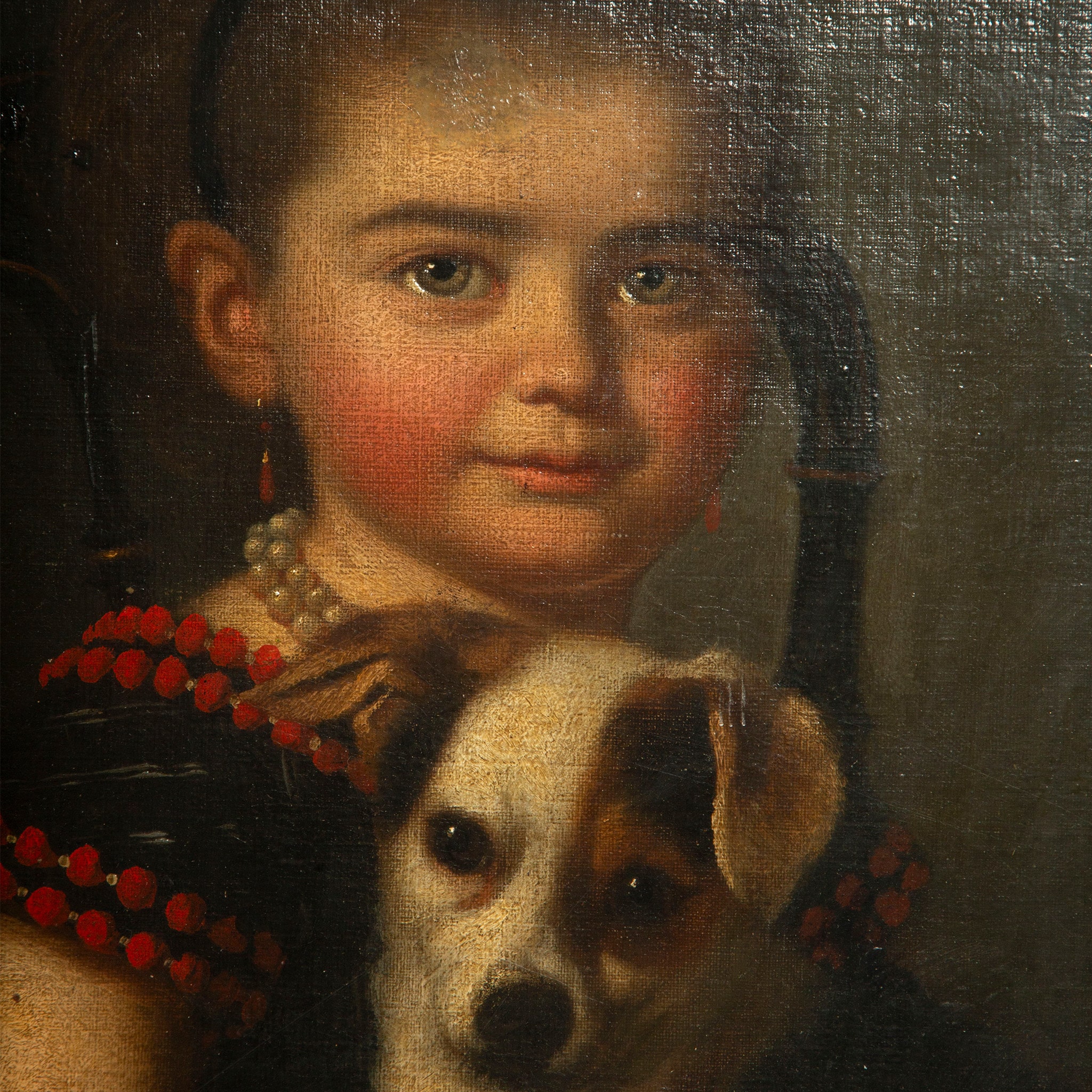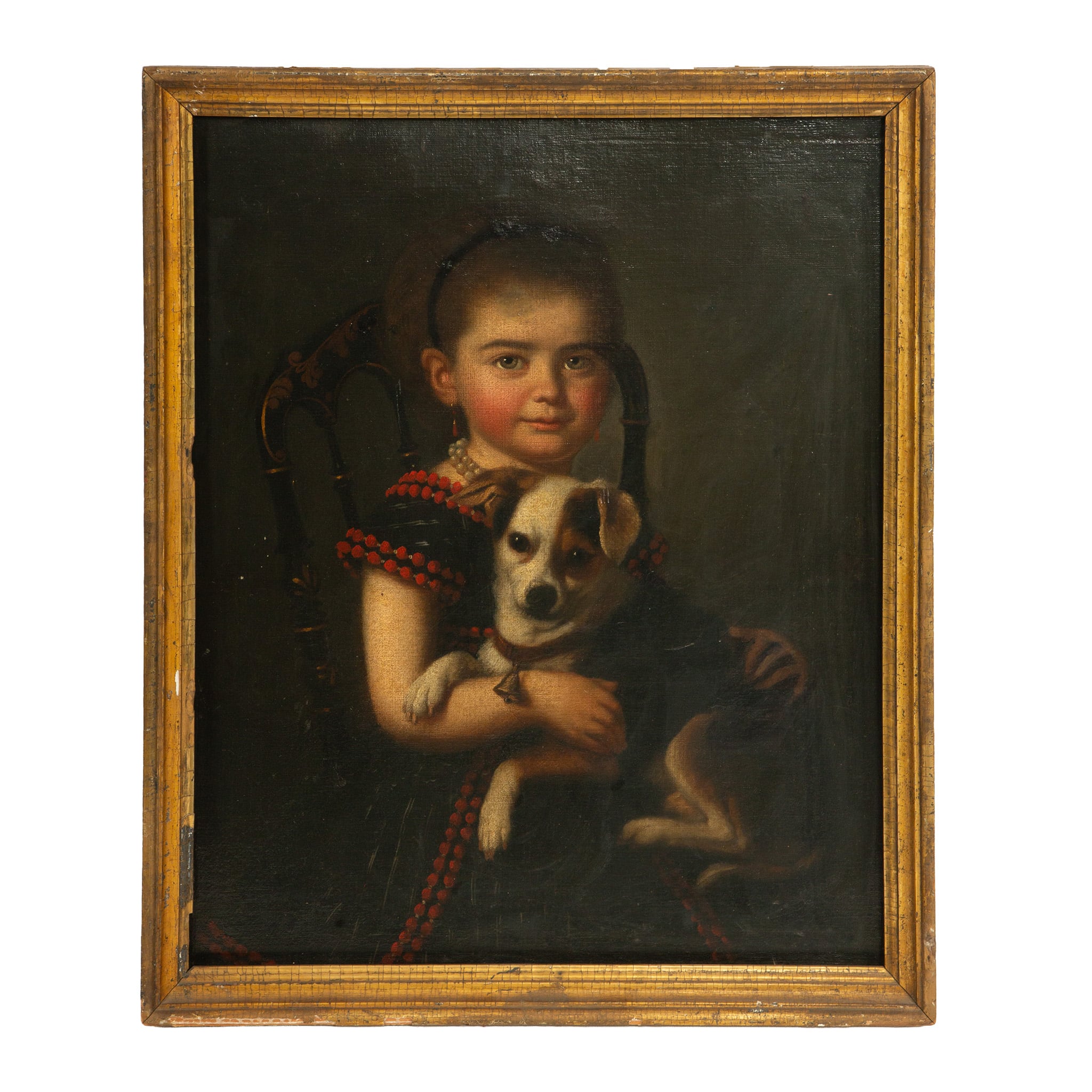 This charming 19th-century portrait depicts a young girl seated and tenderly holding her small dog, a composition that reflects the period’s sentimental approach to childhood and domestic life. Rendered with soft modeling and a restrained palette, the painting emphasizes the sitter’s rosy complexion, calm expression, and intimate bond with her pet. Such portraits were popular among middle- and upper-class families, serving as both likenesses and symbols of innocence, affection, and familial comfort. The dark, unobtrusive background and careful attention to costume details suggest an academic hand, likely working within a Continental—possibly French or Central European—tradition.