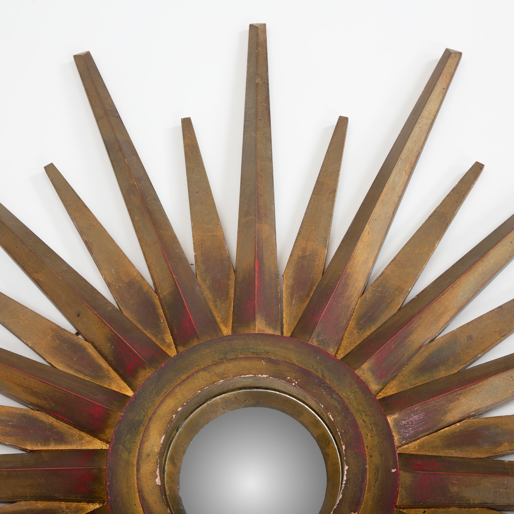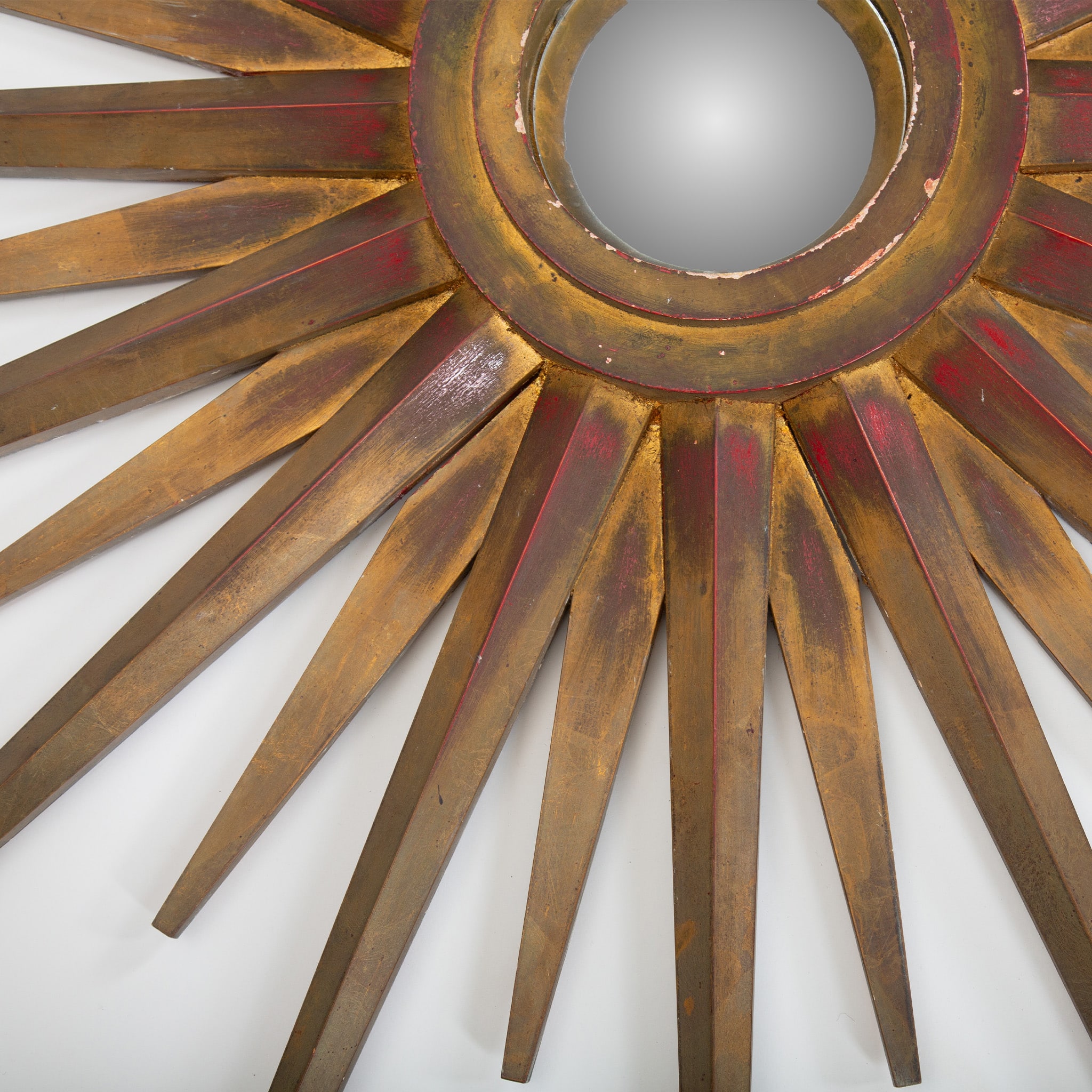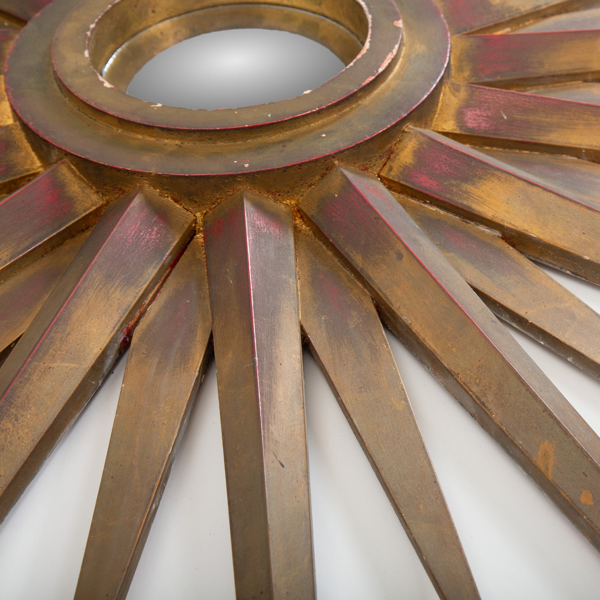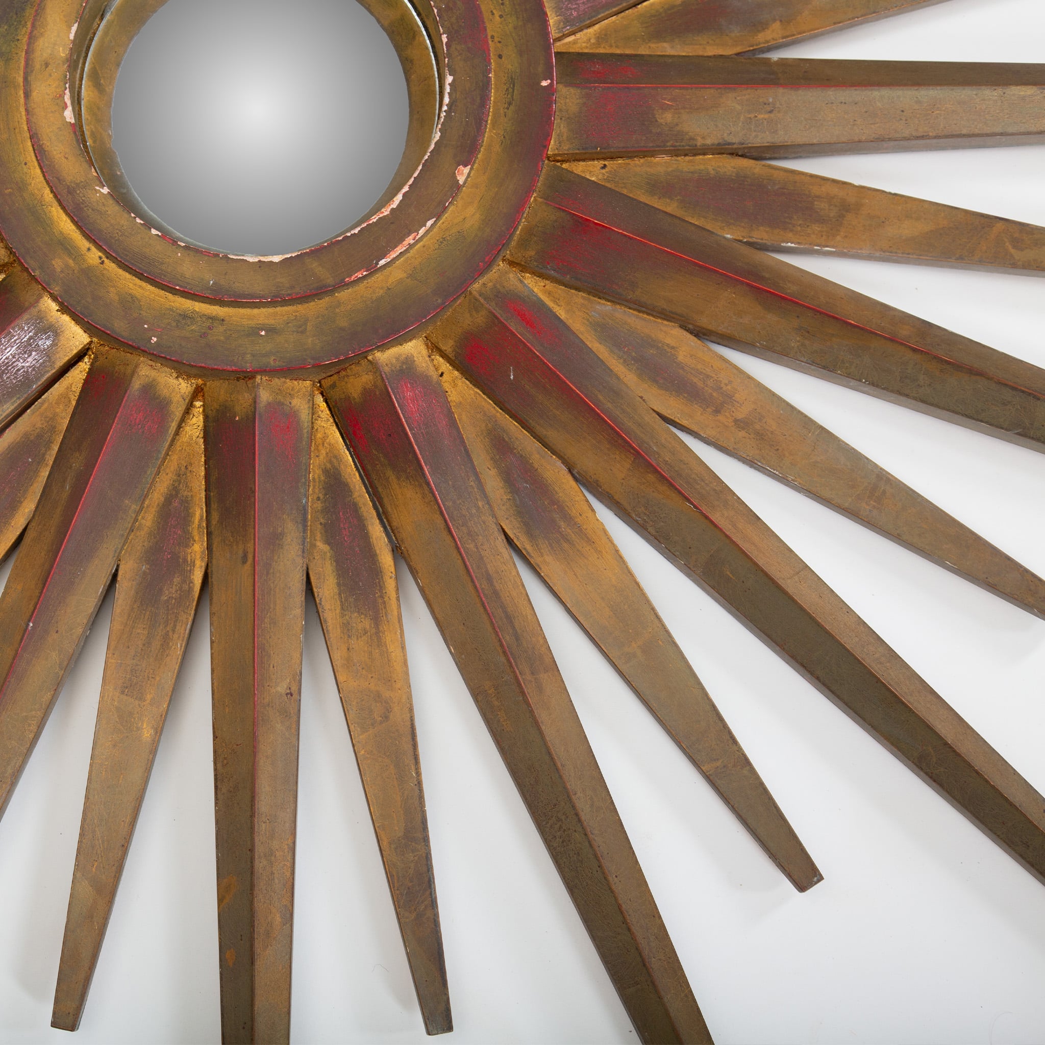 This striking mid-century starburst mirror exemplifies the exuberant decorative language of postwar European design. Radiating hand-cut wooden rays form a dramatic sunburst surround, finished in layered gilt tones with warm red undertones that add depth and visual richness. The central mirror is set within a molded circular frame, creating a sculptural focal point that reflects light beautifully from multiple angles.