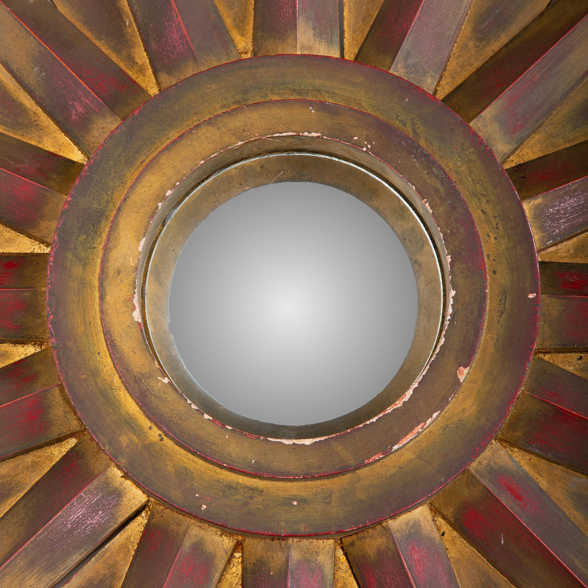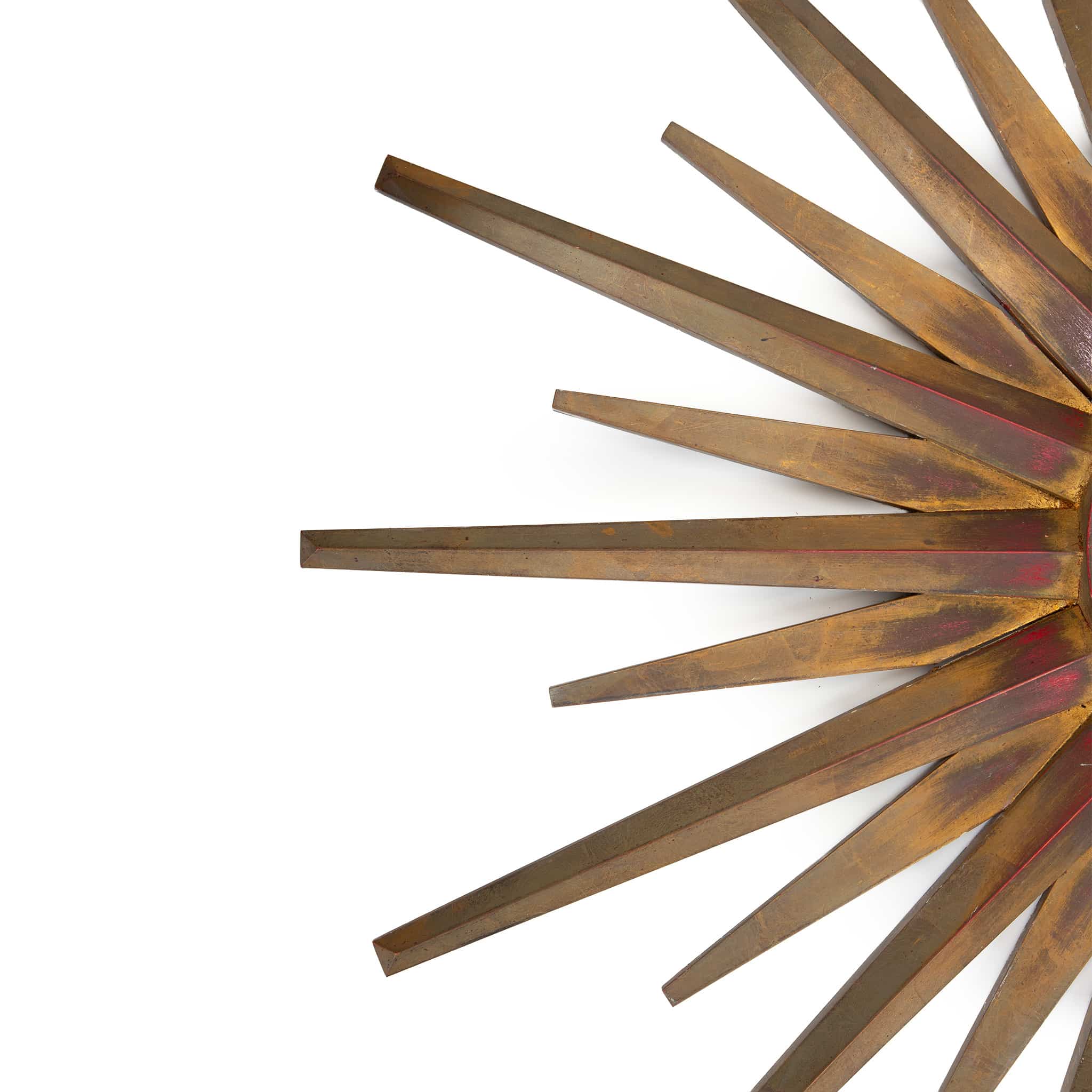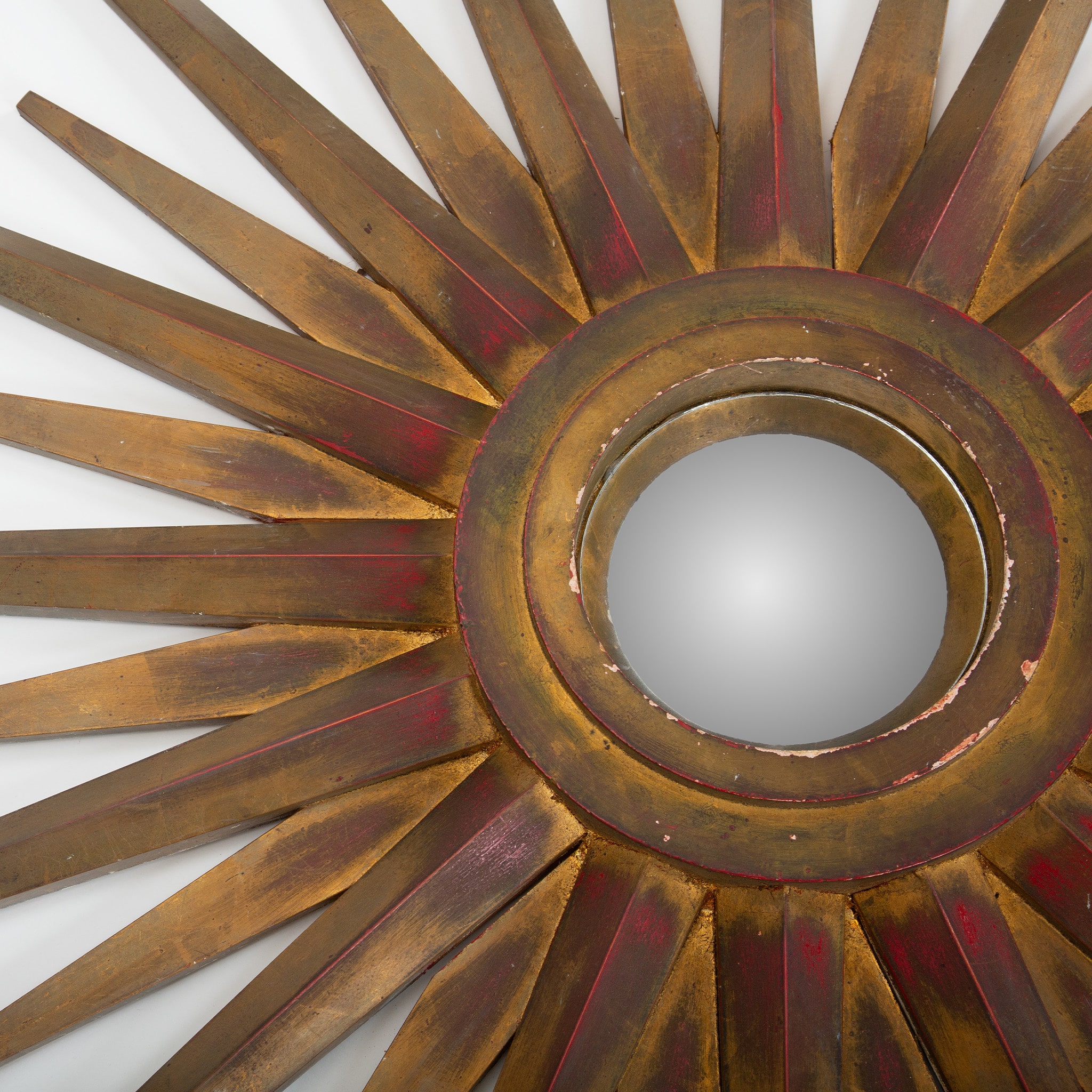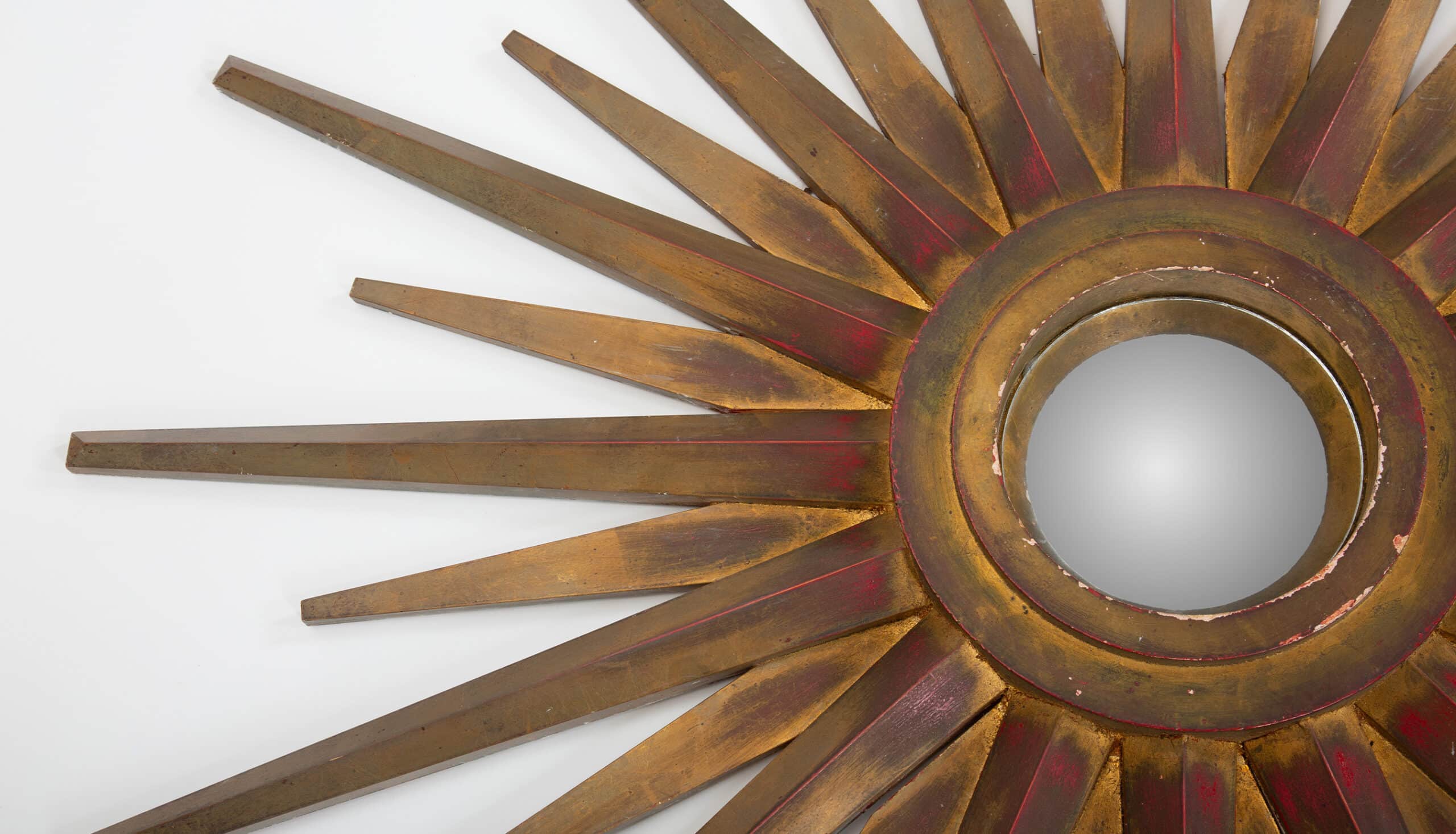 This striking mid-century starburst mirror exemplifies the exuberant decorative language of postwar European design. Radiating hand-cut wooden rays form a dramatic sunburst surround, finished in layered gilt tones with warm red undertones that add depth and visual richness. The central mirror is set within a molded circular frame, creating a sculptural focal point that reflects light beautifully from multiple angles.