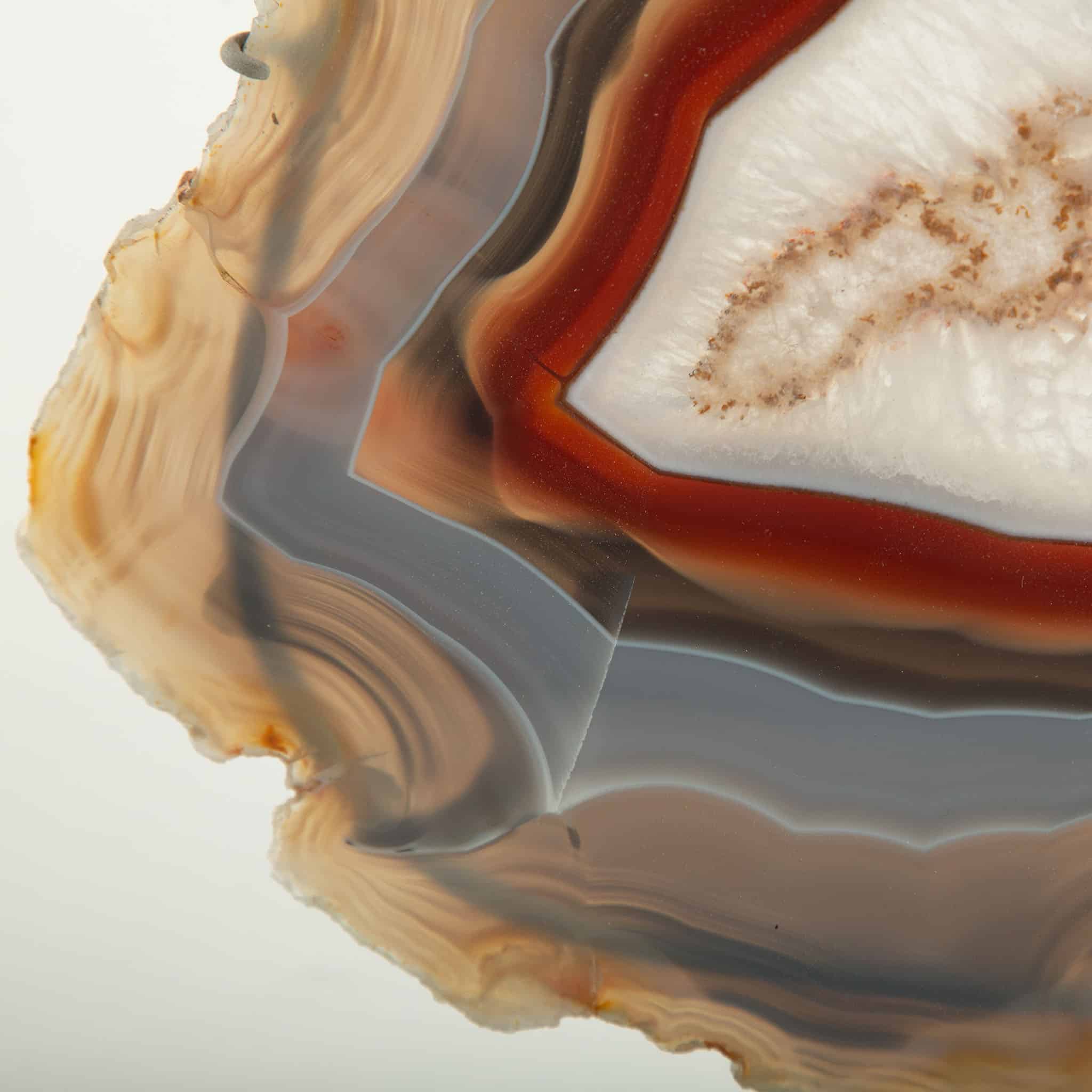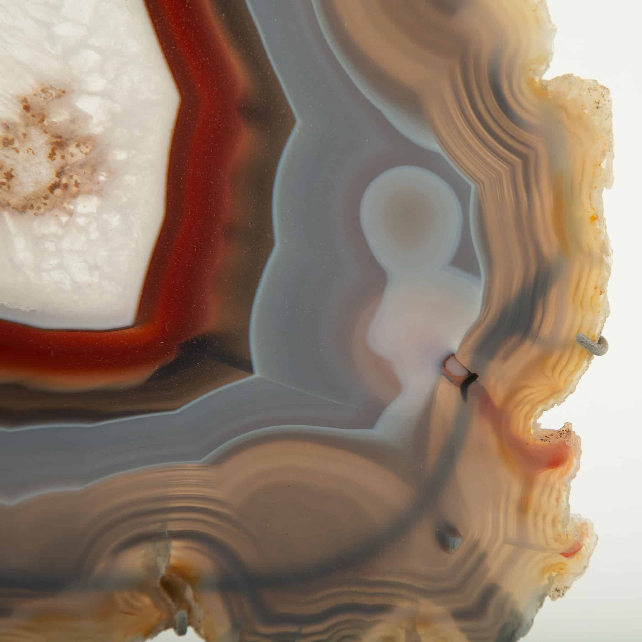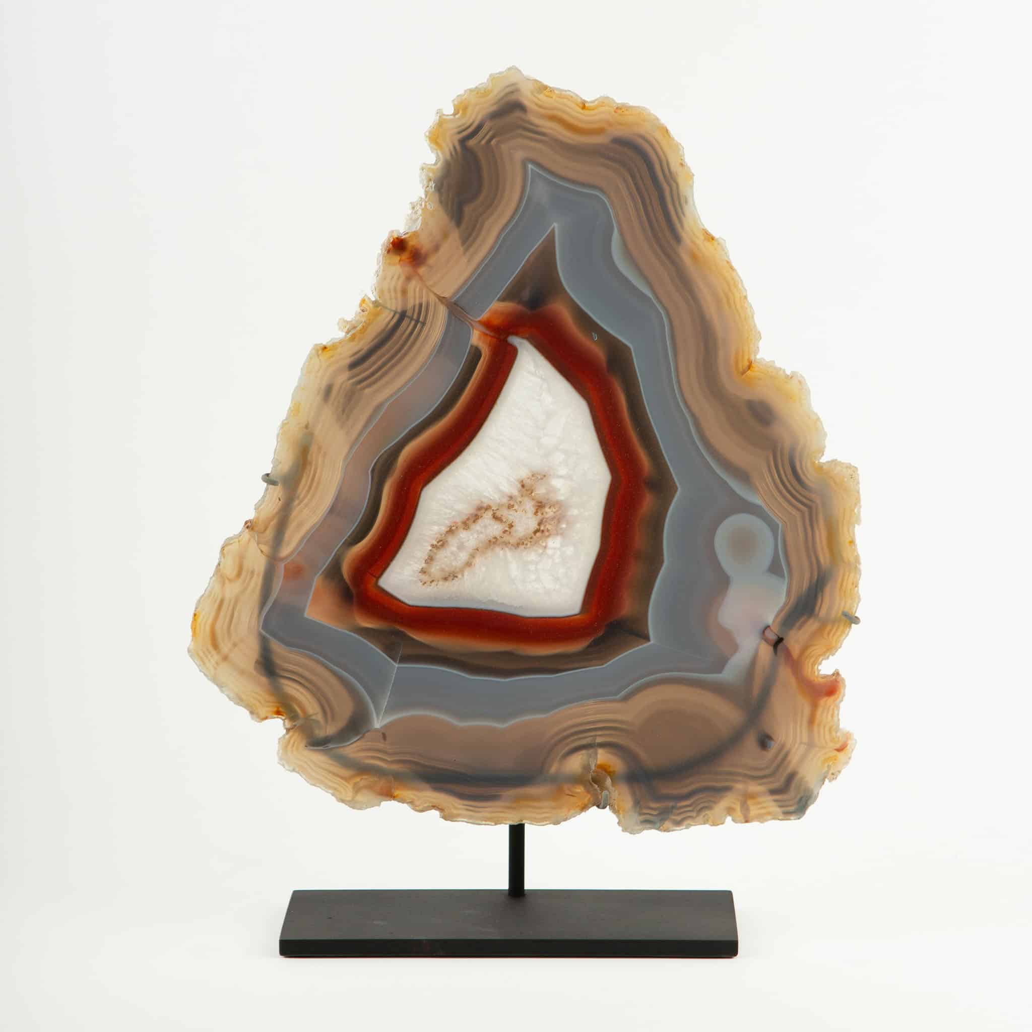 Mounted Agate Slice – A striking, polished agate slice featuring vibrant natural banding in shades of caramel, smoky grey, warm beige, and deep russet red, with a crystalline quartz center showcasing intricate mineral inclusions. The translucent layers reveal subtle variations in tone, enhanced by the stone’s organic, irregular edges. Presented on a minimalist black metal stand for stability and display, this specimen serves as both a decorative art piece and a natural geological wonder. Dimensions (including base): depth 3", width 10", height 13".