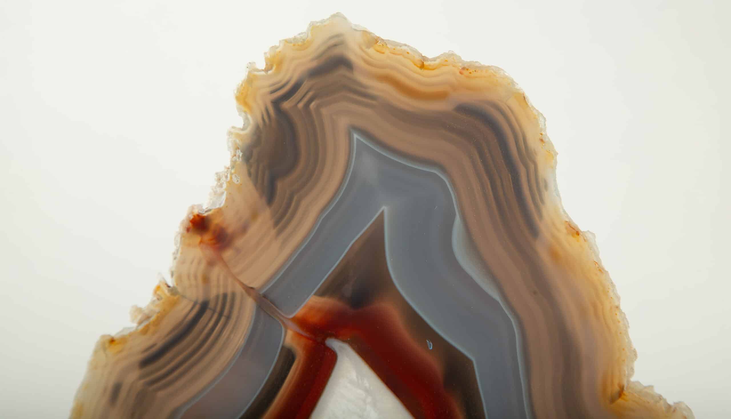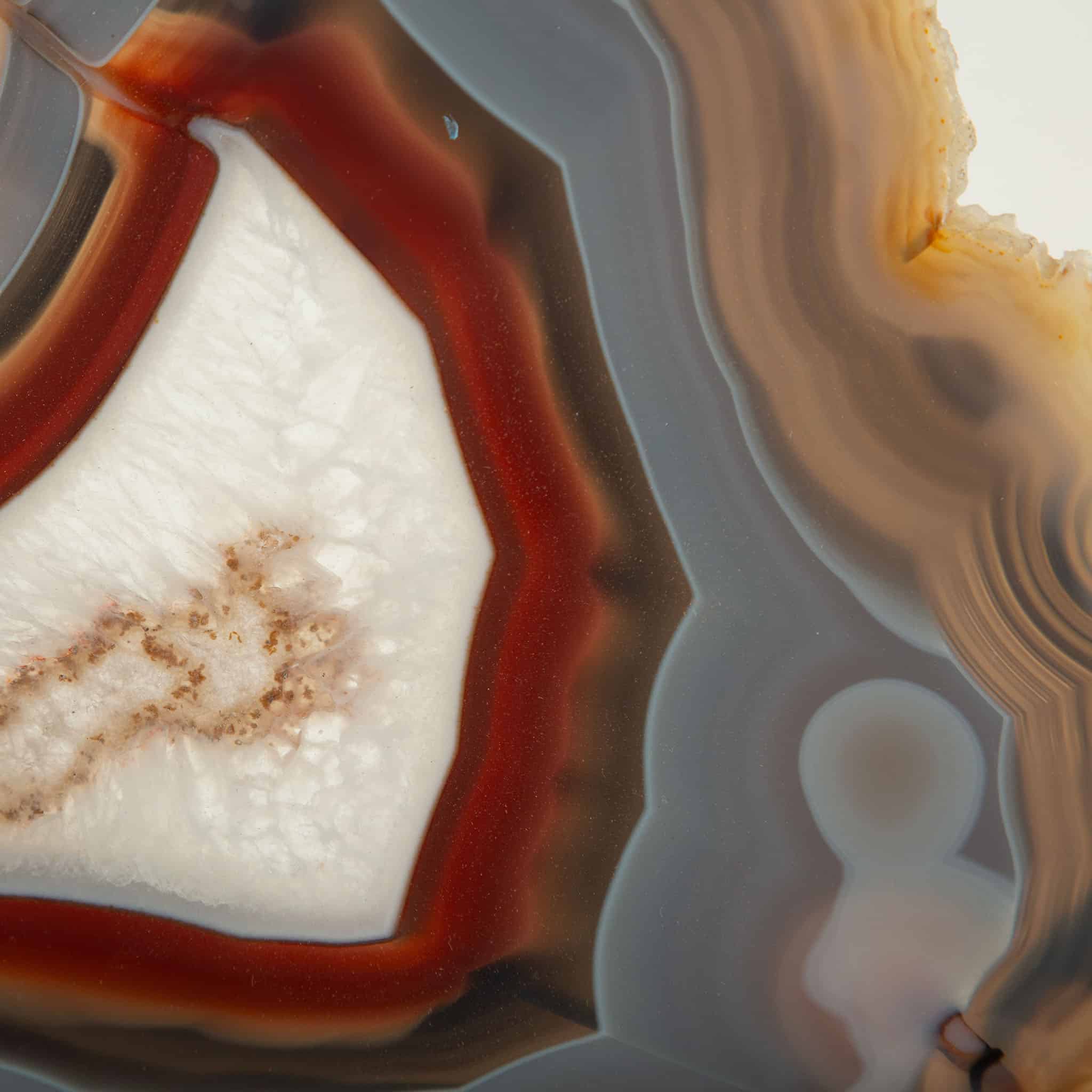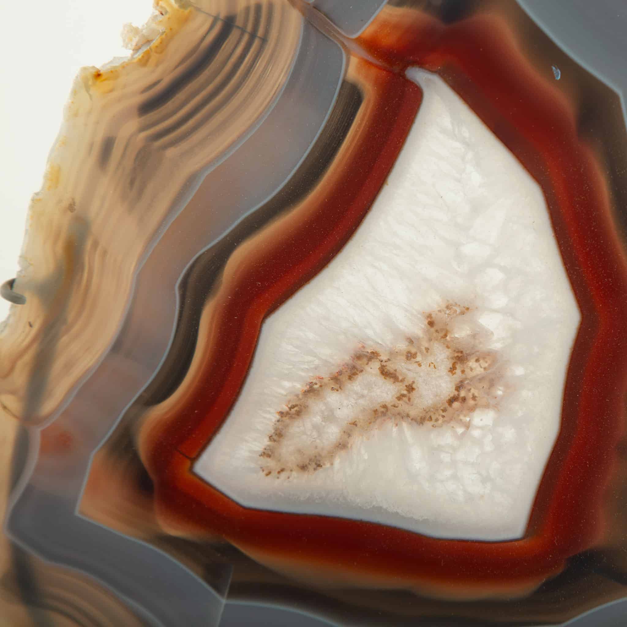 Mounted Agate Slice – A striking, polished agate slice featuring vibrant natural banding in shades of caramel, smoky grey, warm beige, and deep russet red, with a crystalline quartz center showcasing intricate mineral inclusions. The translucent layers reveal subtle variations in tone, enhanced by the stone’s organic, irregular edges. Presented on a minimalist black metal stand for stability and display, this specimen serves as both a decorative art piece and a natural geological wonder. Dimensions (including base): depth 3", width 10", height 13".