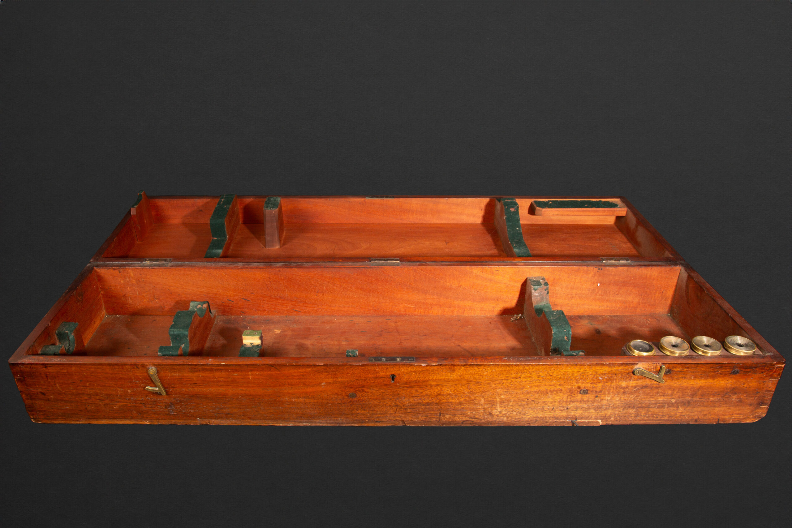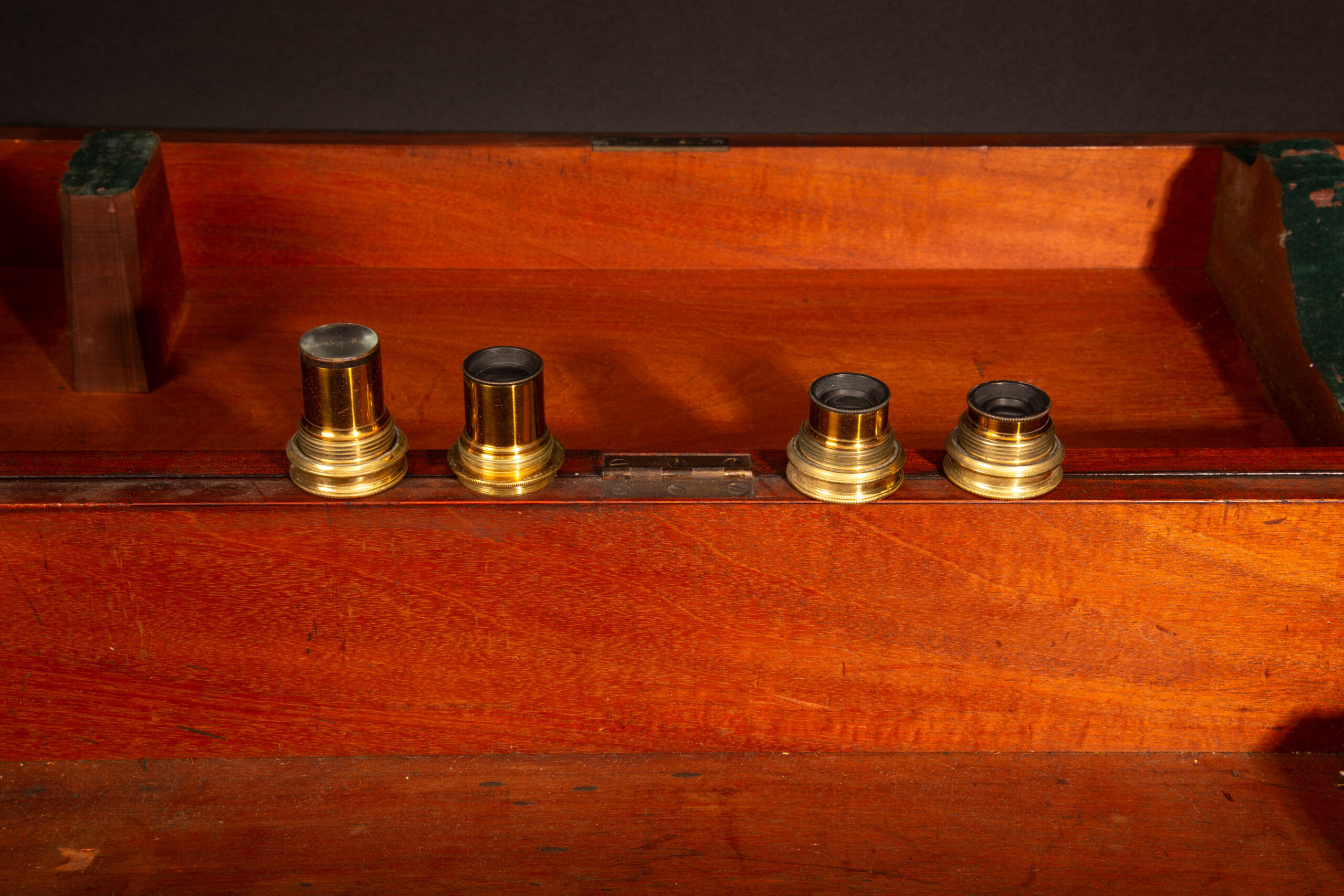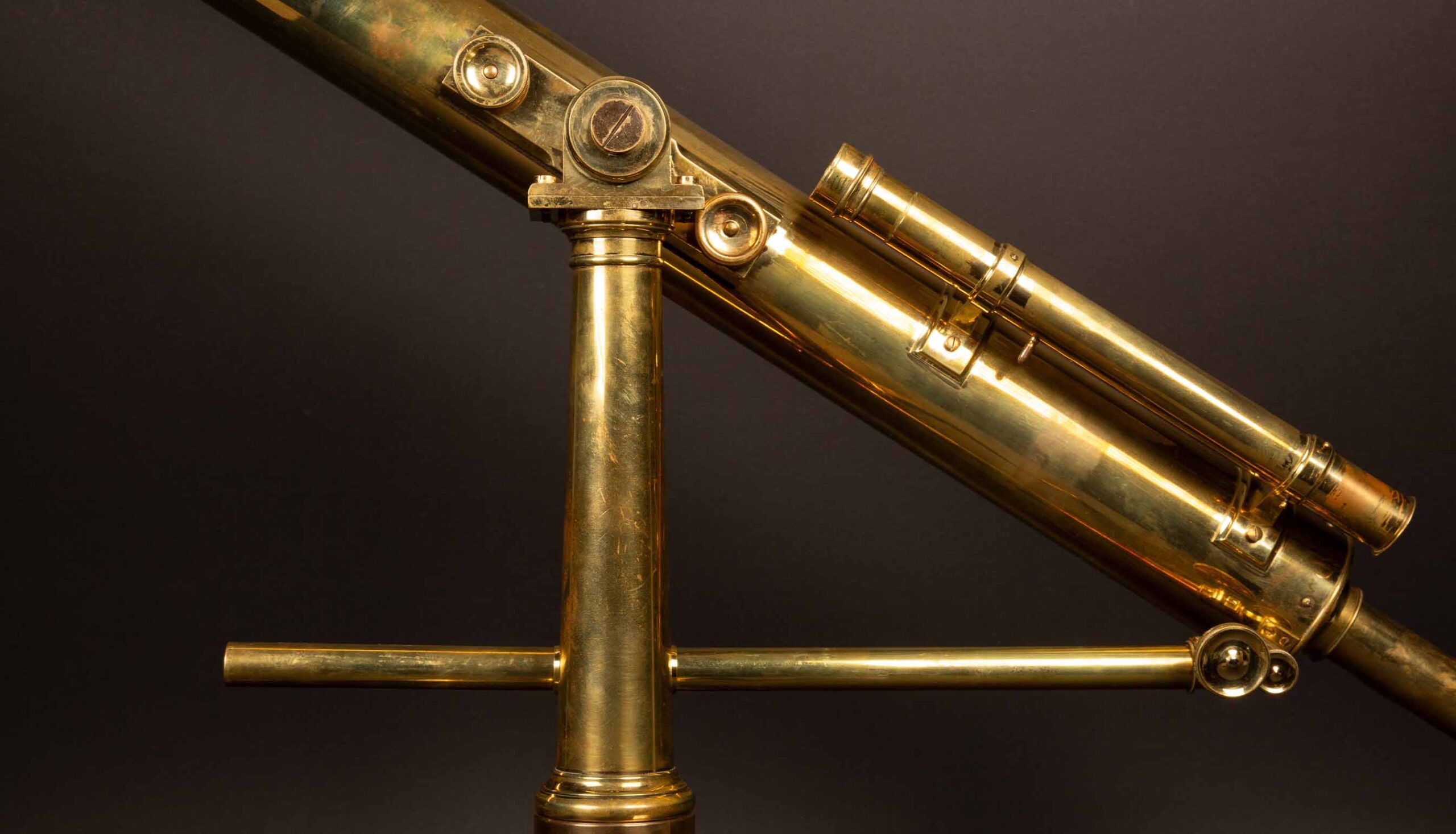 Mid-19th Century Brass Telescope with Original Wood Case and Lenses. This exquisite telescope, mounted on a sturdy tripod base, features brass tubes and a sighting scope. The craftsmanship is evident in the detailed brass construction, showcasing the meticulous work of the period. The telescope is signed on the barrel by Hammersley Bros., a renowned maker of scientific instruments during the 19th century. Accompanying the telescope is its original wood case, designed to protect and house the instrument along with its lenses. This piece is not only a functional scientific tool but also a beautiful example of historical craftsmanship.