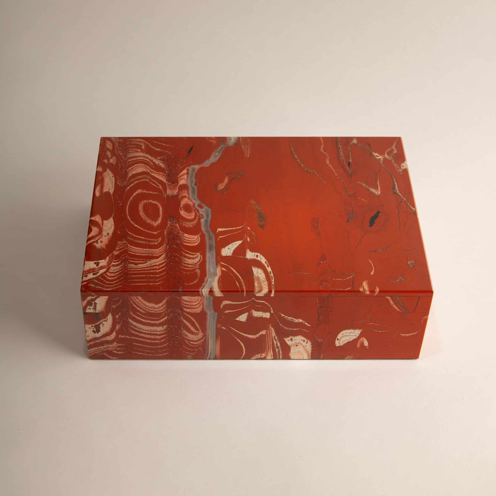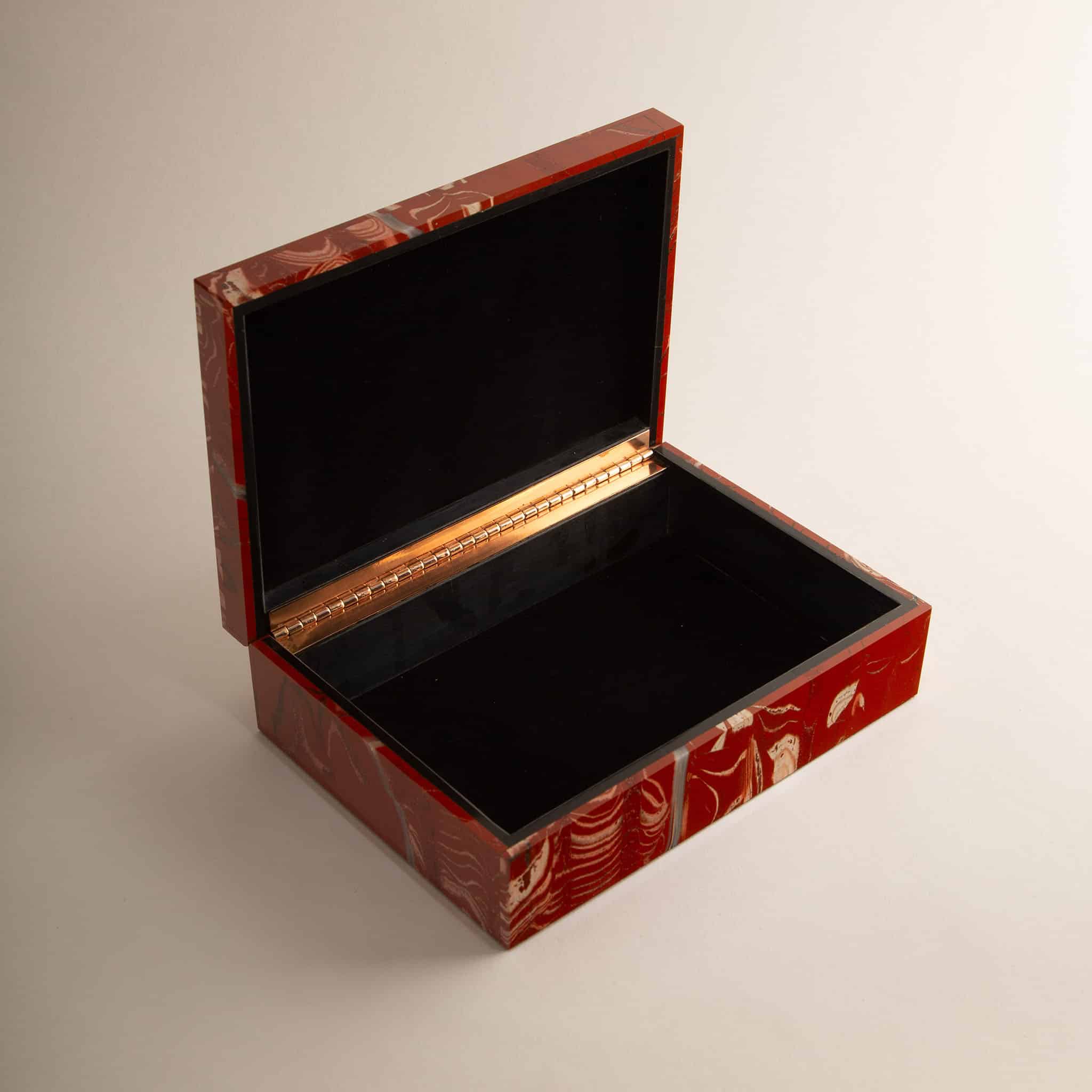 Exquisite handcrafted red jasper box, measuring 8" x 6", featuring striking natural banding and patterns in deep red, cream, and earthy tones. Expertly made in India, this polished stone box has a hinged lid and is lined with a black velvet interior, making it both a functional storage piece and a decorative display object that showcases the exceptional beauty of natural jasper.
