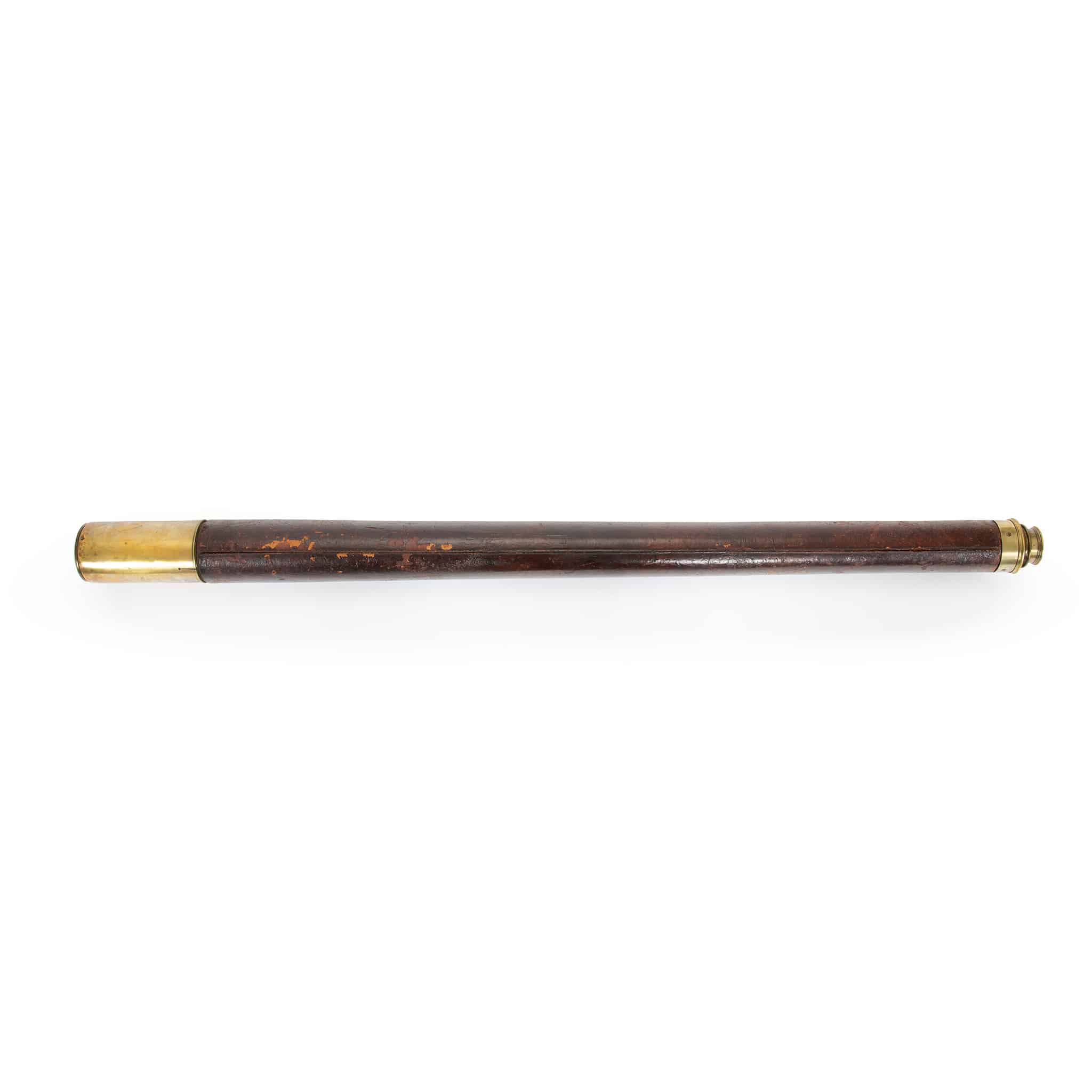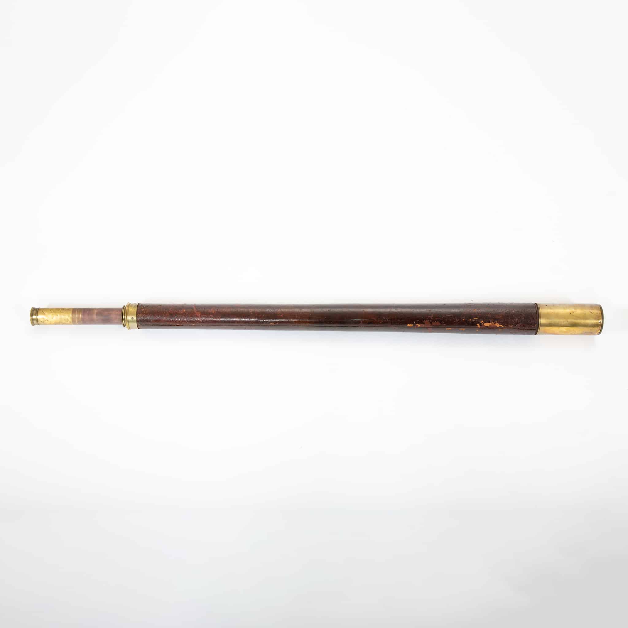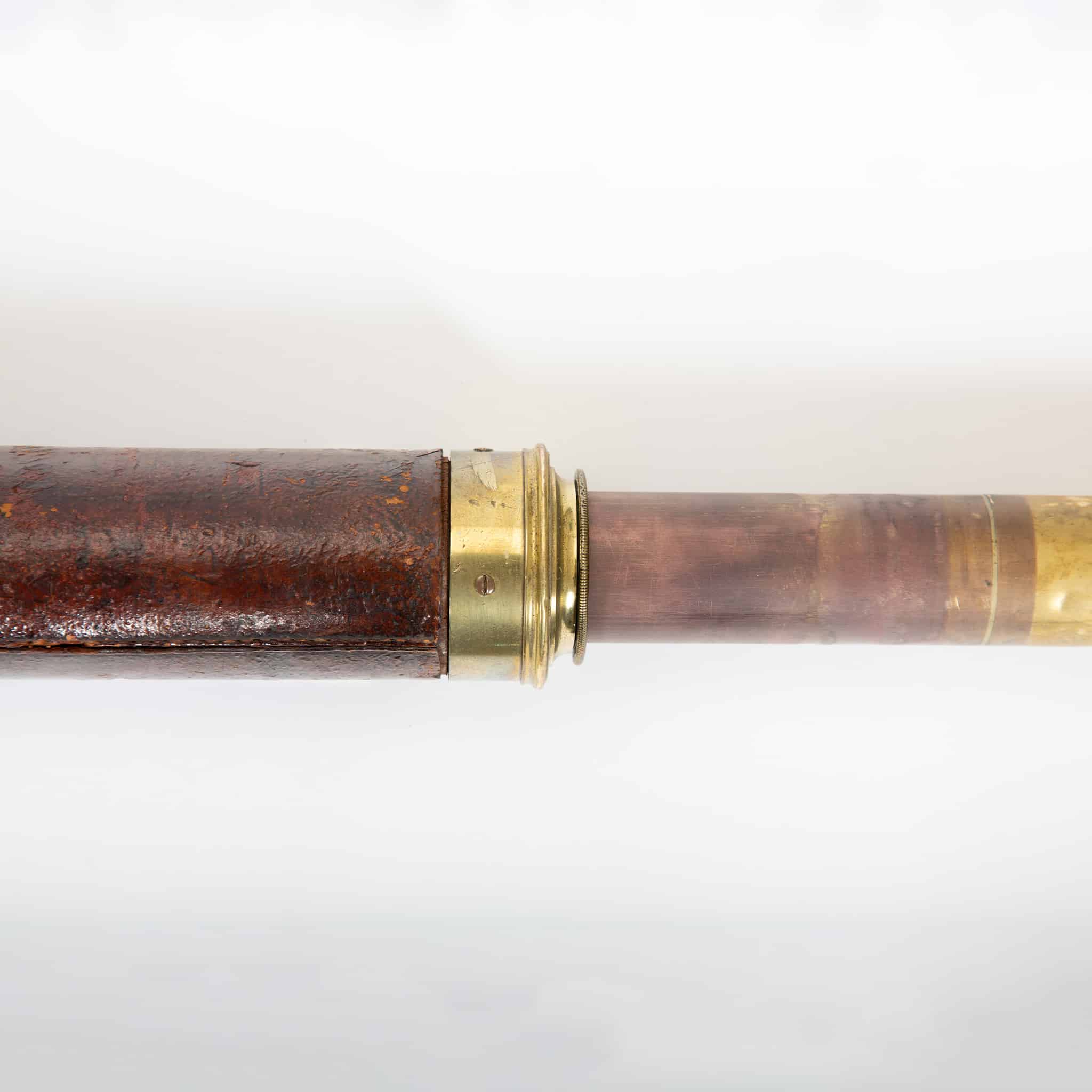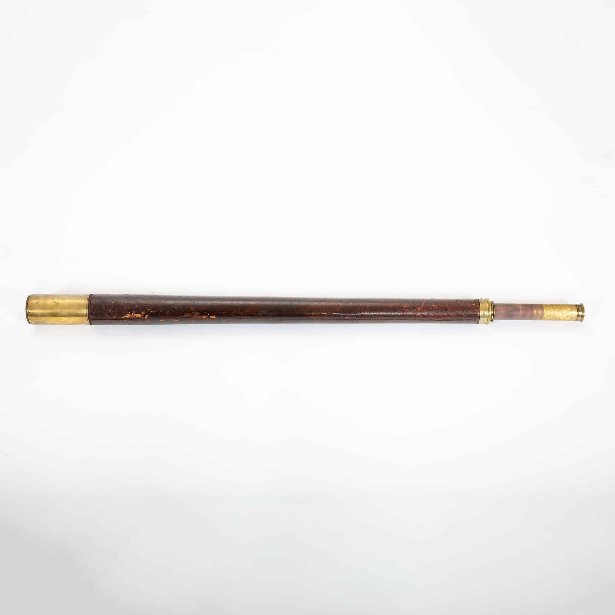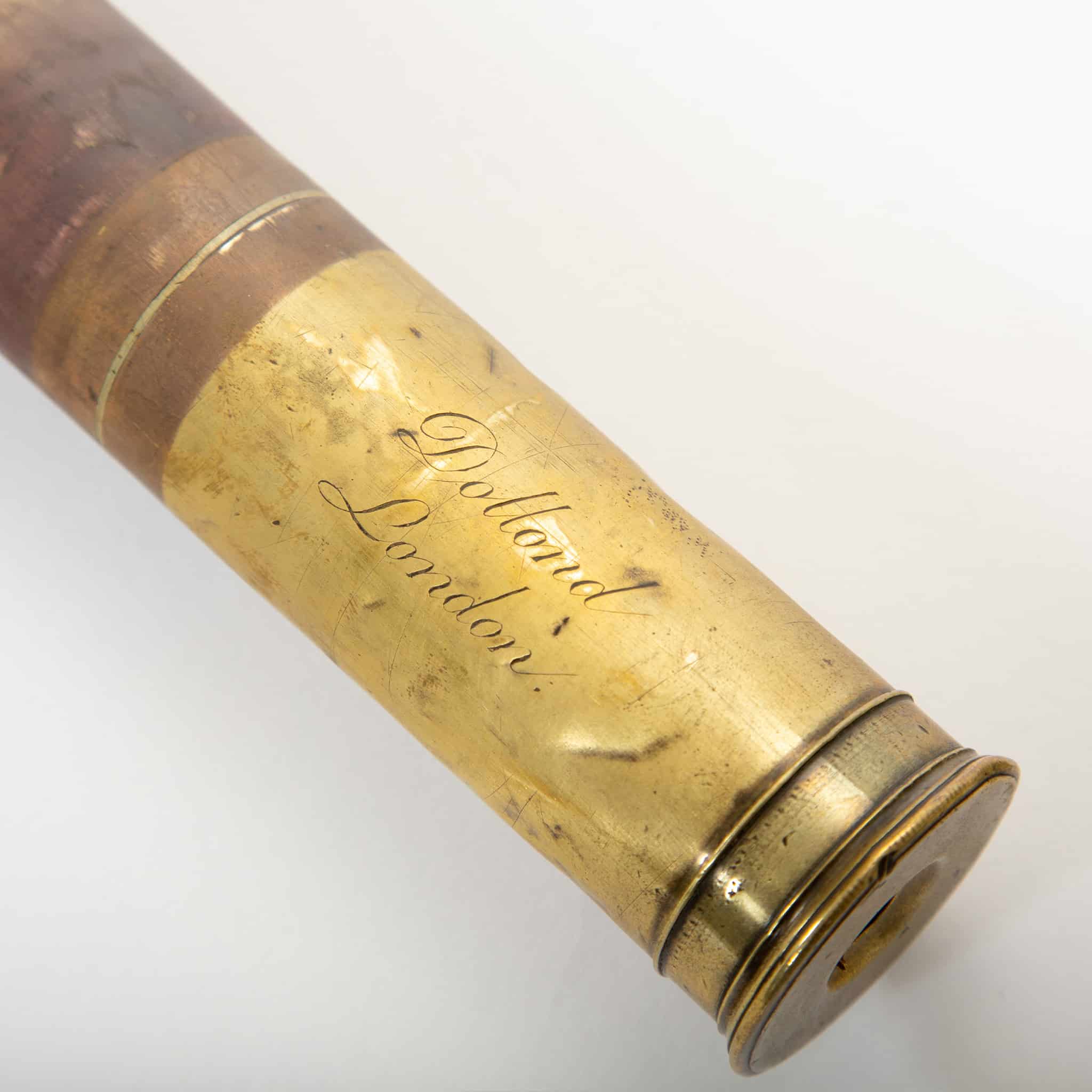 This finely made maritime spyglass was produced by the renowned London optical firm Dollond, one of the most respected makers of scientific and navigational instruments in the 18th and 19th centuries. Constructed with a brass draw tube and housed in its original stitched leather protective sleeve, the spyglass exemplifies the precision engineering and elegant restraint characteristic of British naval instruments of the period.