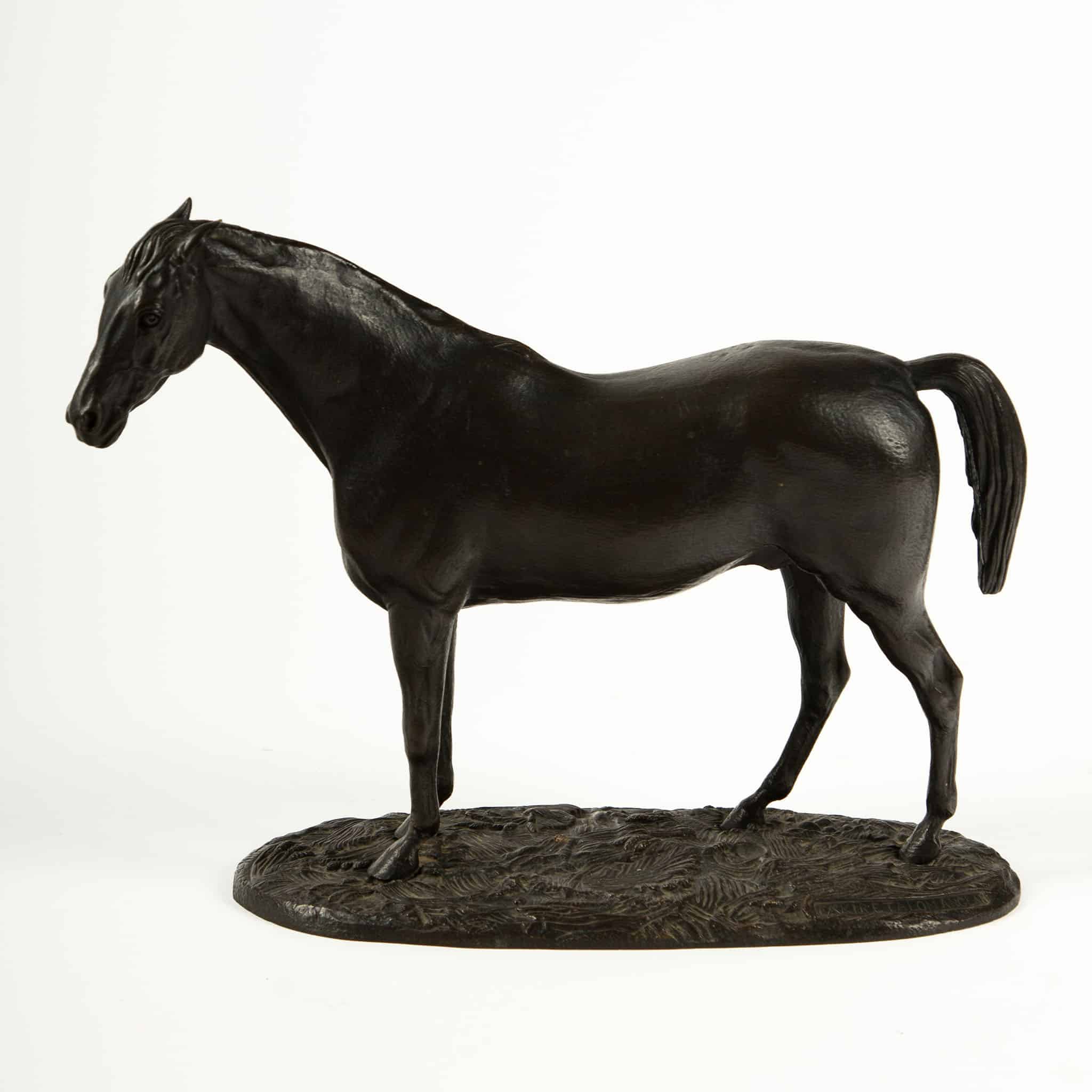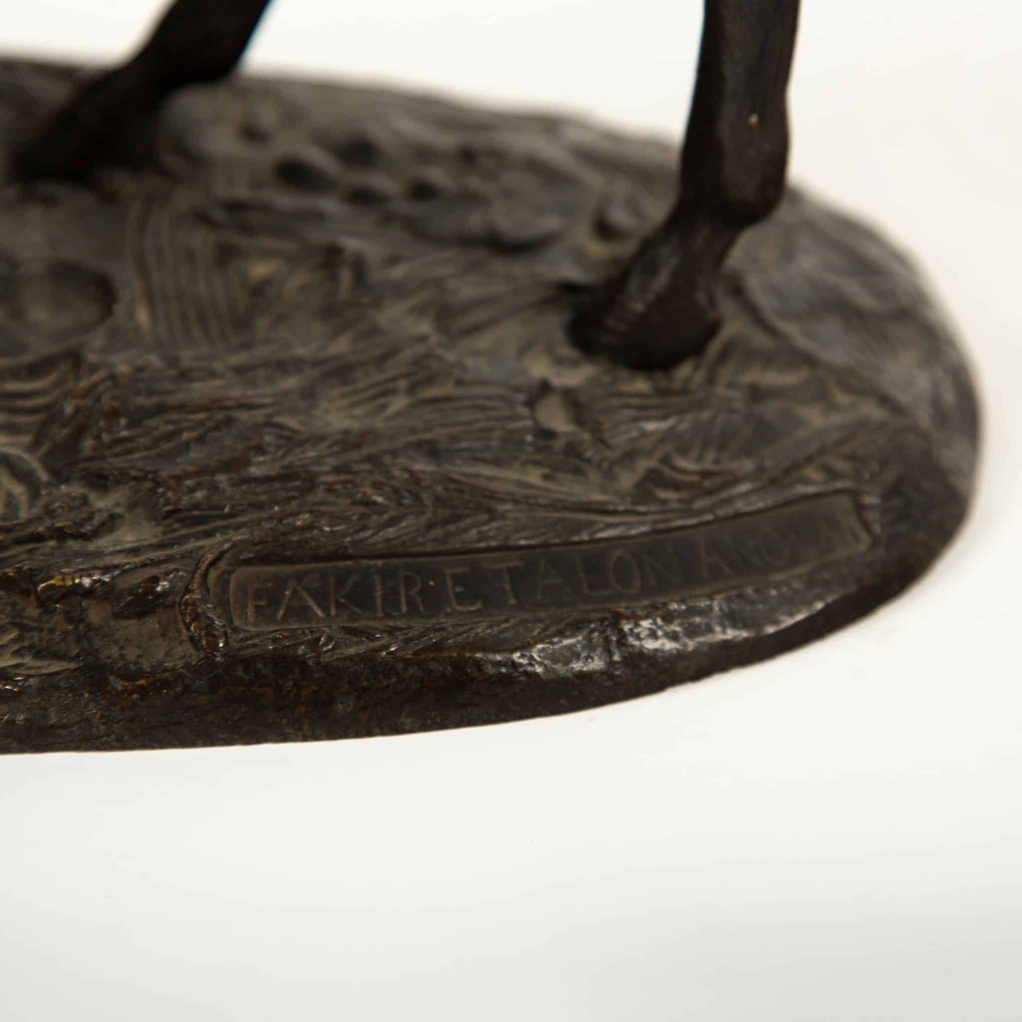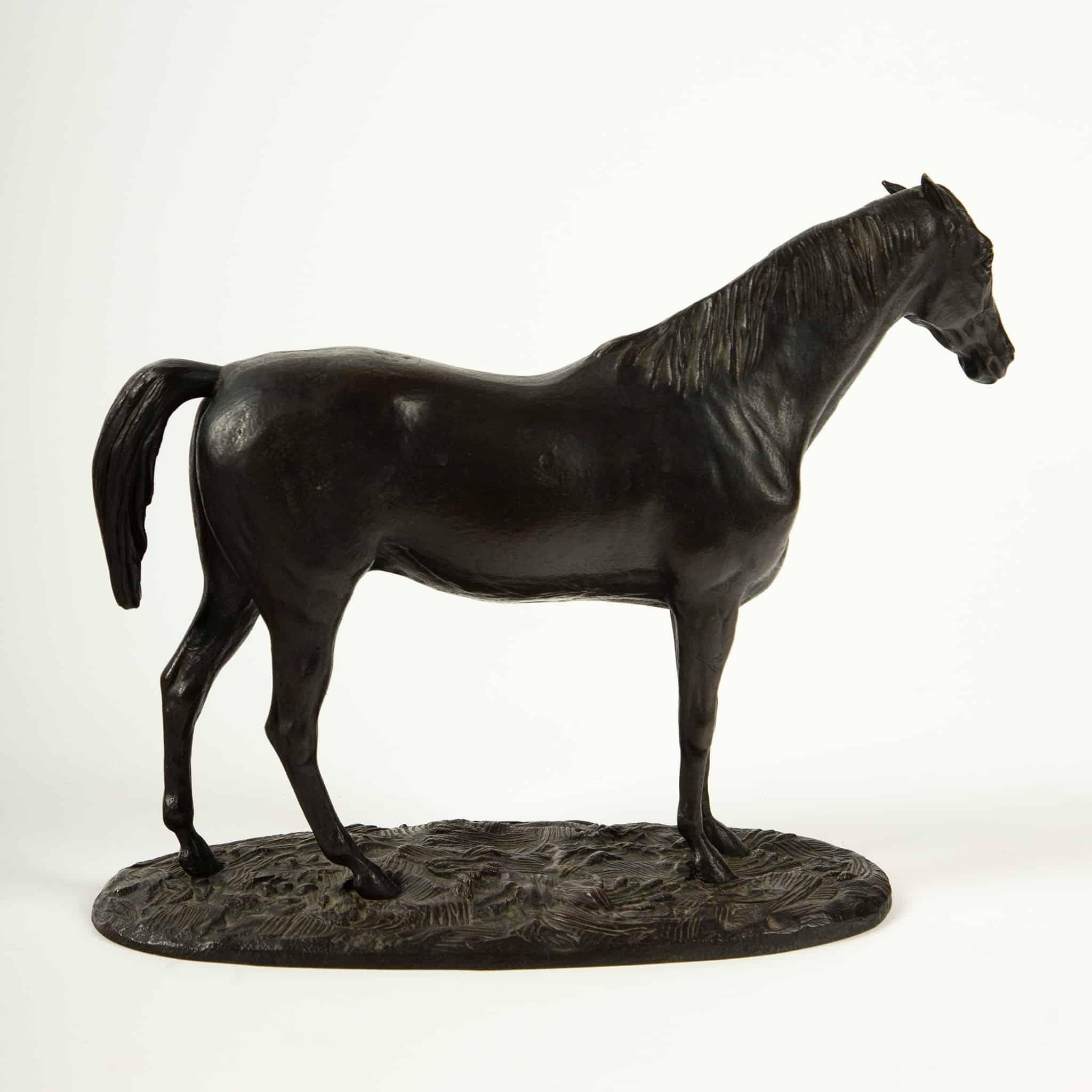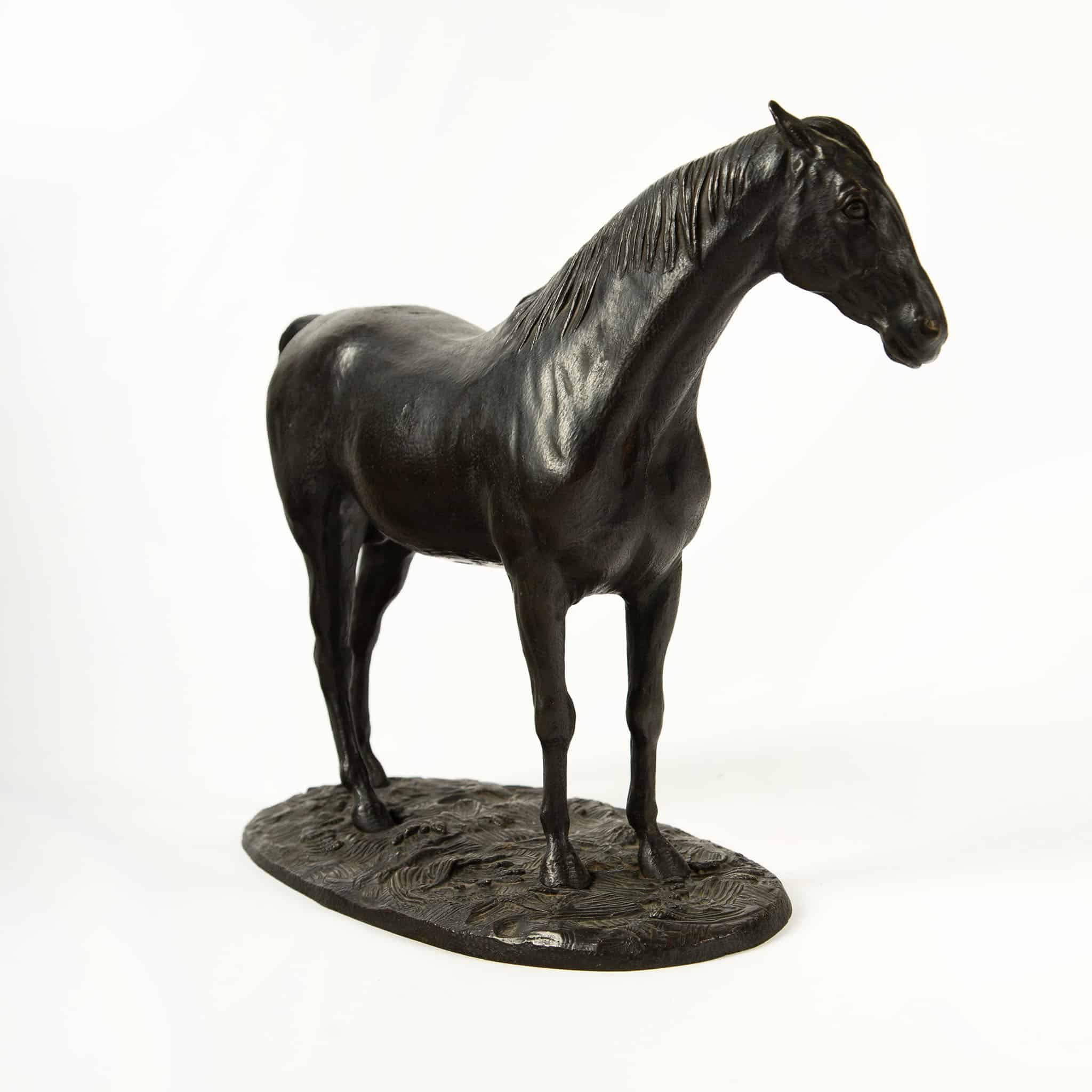 A finely modelled bronze of a poised Thoroughbred titled Fakir étalon anglais on the integral oval base, its surface chased with ferns and grasses that anchor the horse in a naturalistic setting. The stallion stands square, head slightly lowered, every vein and muscle crisply rendered beneath a rich, chocolate-brown patina that shows subtle coppery highlights on the high points. Cast in the Animalier tradition, the piece reflects the early-1900s Parisian taste for racing and stud champions, yet remains unsigned—typical of small-atelier foundry work of the period. Excellent condition with only the faintest rubbing to the extremities; no dents, repairs, or losses. Dimensions: 16 ½ in W × 8 in D × 12 ¼ in H (approx. 42 × 20 × 31 cm). An elegant, true-to-life study that brings quiet power to desk, mantel, or vitrine.