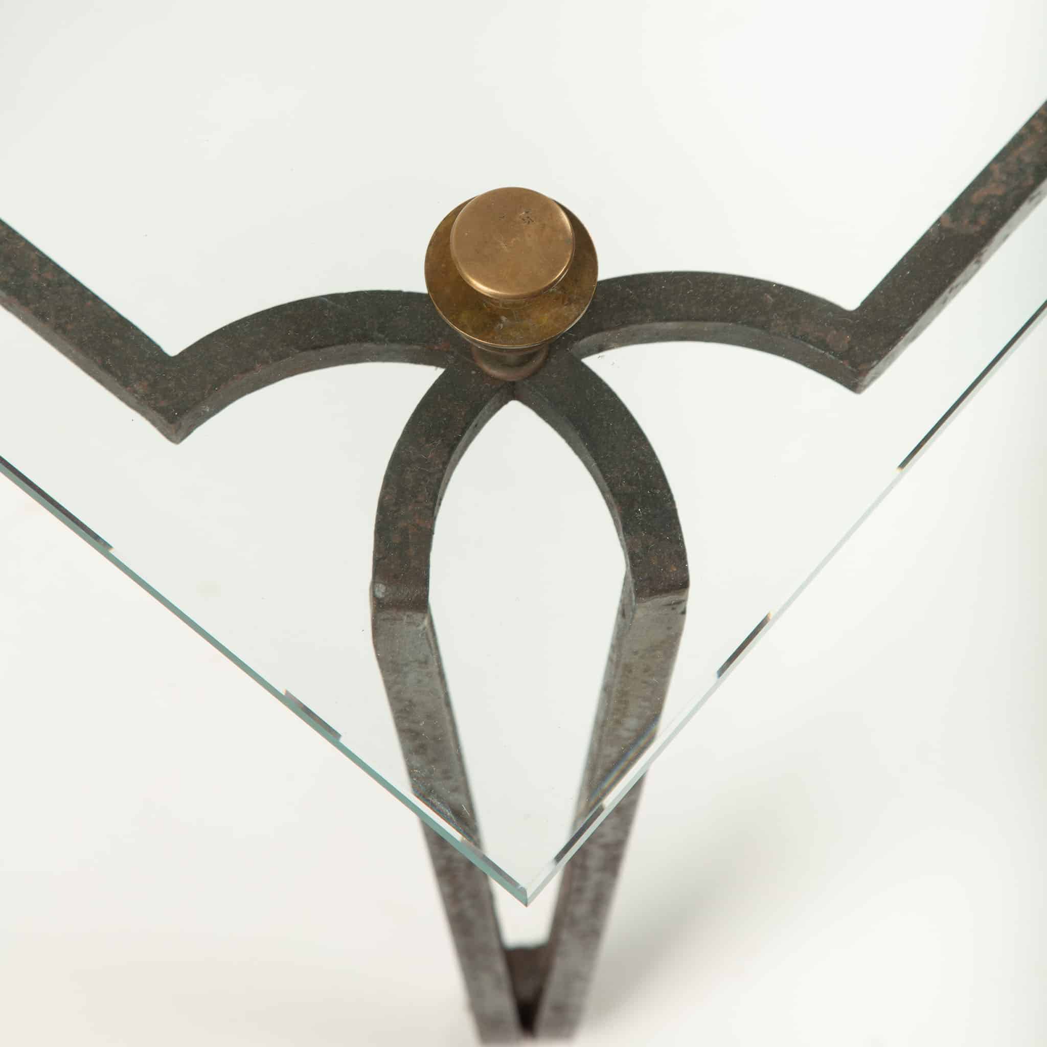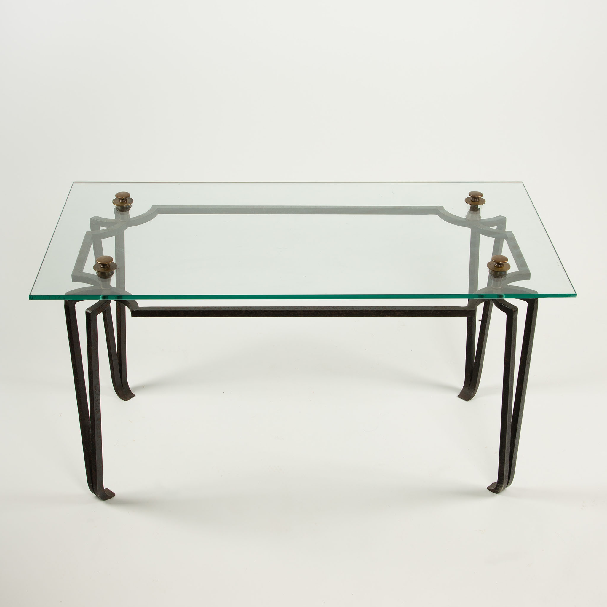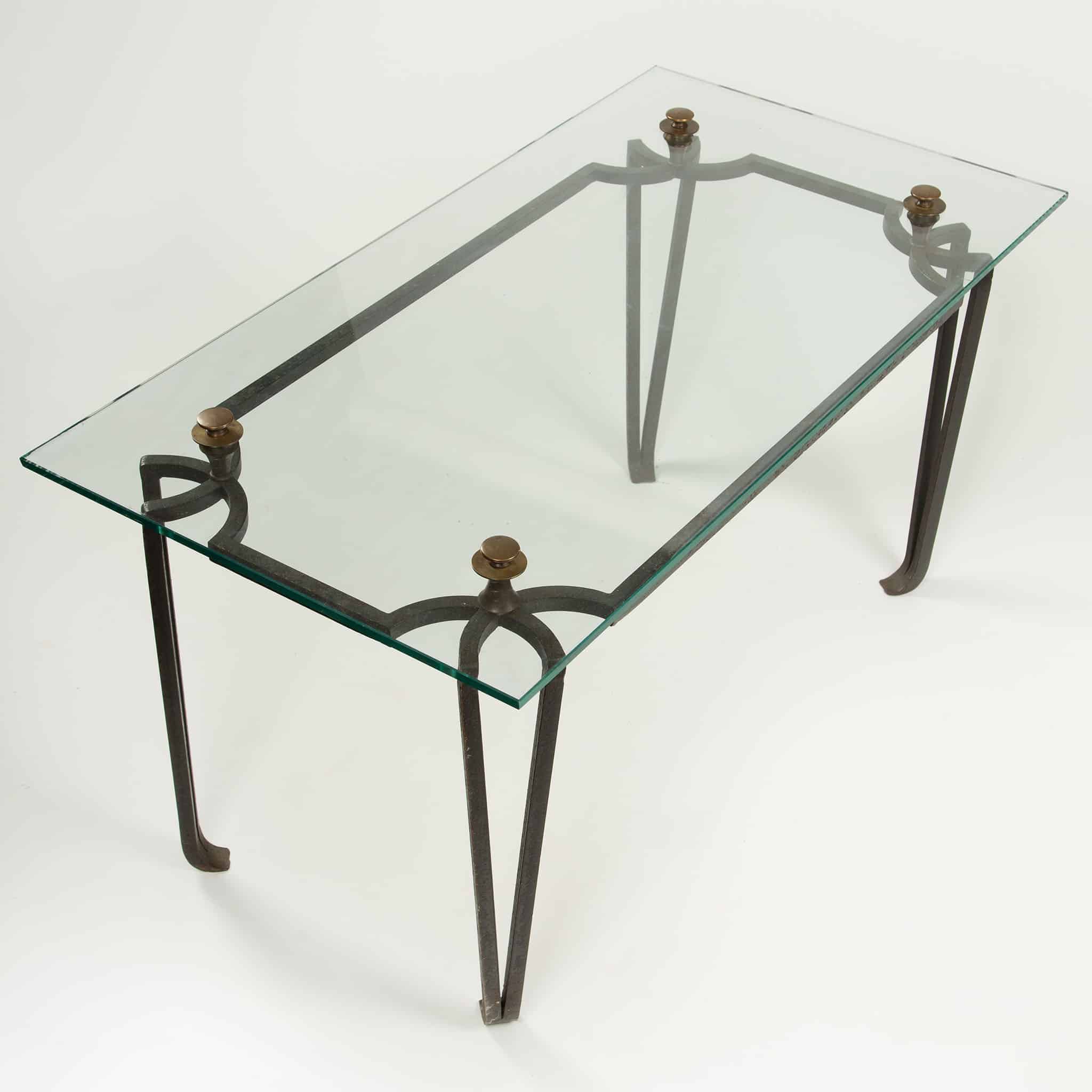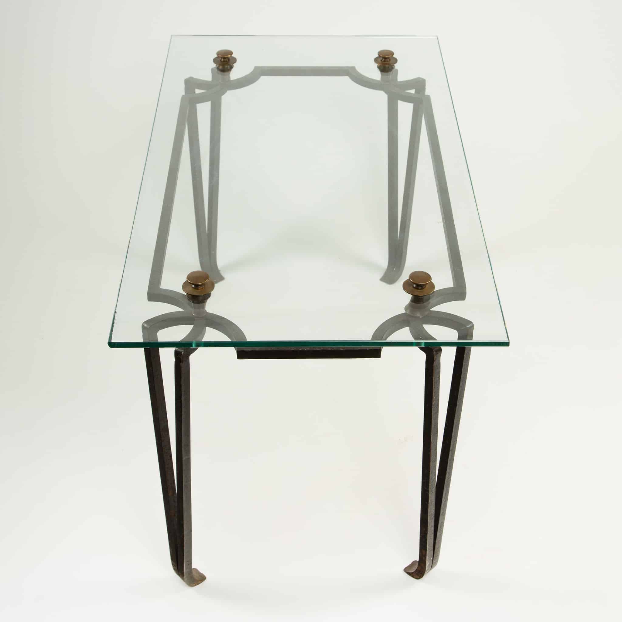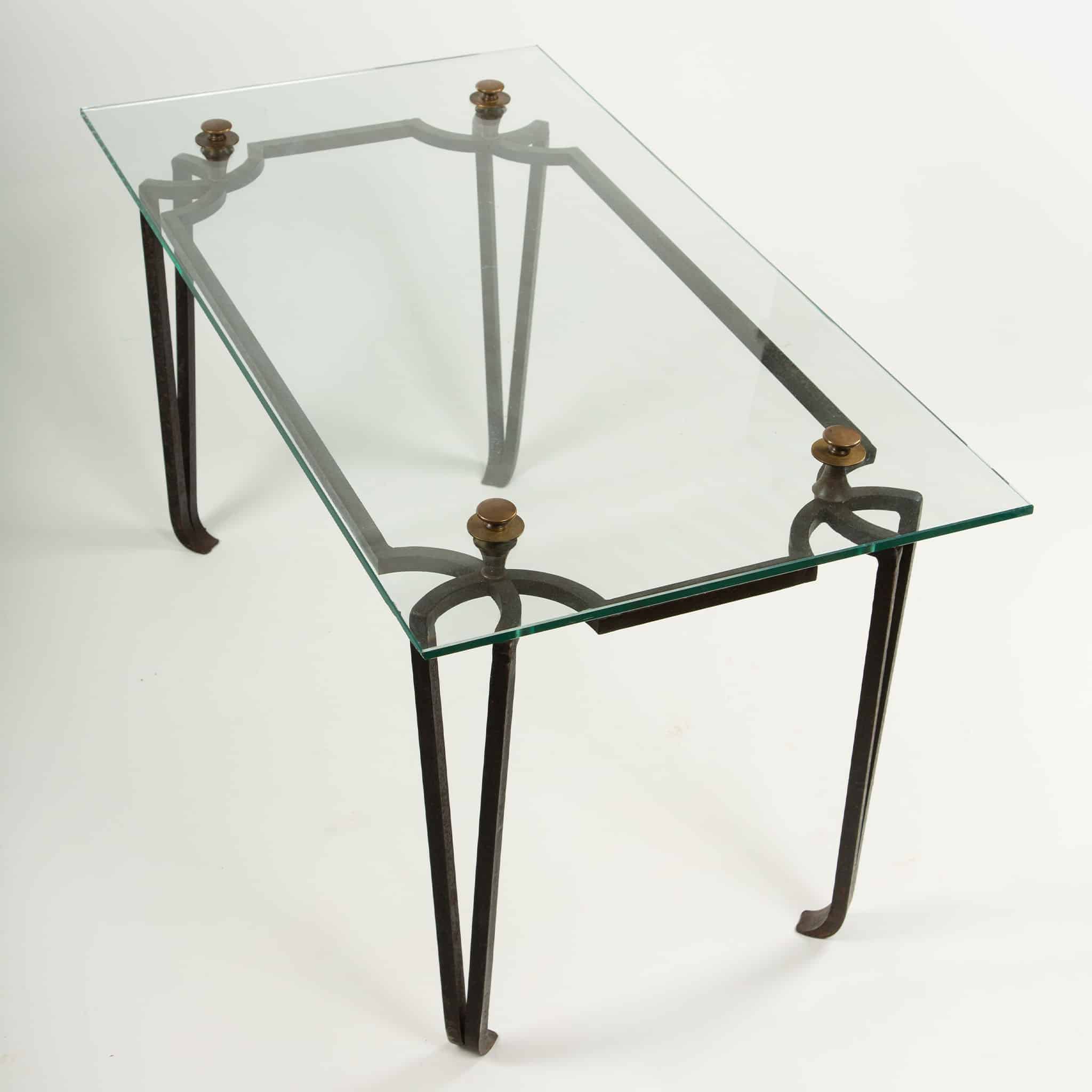 A finely crafted 20th-century coffee table featuring a rectangular glass top supported by a wrought iron base with elegant geometric and scroll-form details. The corners are secured with patinated bronze finials, lending both strength and decorative refinement to the design. The glass top is thick and inset with precision, enhancing the table’s modernist yet artisanal character. The combination of hand-forged iron and bronze details reflects the influence of French Art Deco and modernist designers such as Gilbert Poillerat or Jacques Adnet, who were known for integrating metalwork with clean-lined functionality.