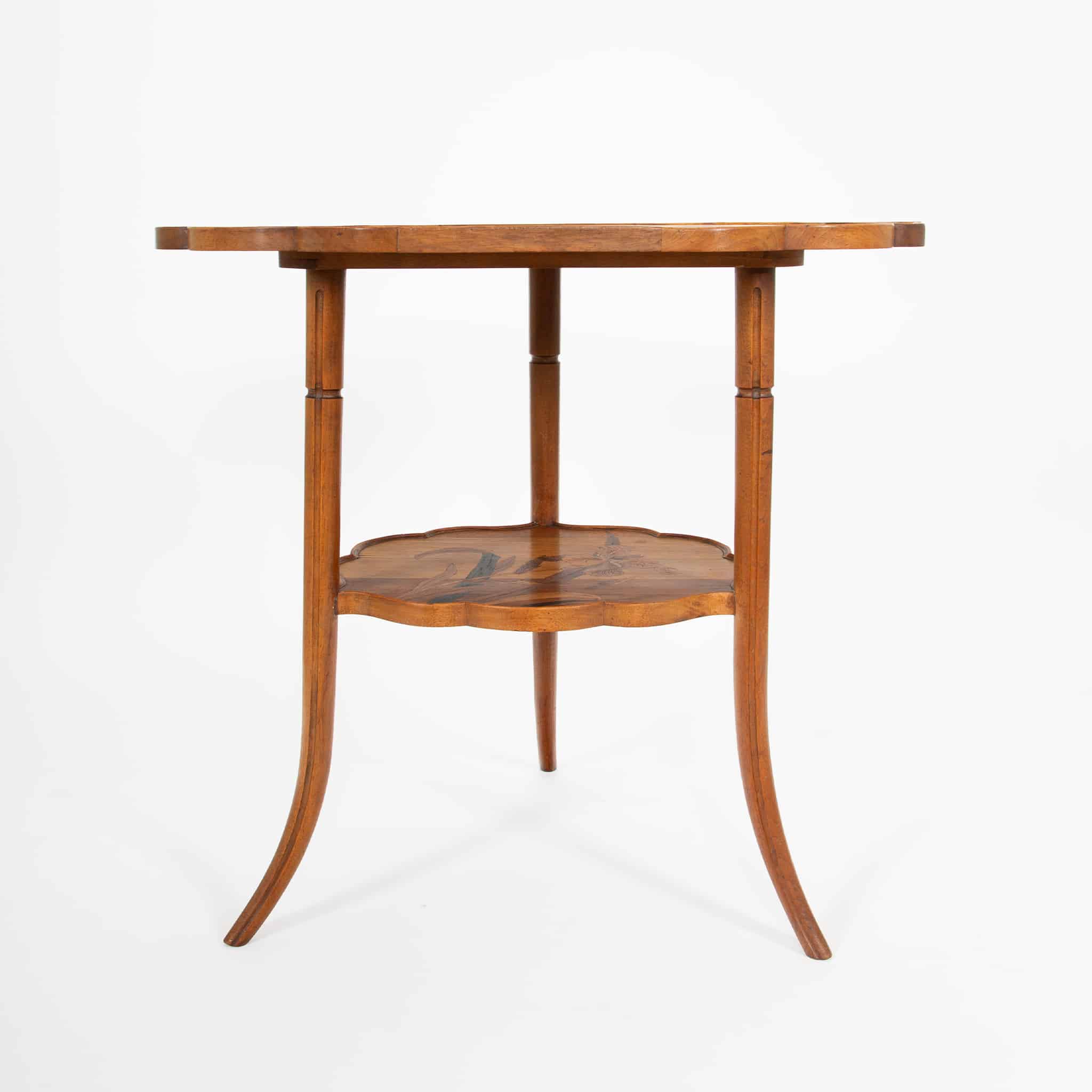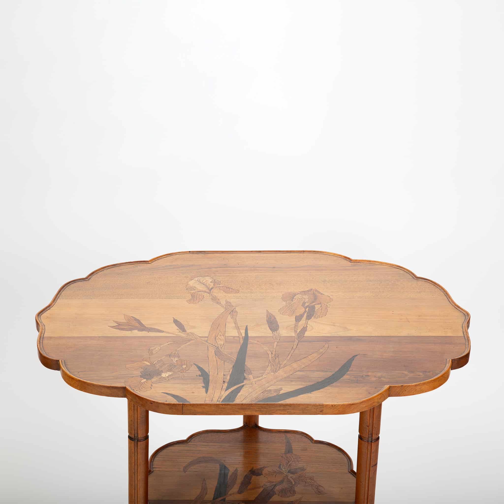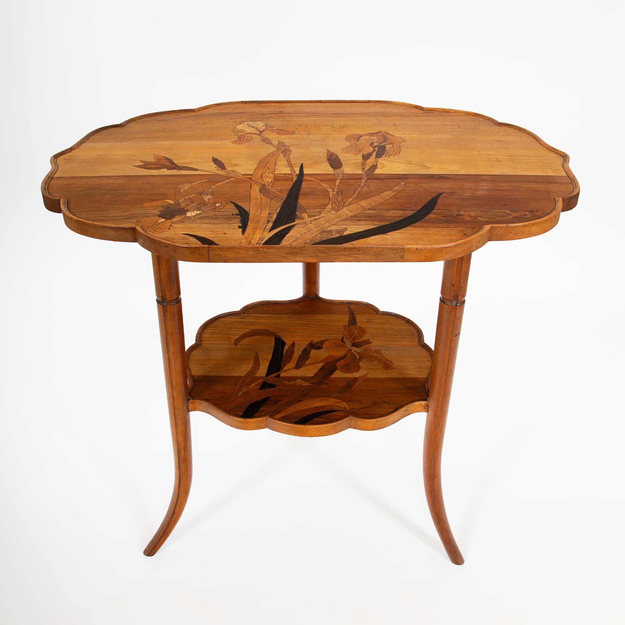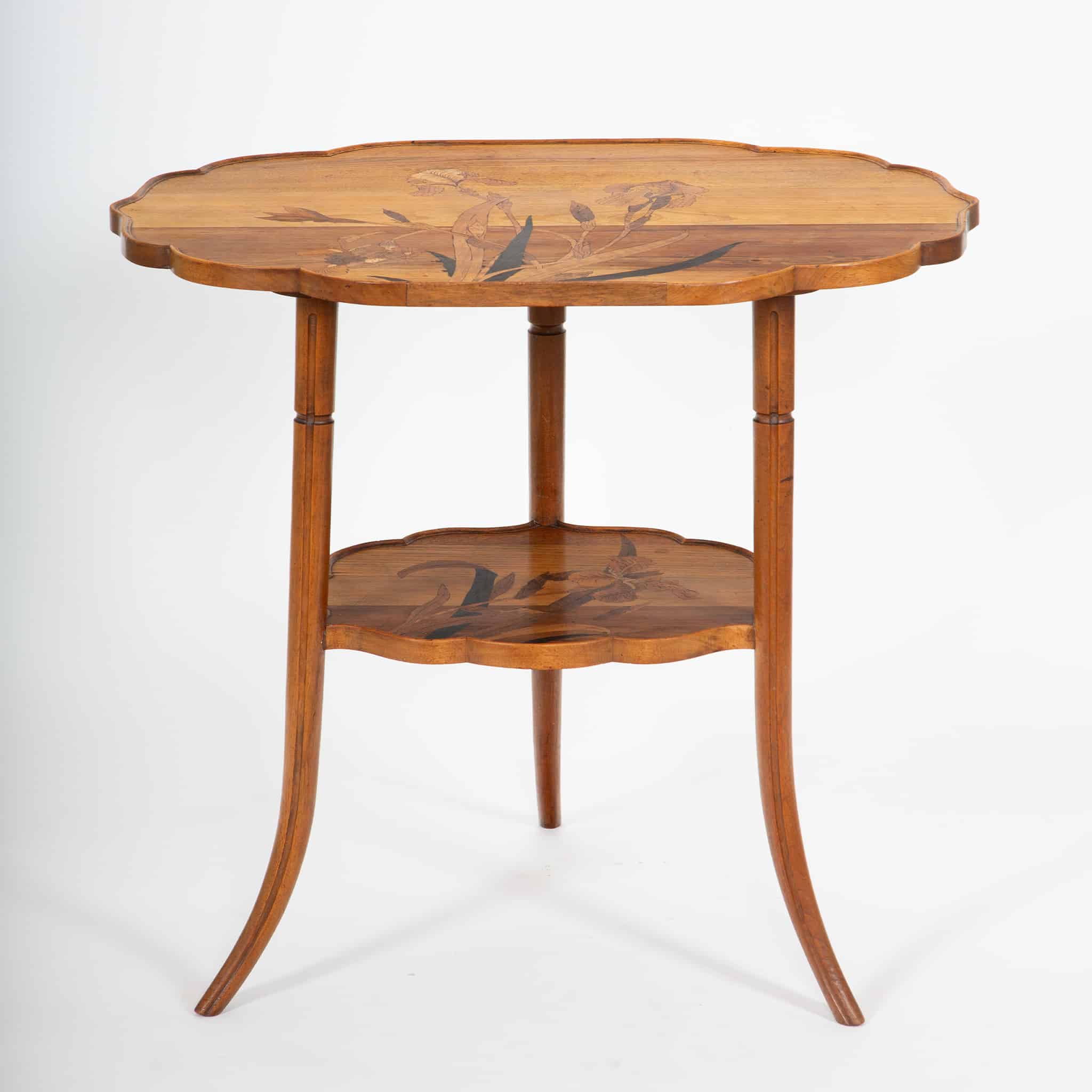 This refined double-tier tea table exemplifies the poetic naturalism and technical mastery of Émile Gallé, one of the most important figures of the French Art Nouveau movement. Constructed of finely selected fruitwoods, the table features Gallé’s signature marquetry technique, with a delicately rendered botanical composition—likely irises—unfolding across both the scalloped top and lower tier. The subtle gradation of woods creates depth and movement, characteristic of Gallé’s painterly approach to furniture design.