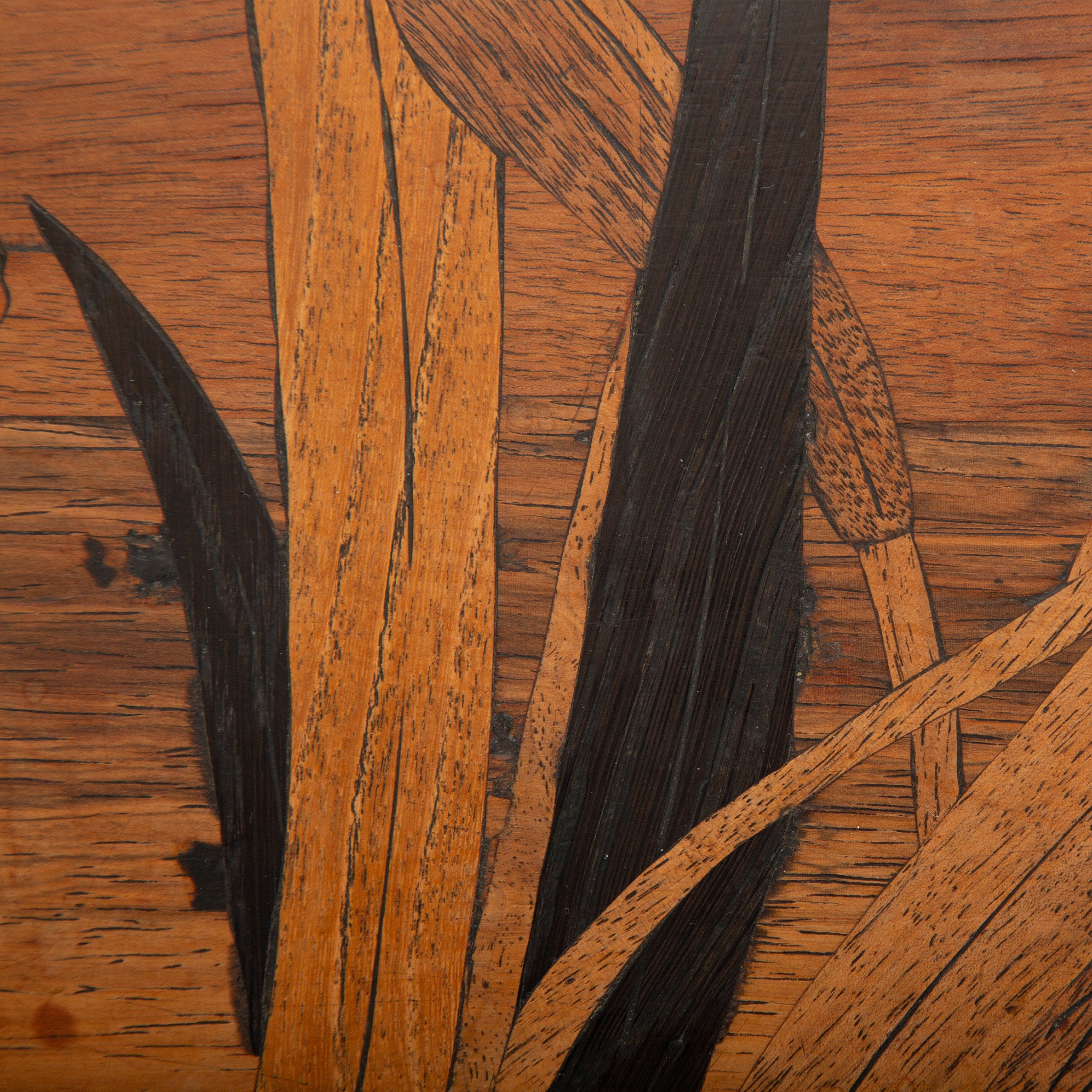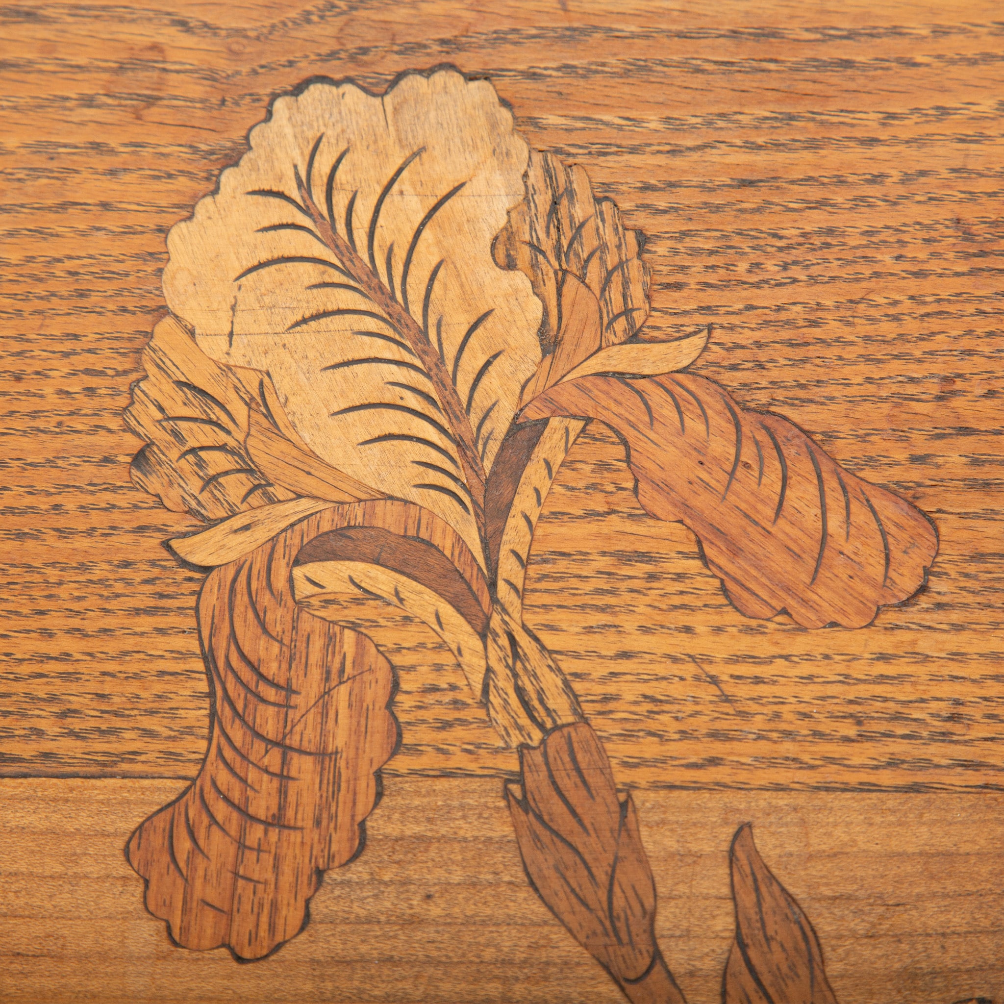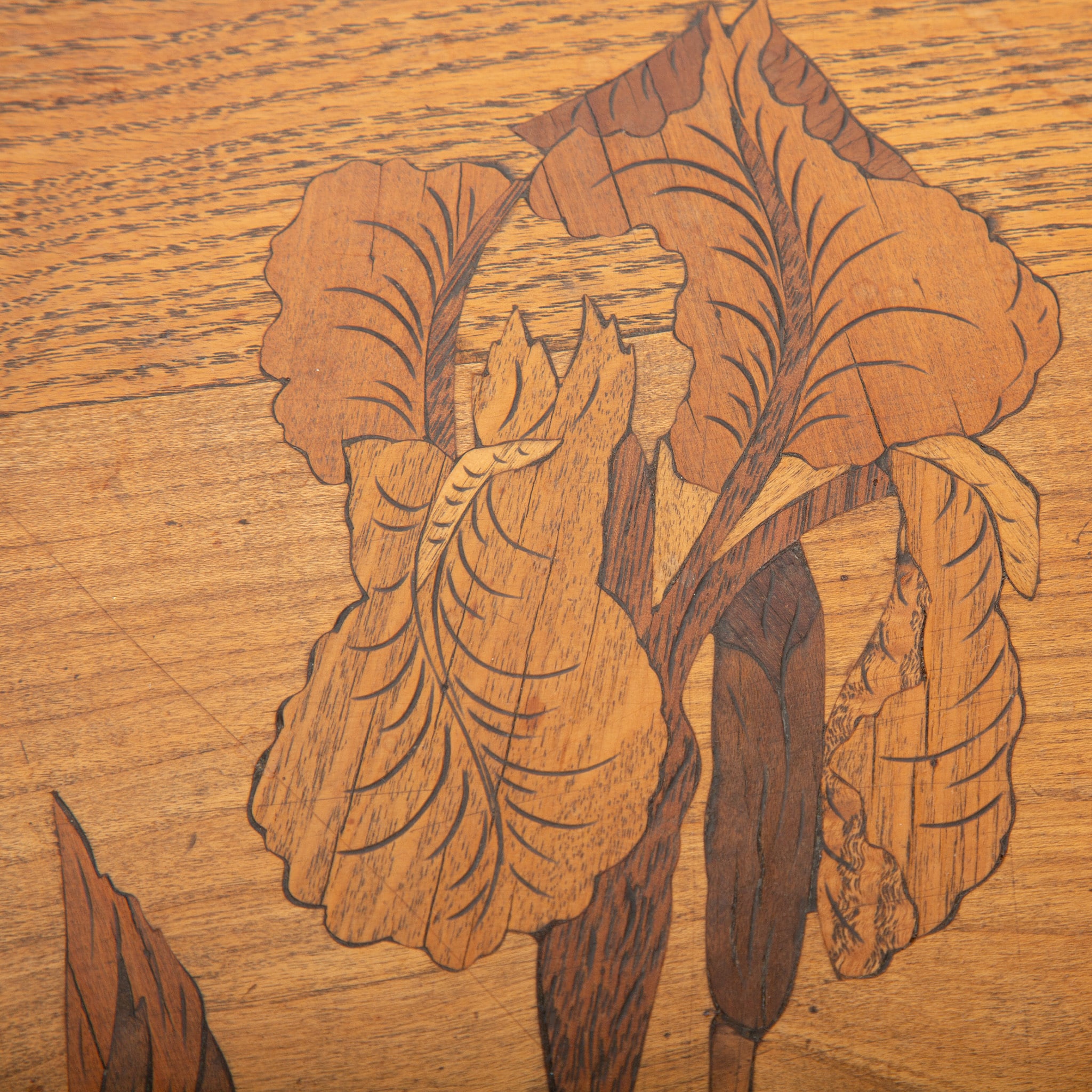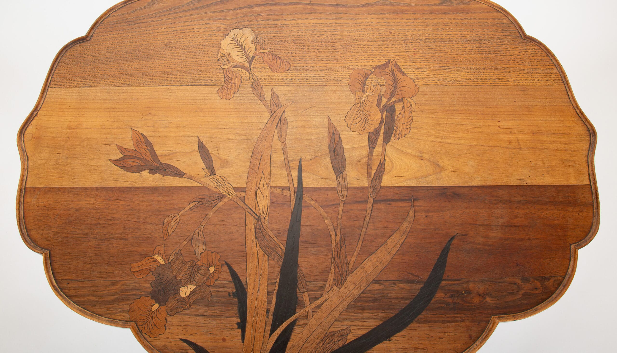 This refined double-tier tea table exemplifies the poetic naturalism and technical mastery of Émile Gallé, one of the most important figures of the French Art Nouveau movement. Constructed of finely selected fruitwoods, the table features Gallé’s signature marquetry technique, with a delicately rendered botanical composition—likely irises—unfolding across both the scalloped top and lower tier. The subtle gradation of woods creates depth and movement, characteristic of Gallé’s painterly approach to furniture design.