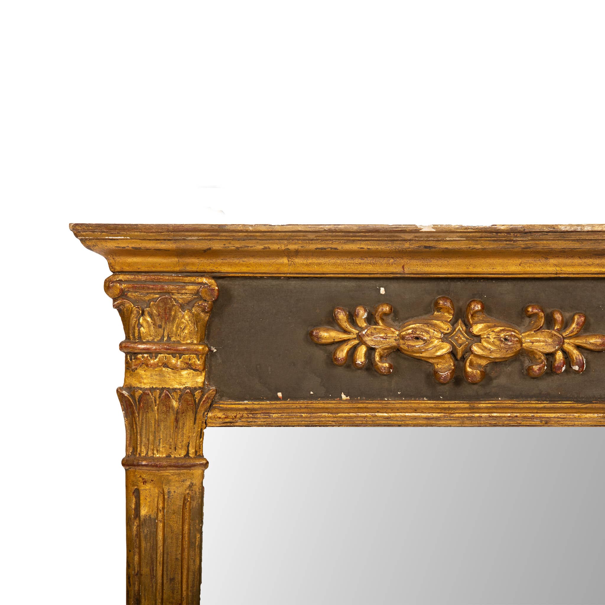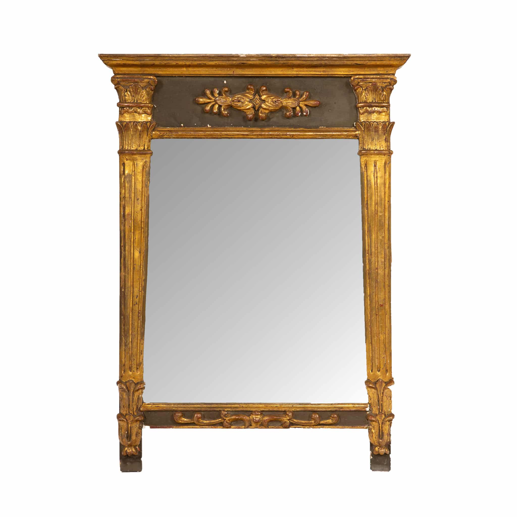 This refined Empire-period mirror exemplifies the neoclassical elegance favored in France during the early 19th century. The rectangular giltwood frame is articulated with crisply carved relief decoration, including stylized floral and foliate motifs arranged in a balanced, architectural composition. Fluted pilaster-style uprights and finely modeled capitals lend the piece a distinctly classical vocabulary, while the restrained ornamentation reflects the sober grandeur characteristic of the Napoleonic era.