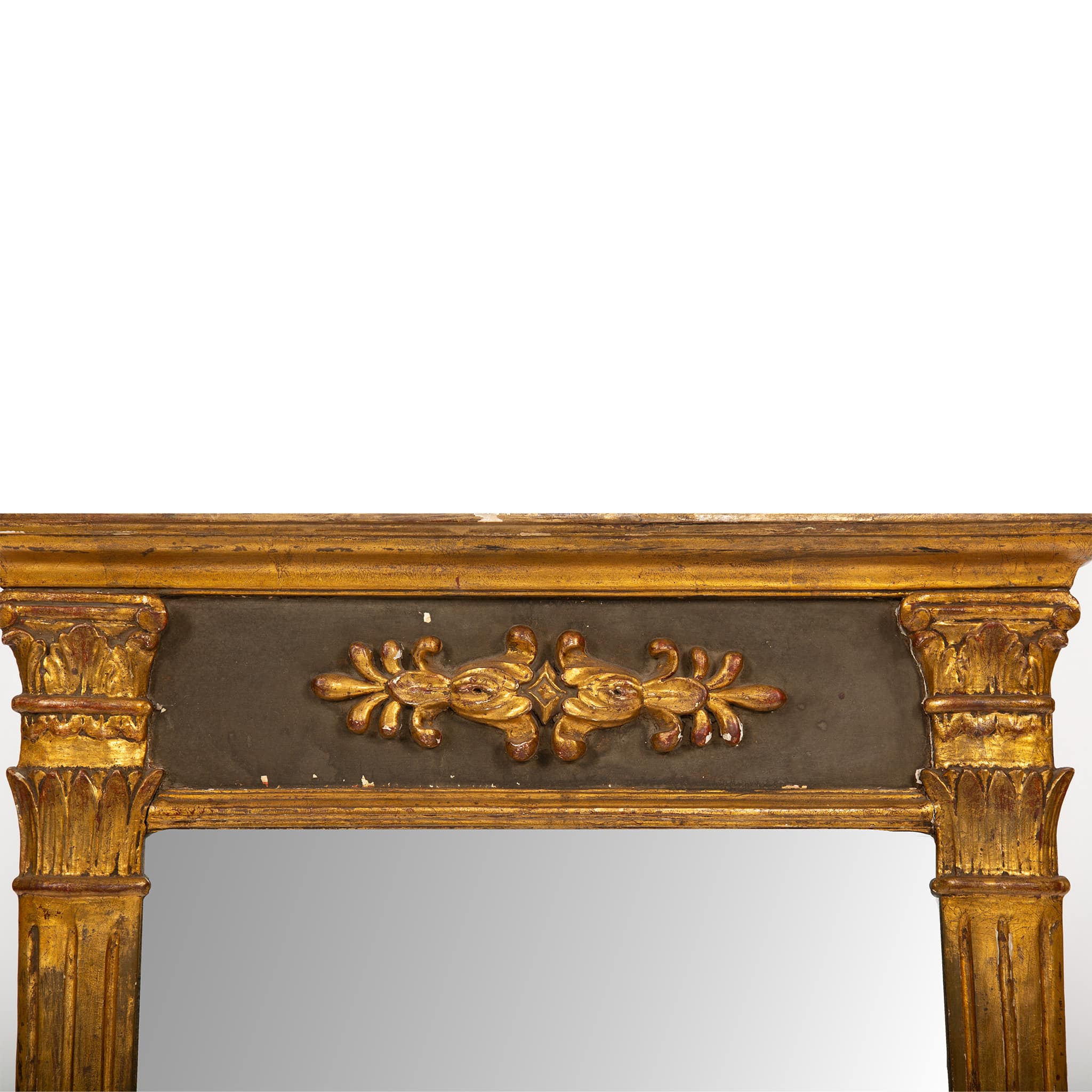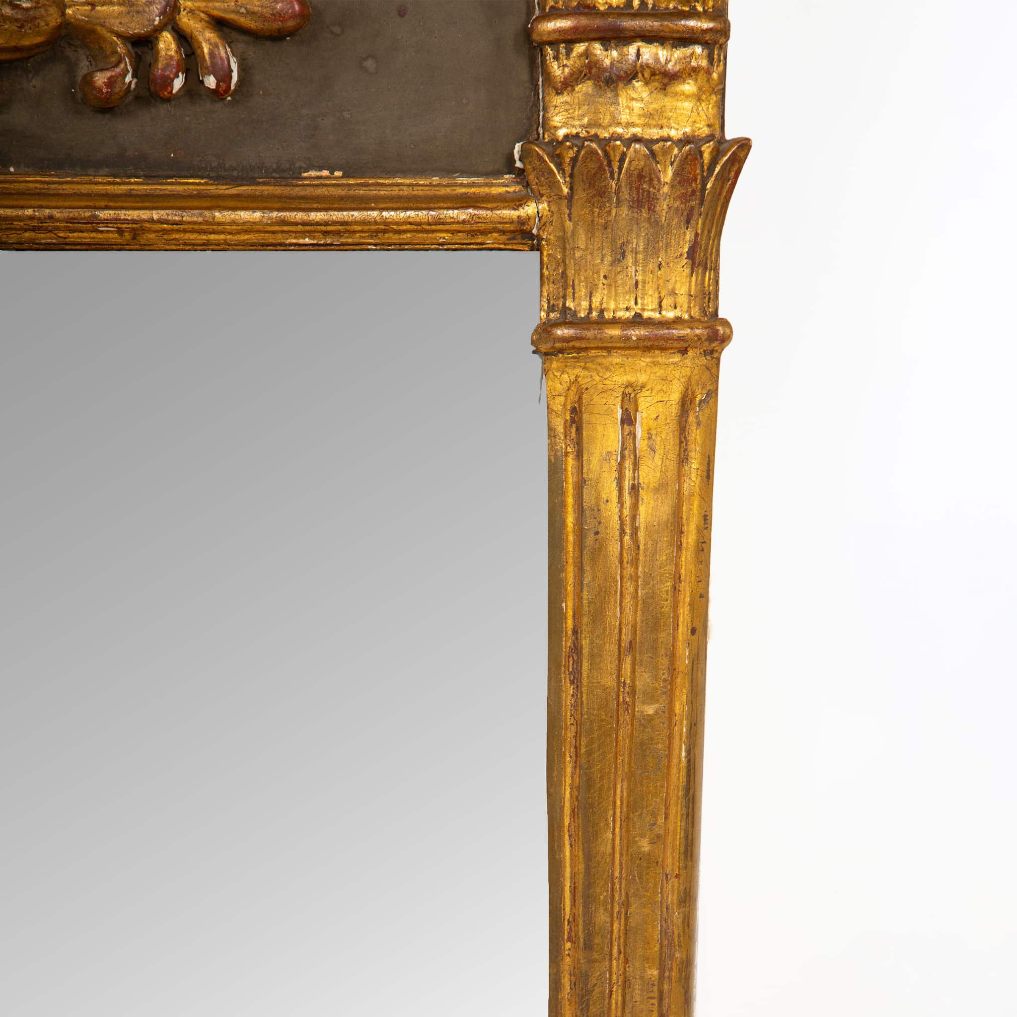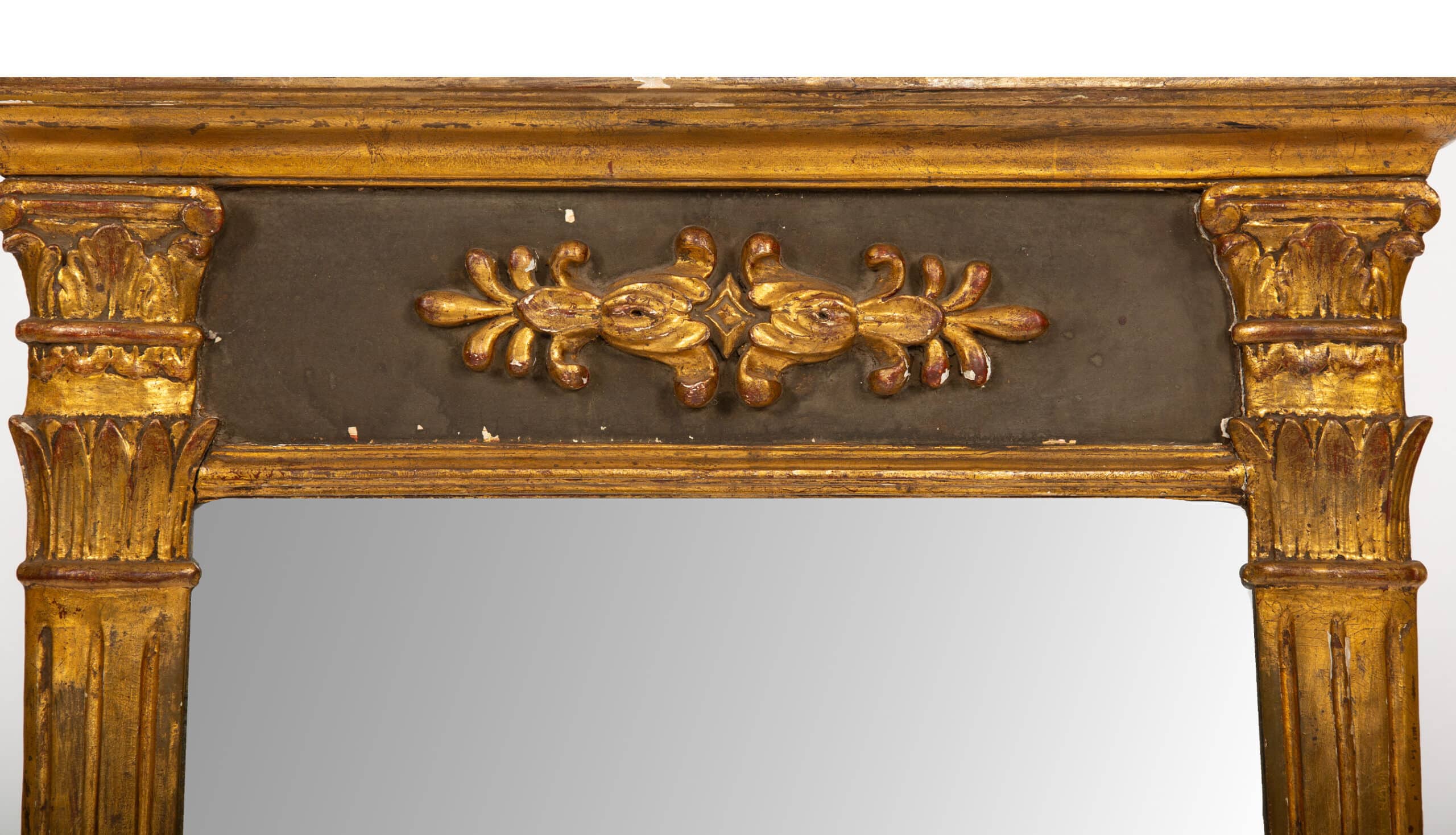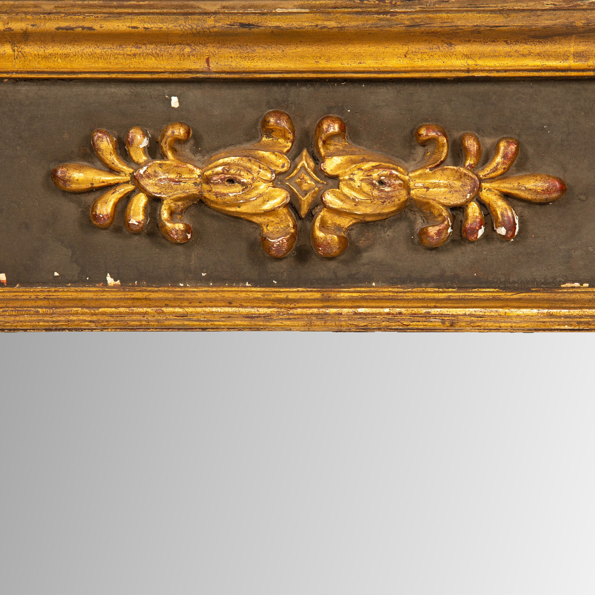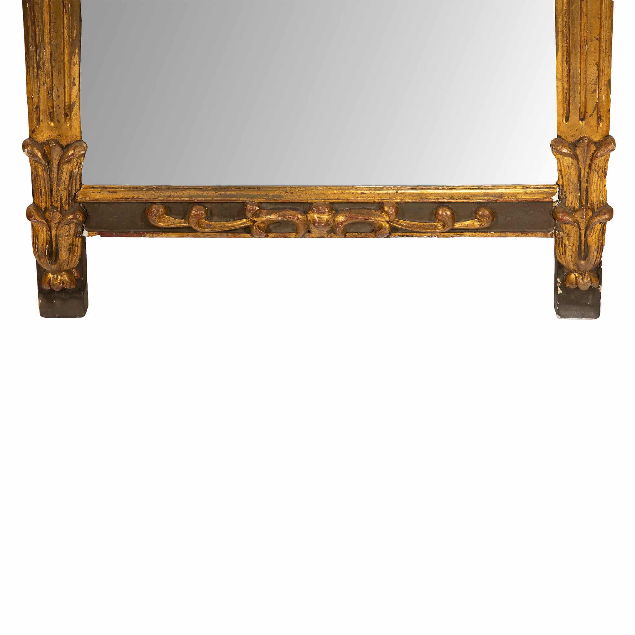 The original mercury glass plate is set within a shallow molded surround, creating a luminous surface that enhances the depth and warmth of the original gilding. The frame retains a rich, time-softened patina, with areas of wear consistent with age, contributing to its authentic presence and historical character.