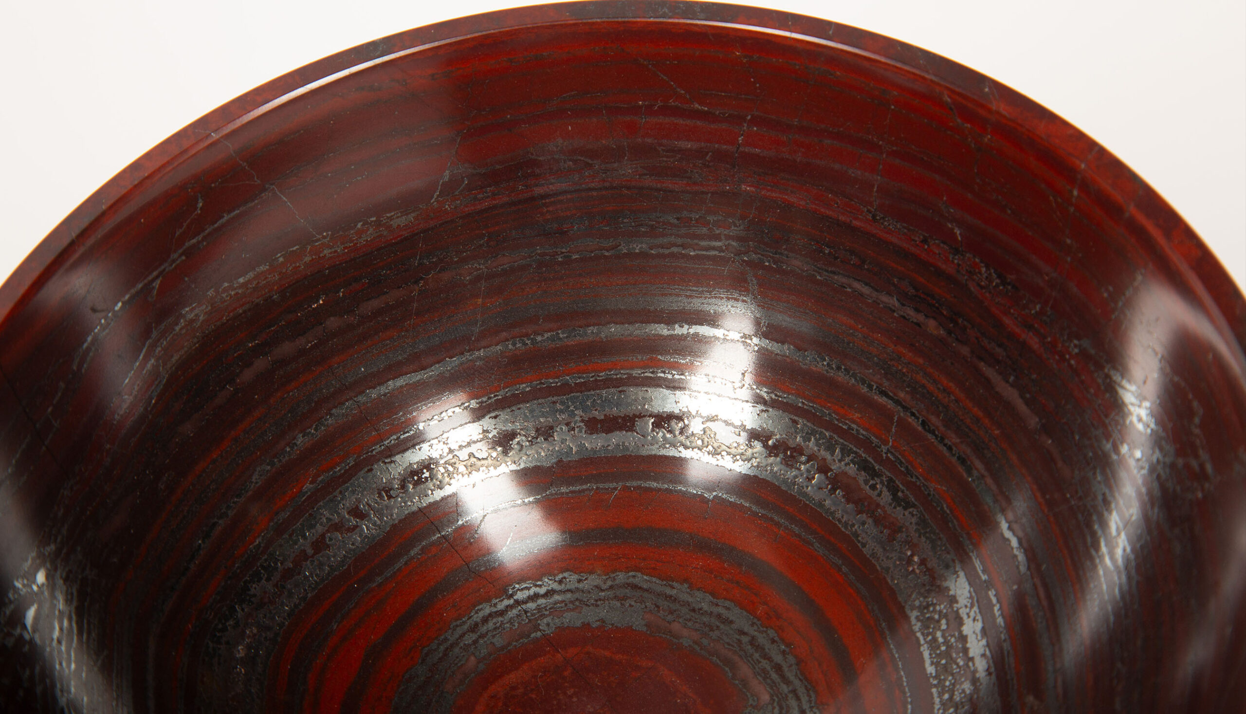 Hand carved and polished bowl, featuring bands of haematite (silver) alternate with bands of jasper (red). This 6" large bowl was crafted by artisans in India, trained from generation to generation in the art of stone carving.