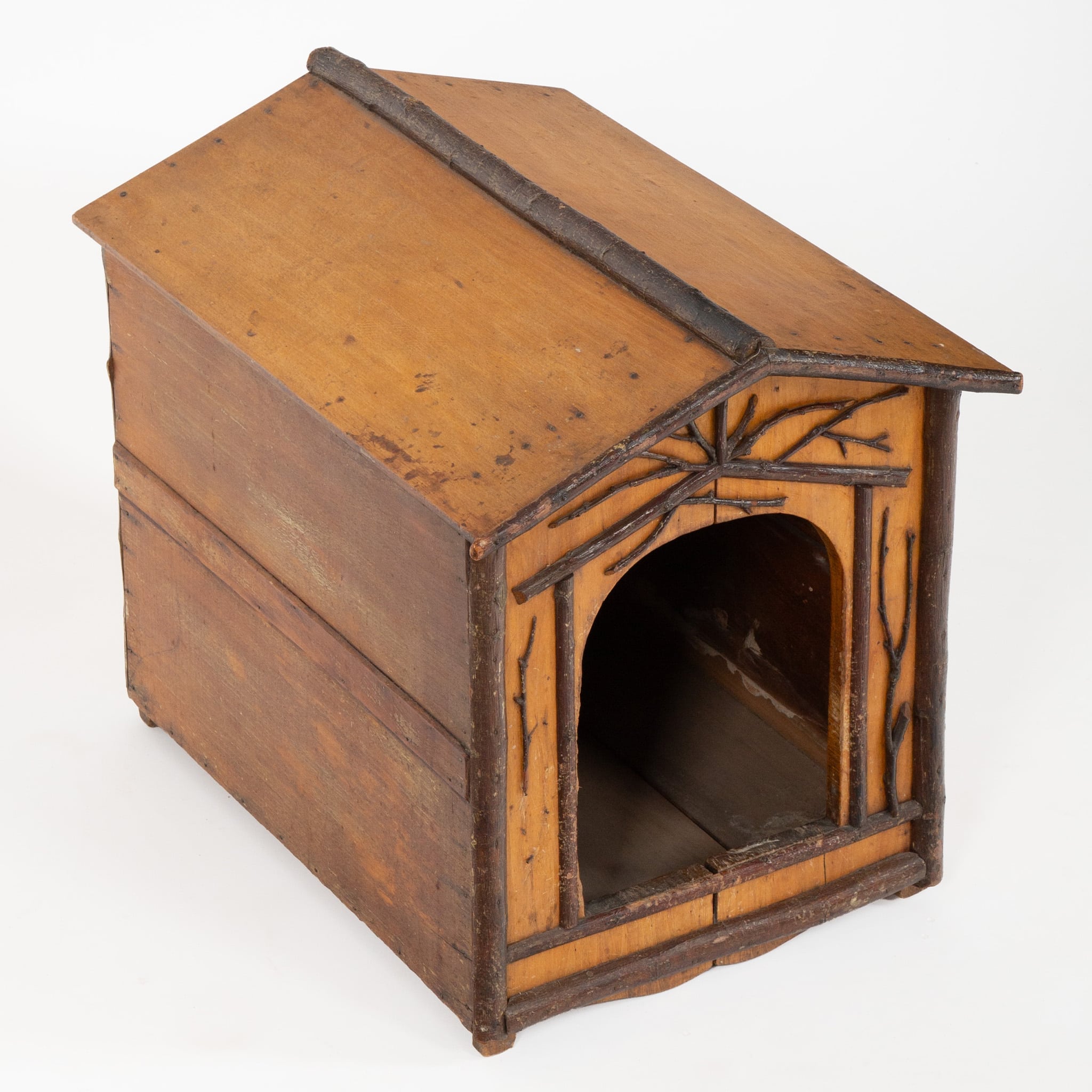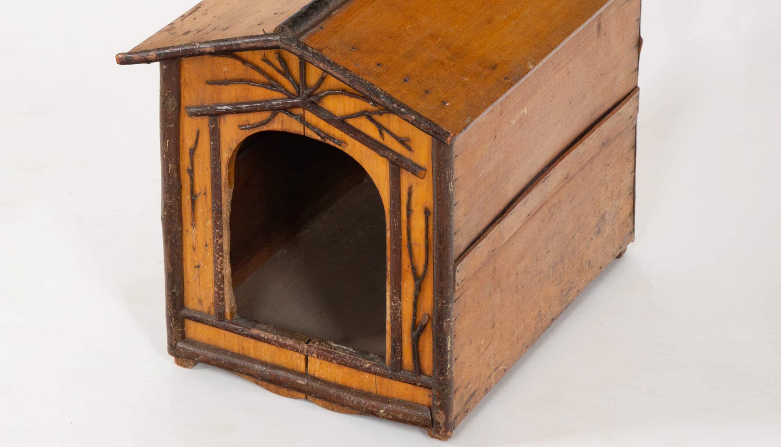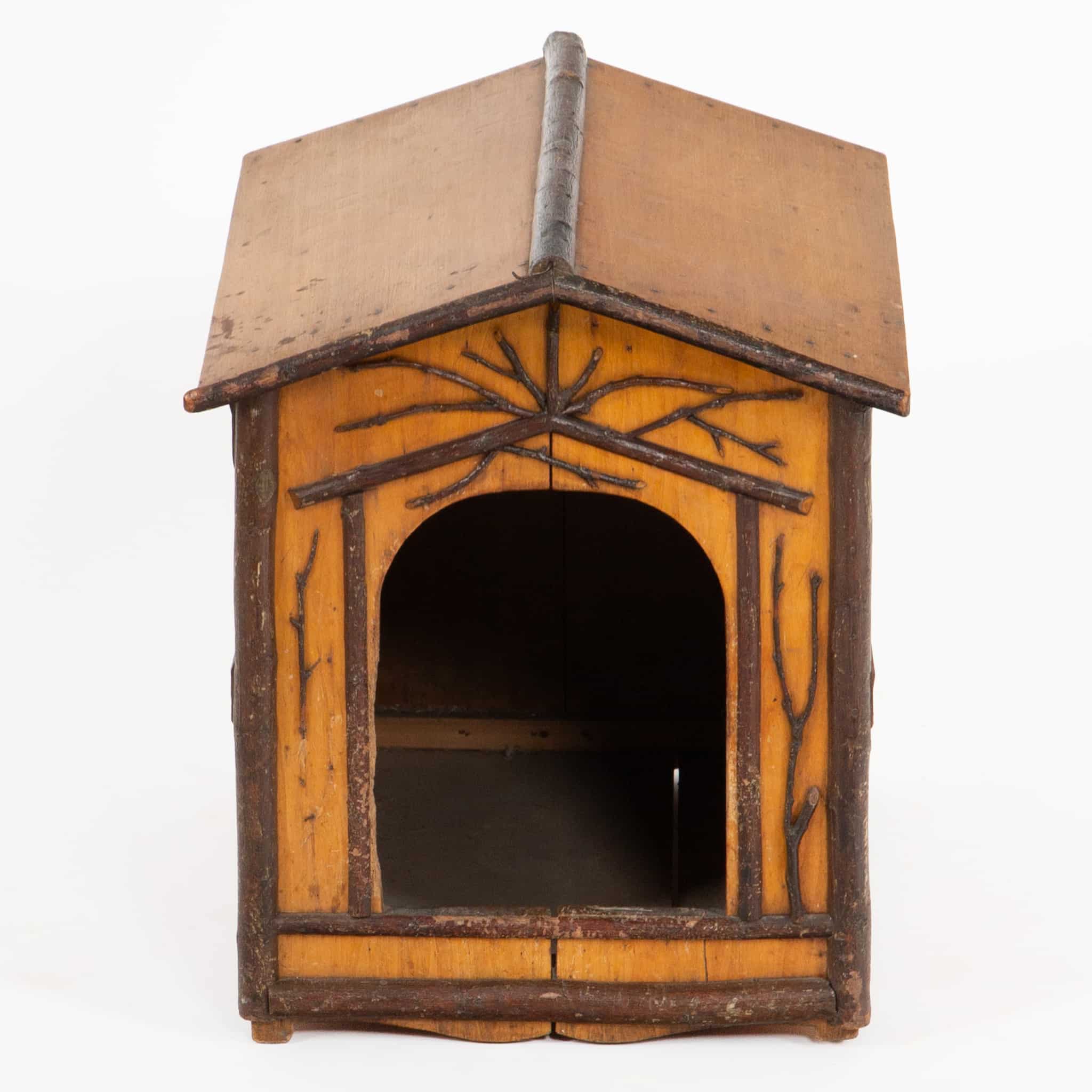 This charming early 20th-century European dog house is crafted in the Alpine rustic tradition, reflecting the folk-art sensibility of Central Europe, particularly regions such as the Black Forest and Alpine territories. Constructed from solid wood, the structure is designed in the form of a miniature chalet, complete with a pitched roof and arched entrance. Decorative applied branchwork adorns the façade, imitating natural tree limbs and timber framing—a hallmark of rustic European craftsmanship inspired by forest architecture and hunting lodges.
