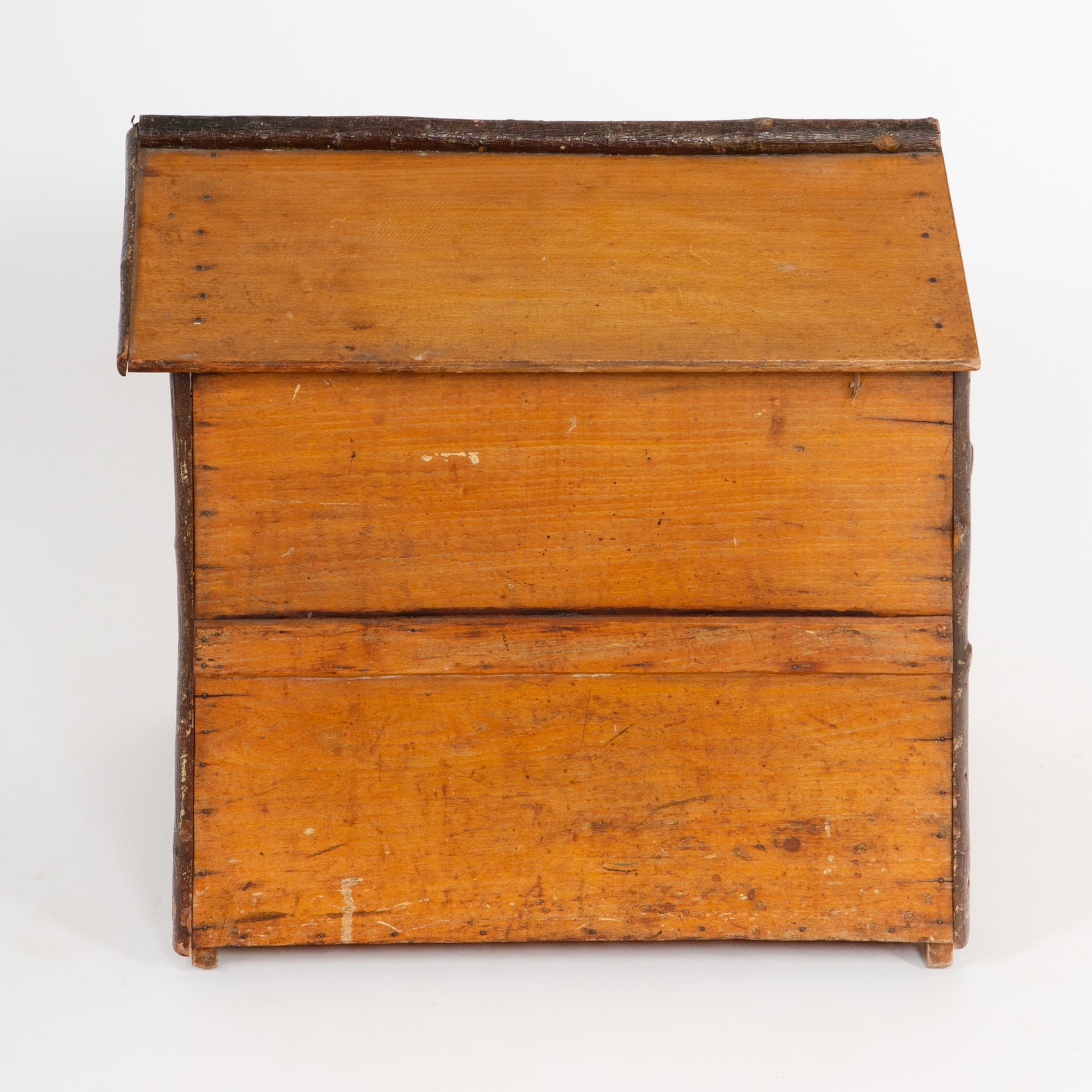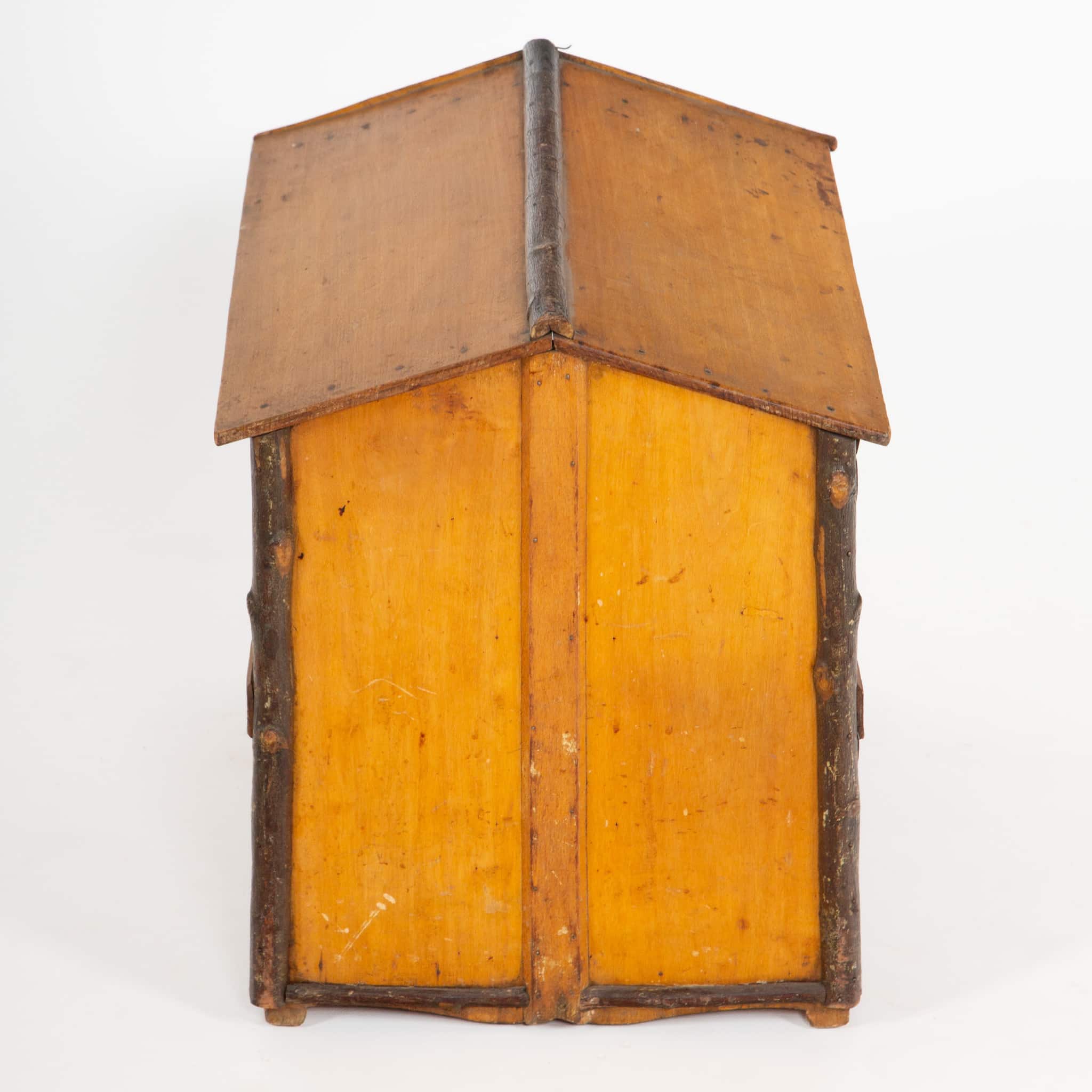 Both functional and ornamental, this dog house was likely intended for an estate or hunting dog rather than utilitarian farm use, embodying the romanticized rural aesthetic popular in the early 1900s. The warm patina, visible wear, and hand-finished details attest to its age and authenticity. Today, it survives as a rare and evocative example of European folk design, equally compelling as a functional shelter or as a distinctive decorative object.