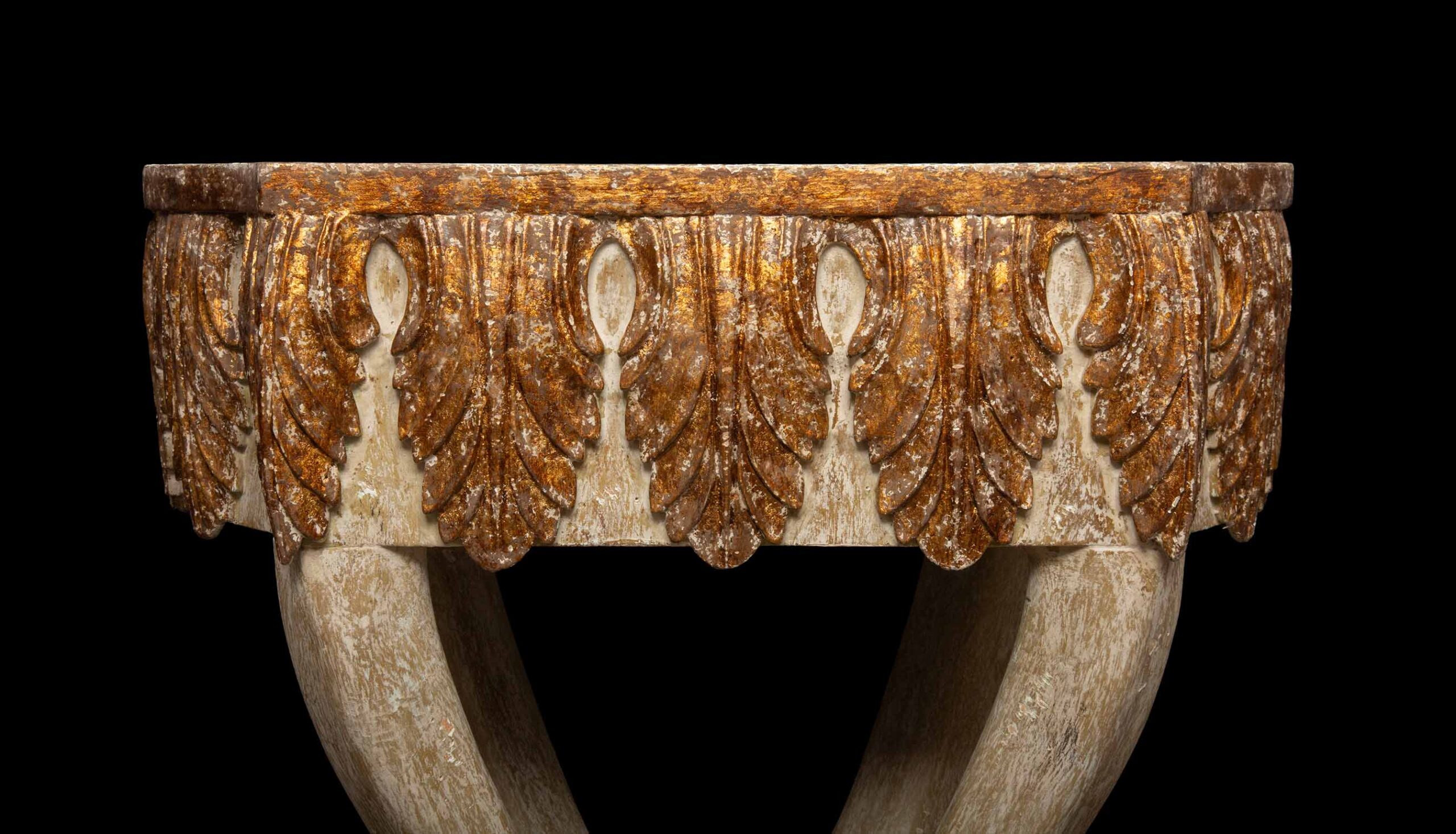 Exquisite Carved Wood Side Table featuring a stunning white-washed finish adorned with delicate gilded accents, all supported by intricately carved hoof legs. Crafted with meticulous attention to detail, this charming side table from the renowned Creel and Gow is sure to evoke a sense of delight and sophistication in your living space. Its expertly carved woodwork and whimsical design make it a unique and eye-catching addition to any room, adding both functional elegance and a touch of whimsy to your home. Embrace the fusion of artistry and functionality with this piece that's bound to bring joy to your everyday life while showcasing your impeccable taste in decor.