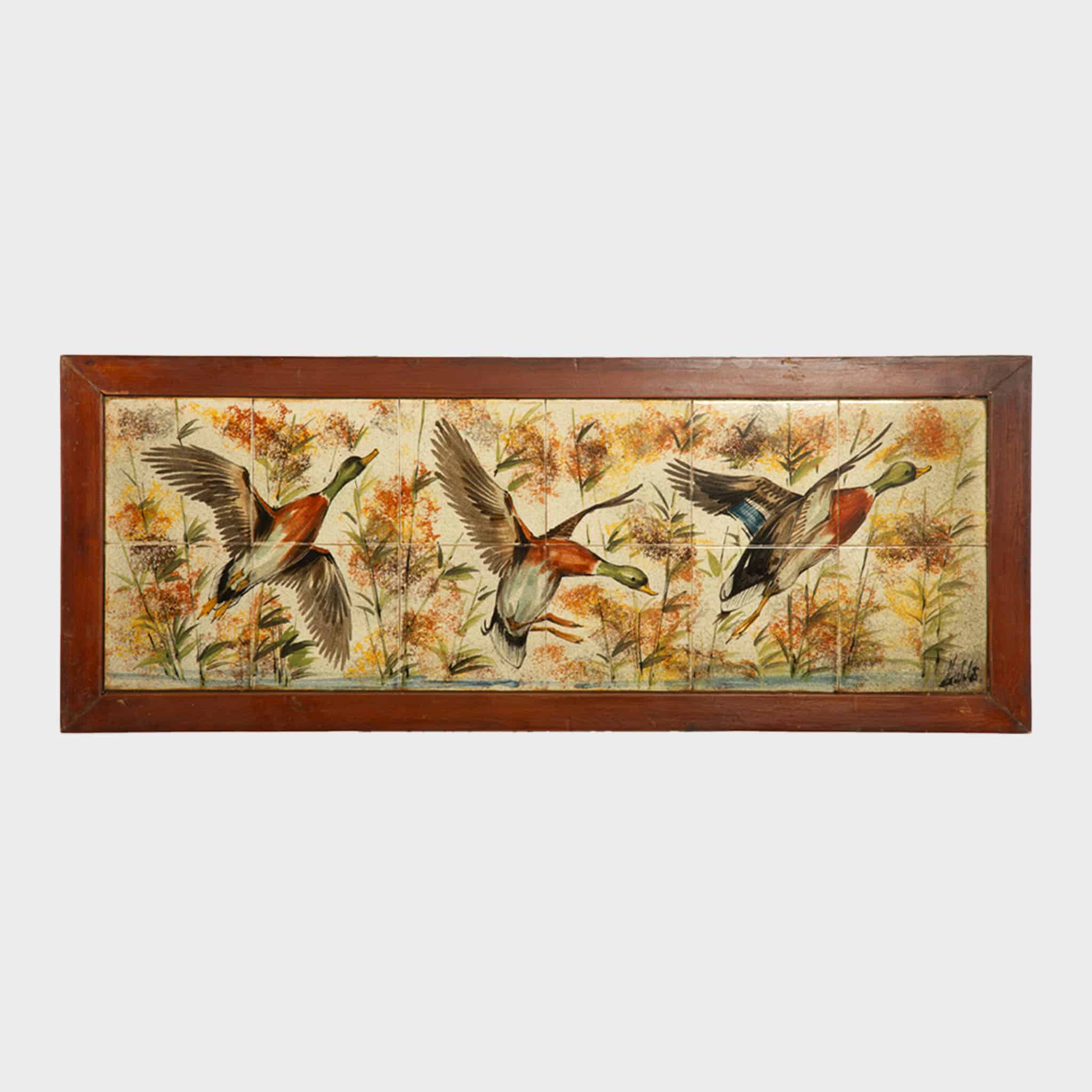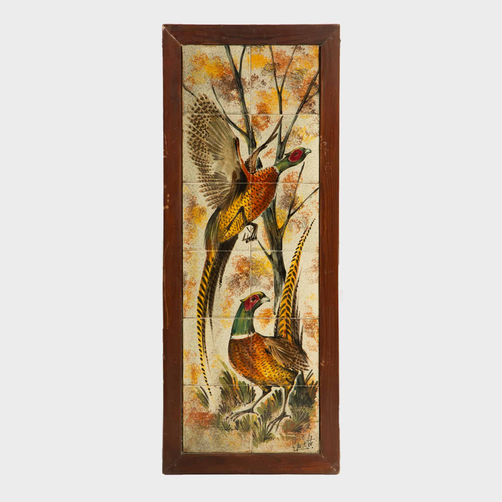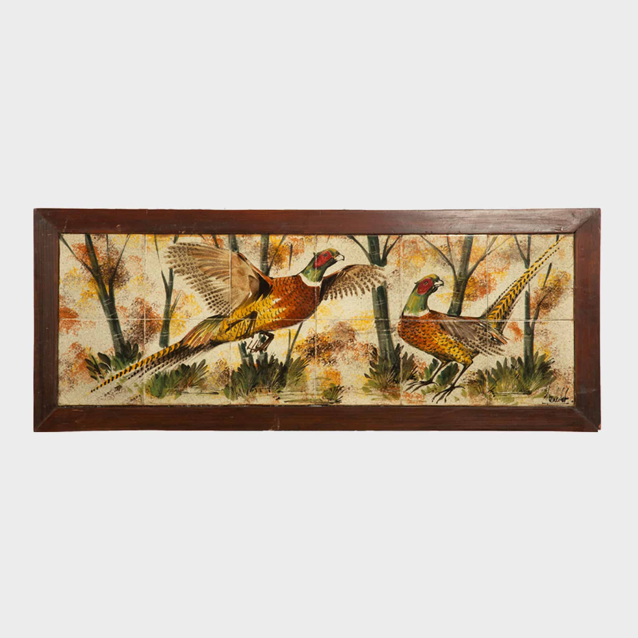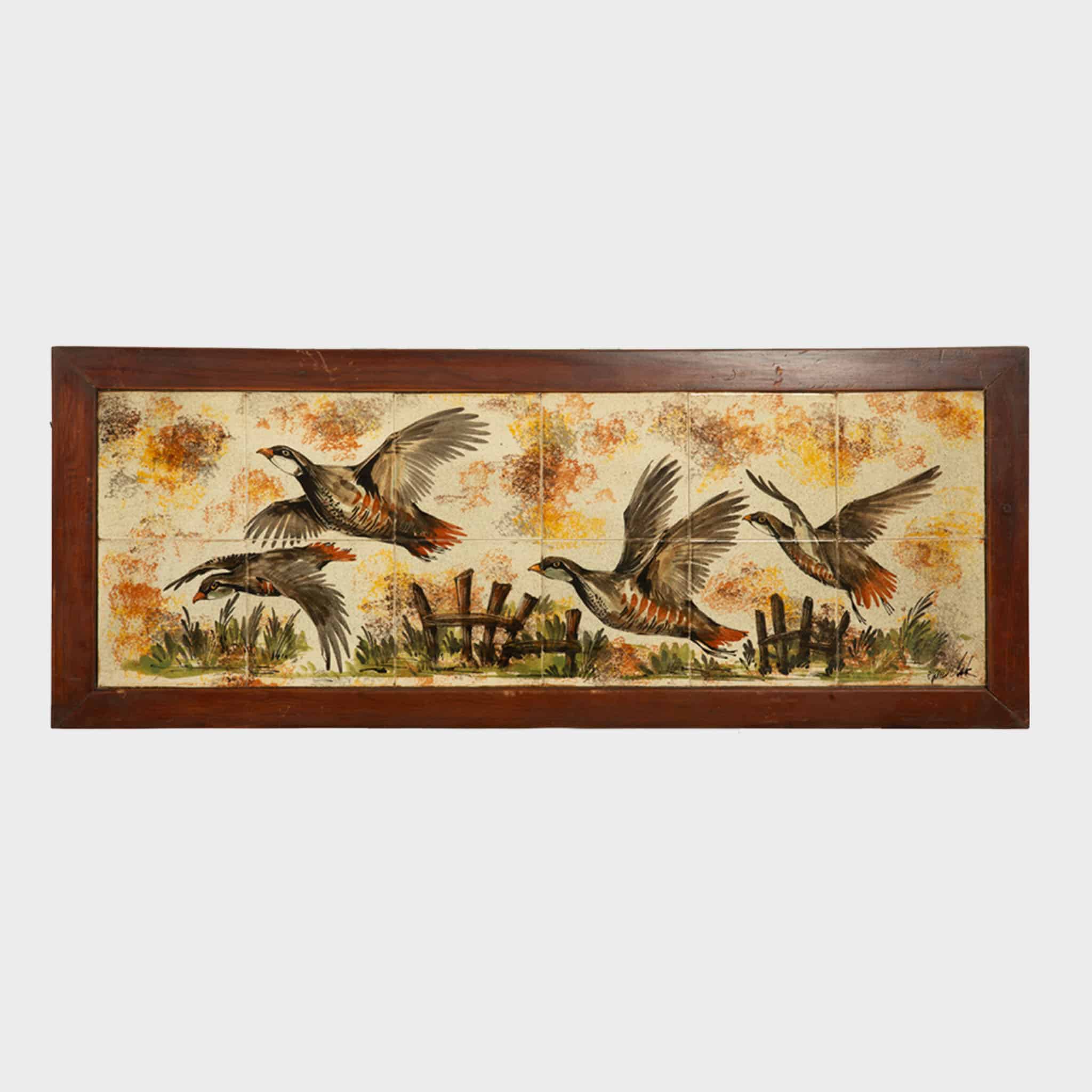 The glazed ceramic tiles are set within simple, well-proportioned wooden frames that provide a quiet architectural border, allowing the imagery to remain the focal point. The panels vary slightly in orientation, offering flexibility in display—either arranged as a unified narrative grouping or presented individually as decorative wall works. Equally suitable for a hunting lodge, study, or mid-century interior, the set carries both decorative presence and thematic resonance.