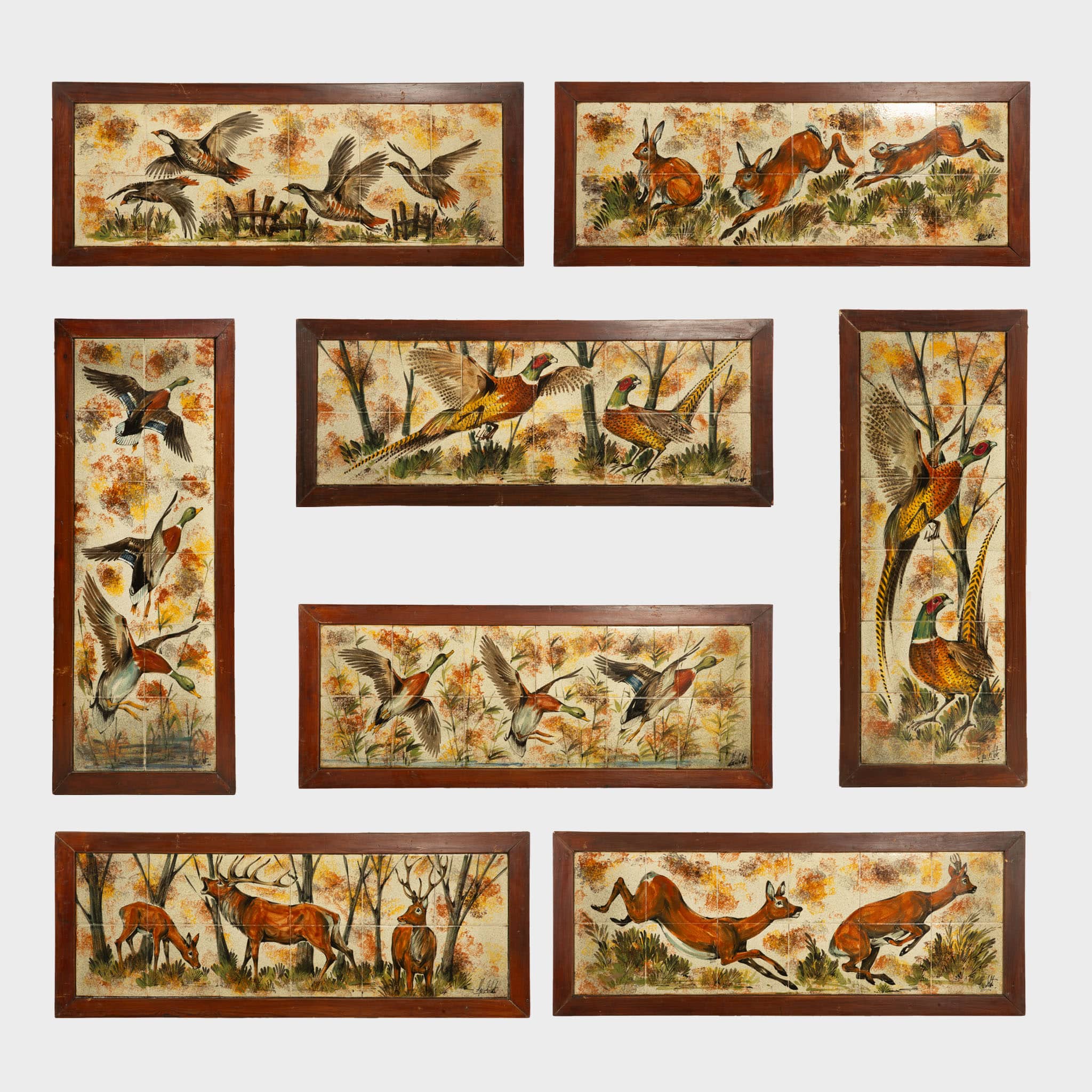 This striking set of eight mid-century ceramic tile panels features animated depictions of game animals traditionally associated with hunting, including deer and ducks, rendered within richly textured landscape settings. The subject matter reflects a long decorative tradition celebrating the sporting life and the natural world, reinterpreted here through a distinctly mid-century modern lens.