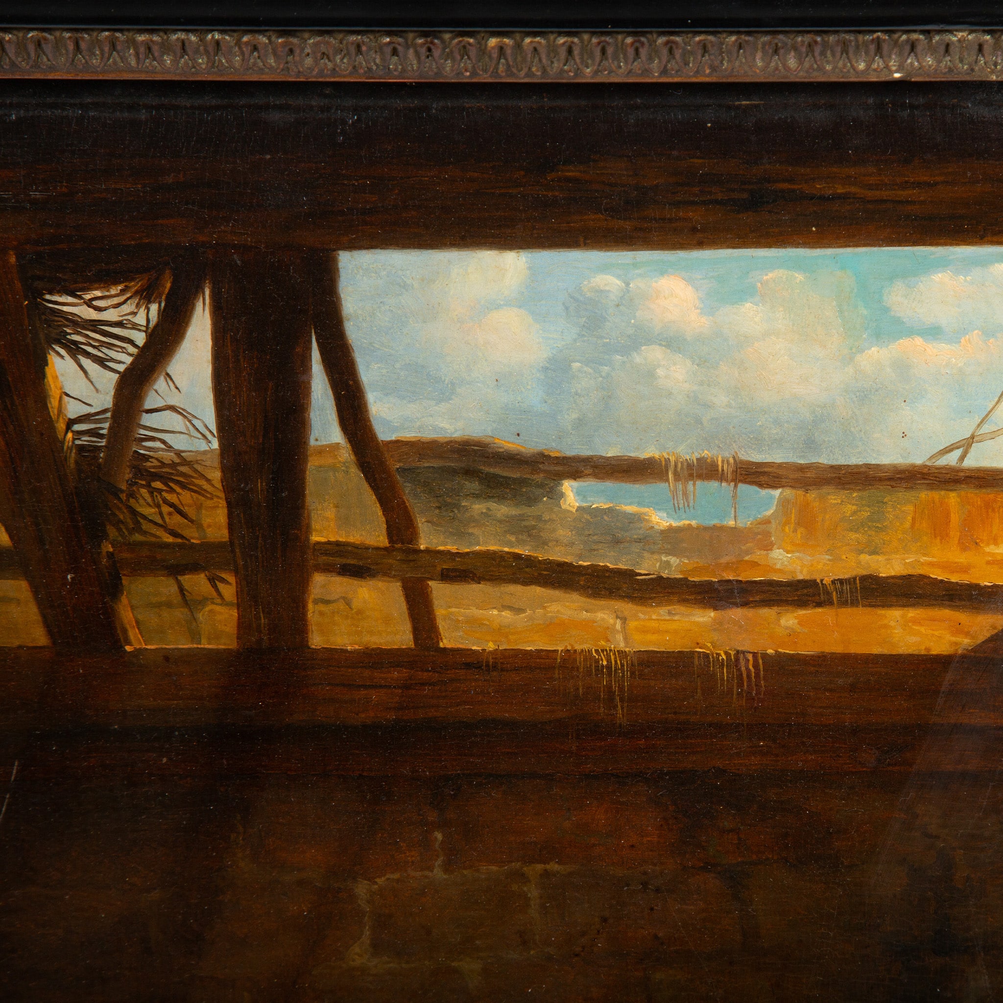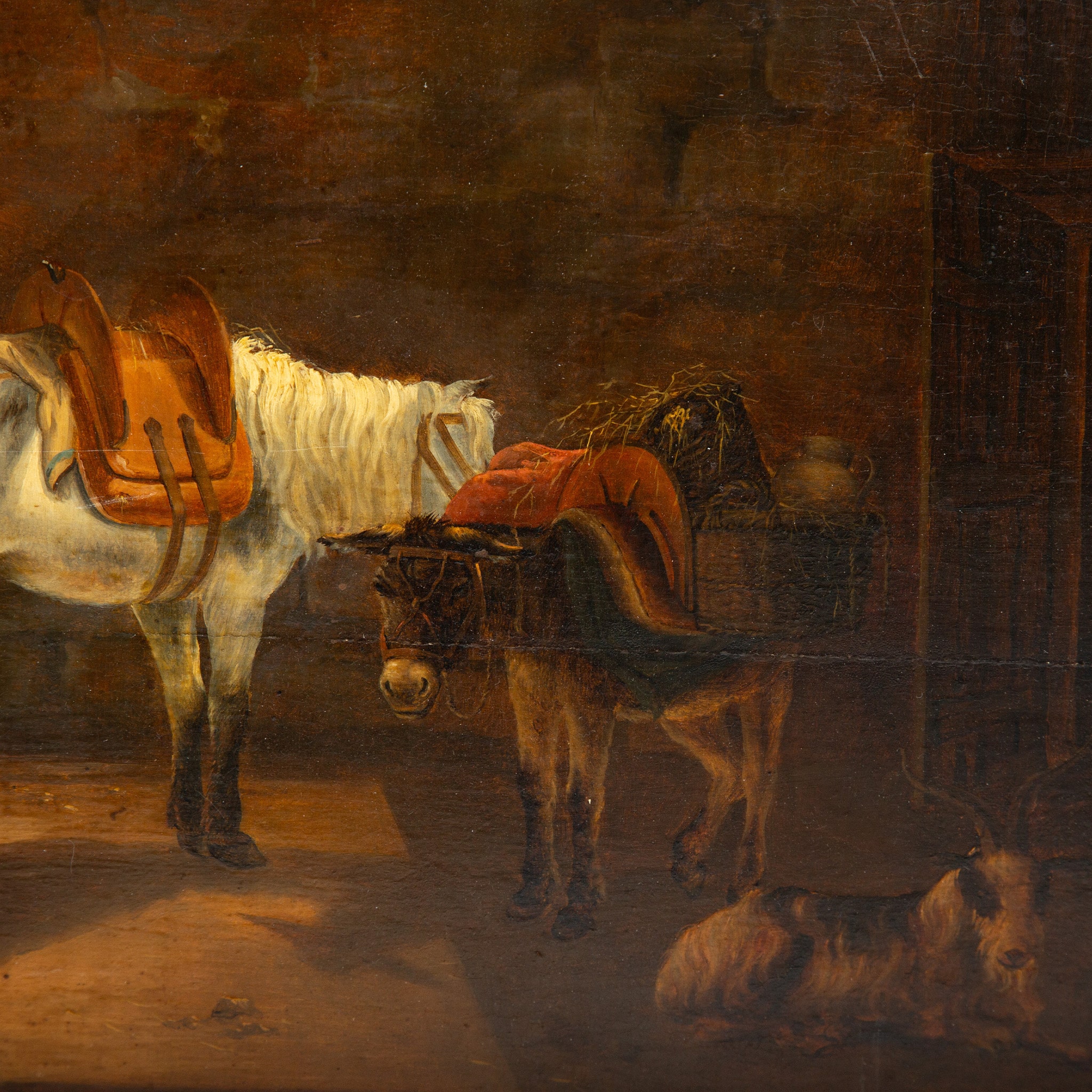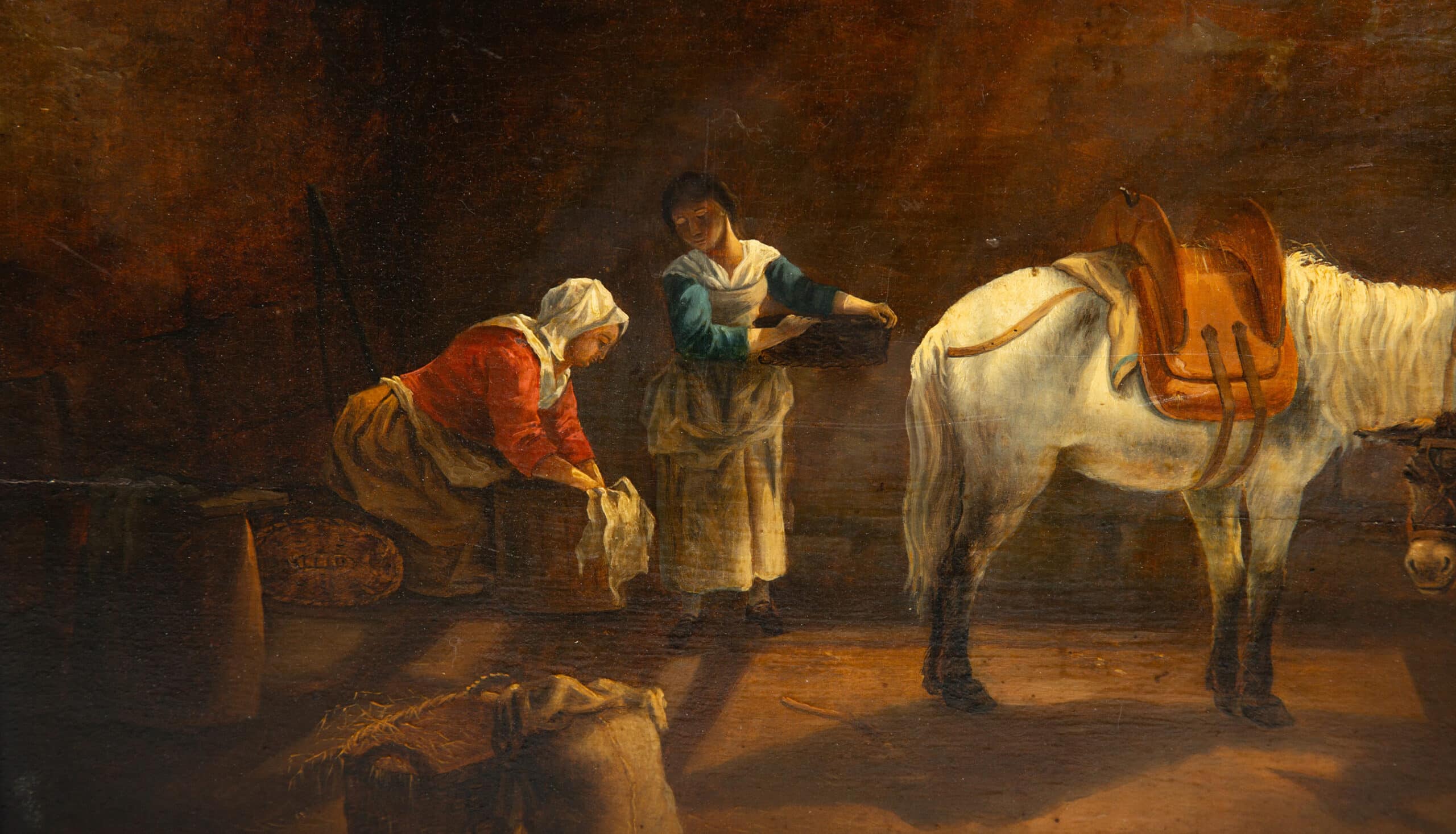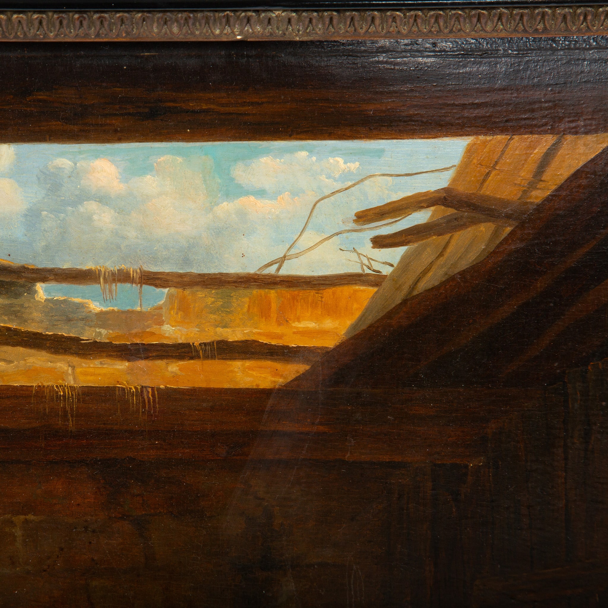 This fine oil on panel is attributed to the workshop of Jean-François Legillon (Bruges 1739 – Paris 1797) and depicts A Ruined Barn Illuminated by the Sun, Interior of the Stables of Maecenas at Tivoli. Executed on two horizontal wooden boards, the composition presents a warmly lit stable interior animated by figures tending to horses, suffused with a dramatic contrast between shadowed architecture and a sunlit opening above. The subject reflects Legillon’s refined interest in architectural ruins and pastoral genre scenes, combining classical references with everyday rural life in a manner characteristic of late 18th-century French painting. On the reverse, the panel bears an additional painted study of a nun executed in grisaille, offering a rare and evocative glimpse into the artist’s or workshop’s working process.