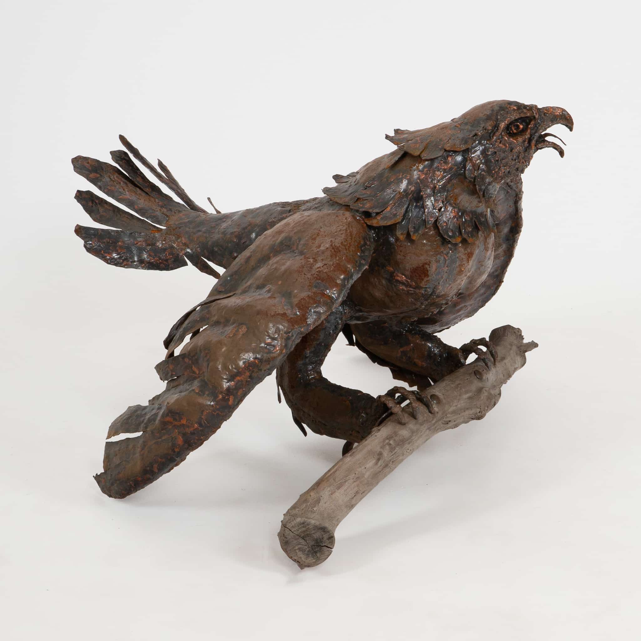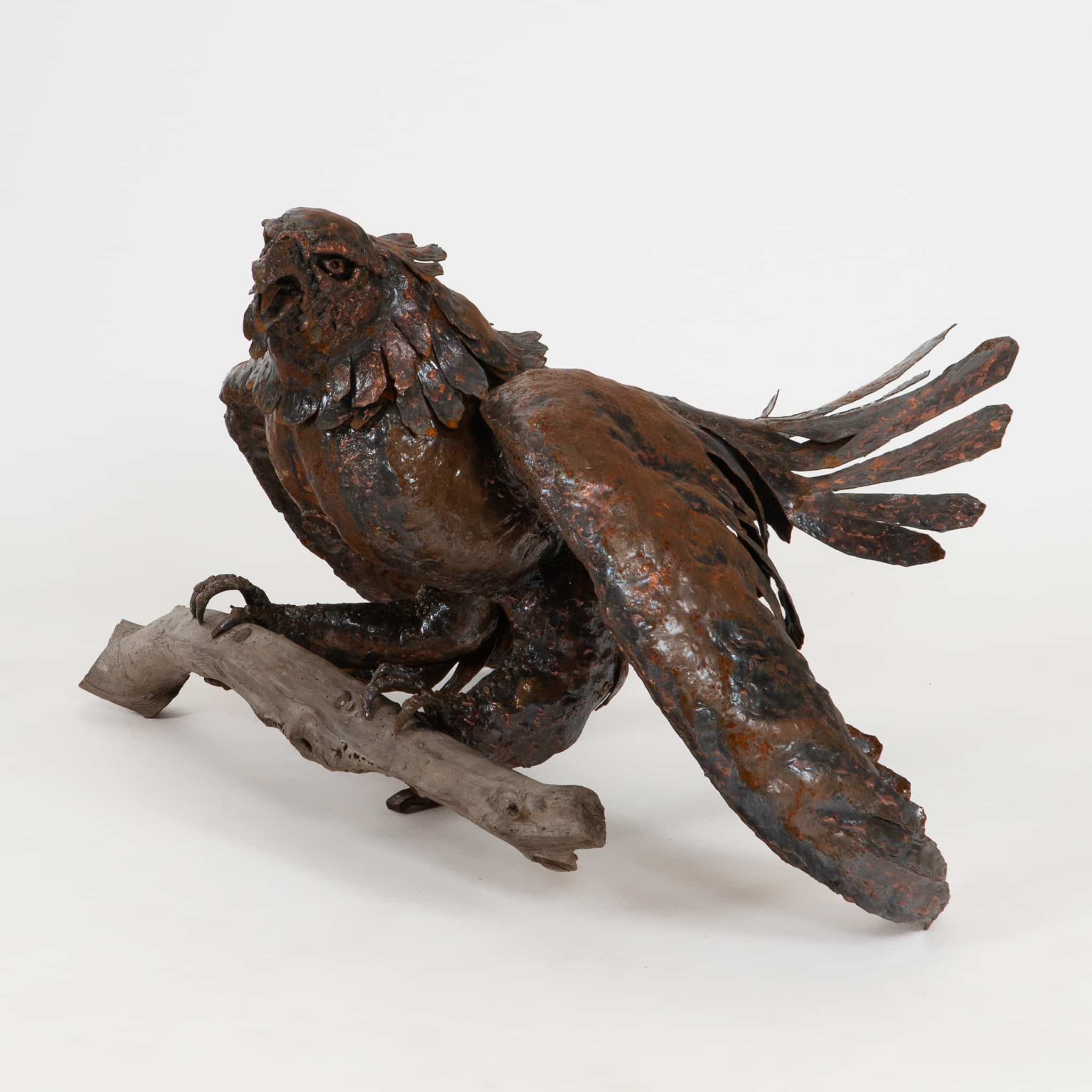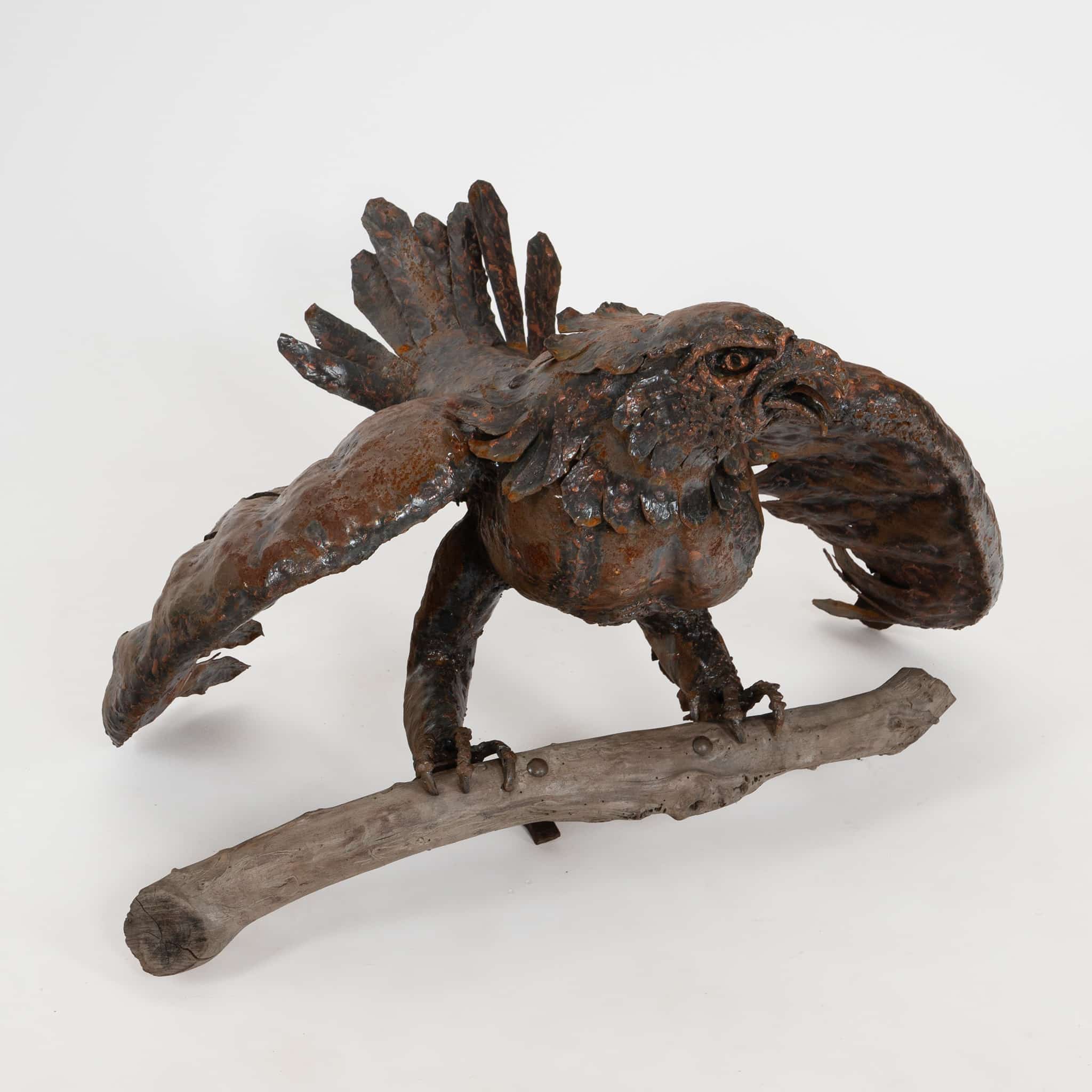 This striking large-scale metal sculpture depicts an eagle poised on a branch with wings partially outstretched, captured in a moment of tension and movement. Crafted in the 20th century, the work is formed from hammered and welded metal elements, giving the surface a richly textured, expressive quality. The eagle’s powerful stance, sharply modeled beak, and layered feather detailing convey strength and vigilance, qualities long associated with the bird in both artistic and symbolic traditions.