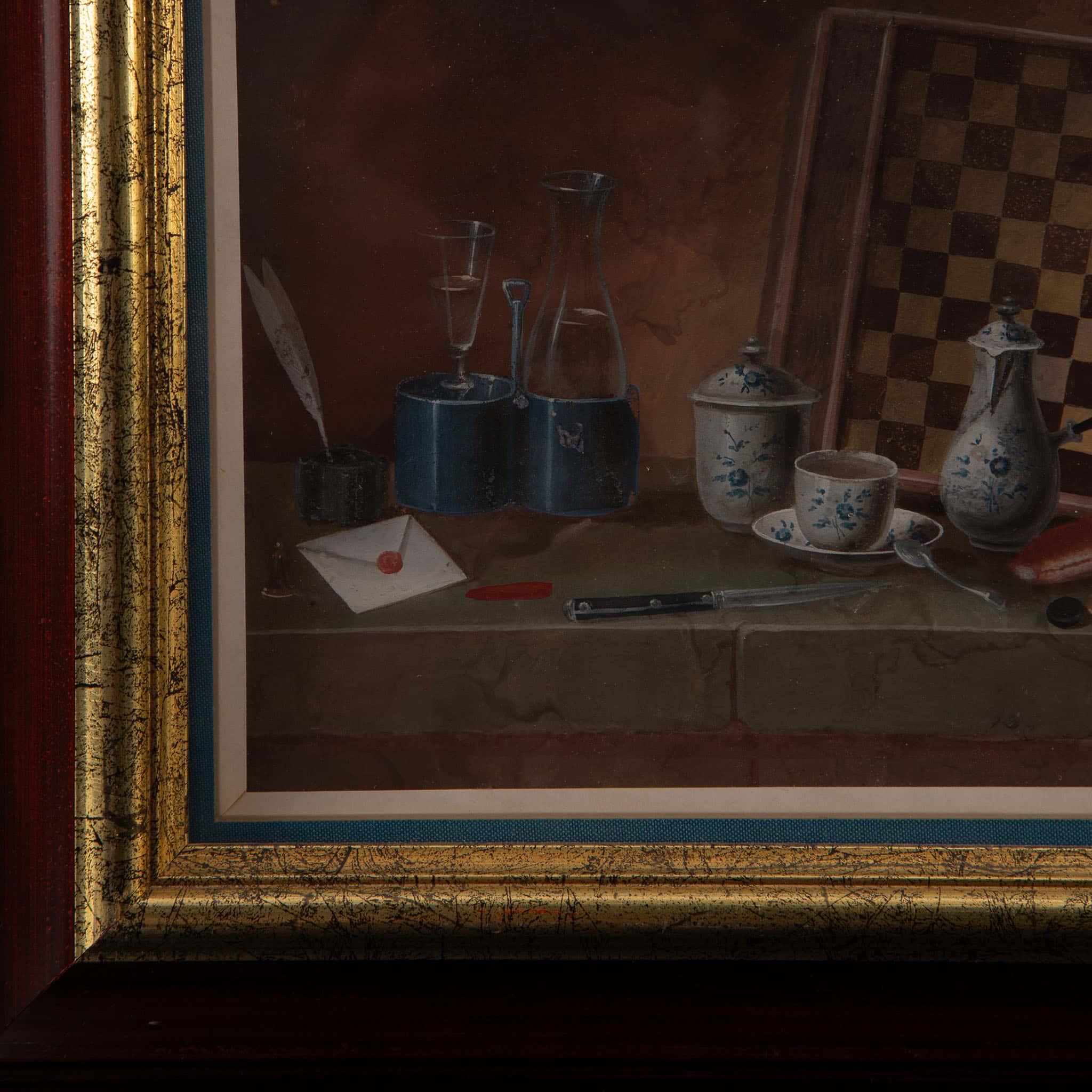 A finely wrought cabinet still life in which Feyerabend arranges a draughts (checkers) board tipped against a stone ledge, its ebony and ivory counters scattered among an assortment of refined objects: Chinese-export porcelain cups and pot, a silvered jug, a sealed letter with quill and stick of red sealing wax, a steel penknife, glass apothecary flasks, and a set of nesting weights. The composition is characteristic of Feyerabend’s meticulous illusionism, in which everyday articles acquire jewel-like intensity through minute brushwork and delicate layering of transparent watercolour and opaque gouache, often heightened with gum arabic.