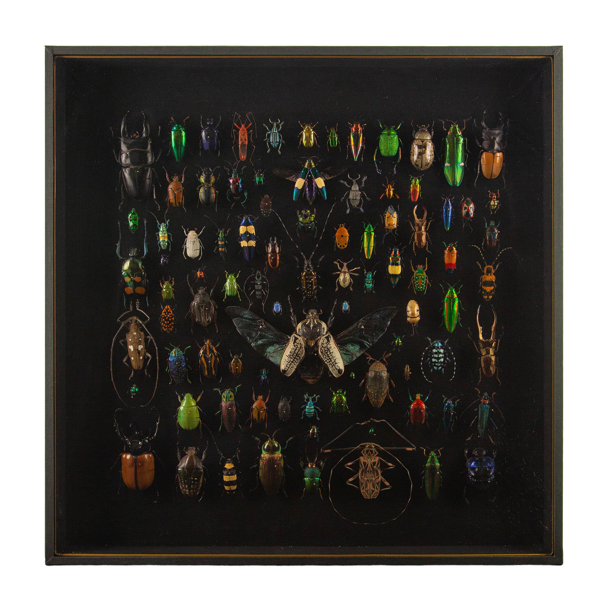 Framed entomological display titled Latticework by Hasharat, showcasing 84 exotic beetle and insect specimens from around the world, arranged in a precise grid against a black ground to highlight their vivid colors and intricate forms. Species range from jewel-toned scarabs and iridescent Chrysina from Costa Rica, to rare Goliathus orientalis from Tanzania, stag beetles from Indonesia, and metallic-green Euchroea from Madagascar. The collection includes specimens from diverse regions such as Thailand, Vietnam, Ecuador, Peru, and Malaysia, each identified and numbered according to the accompanying illustrated index. Encased in a sleek black frame with gilt accents, the display measures 19.75" × 19.75" × 2.25" (≈ 50 × 50 × 6 cm), creating a striking fusion of natural history and decorative art.