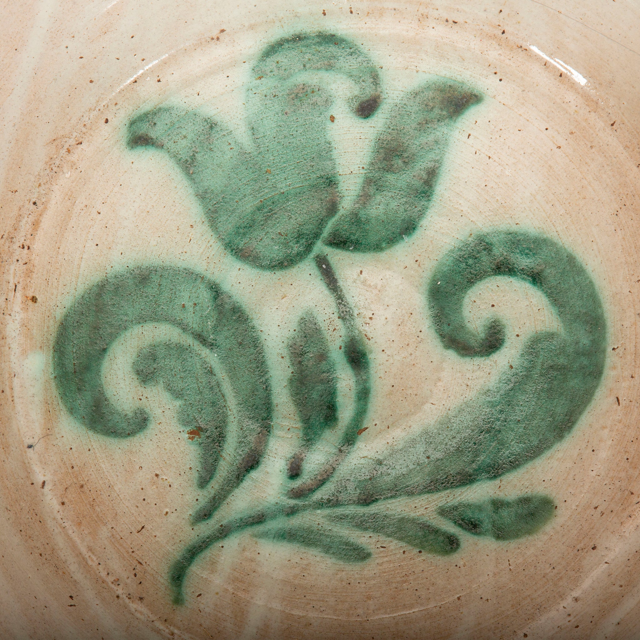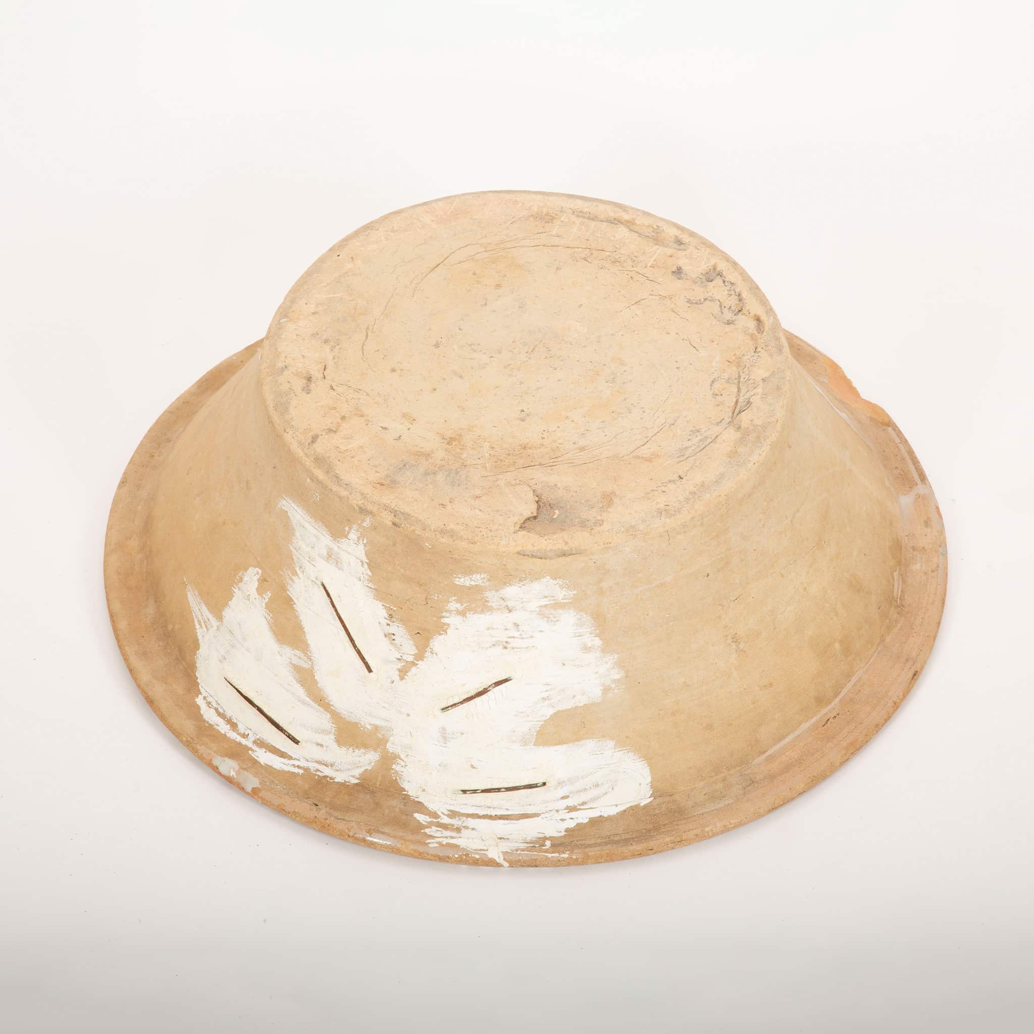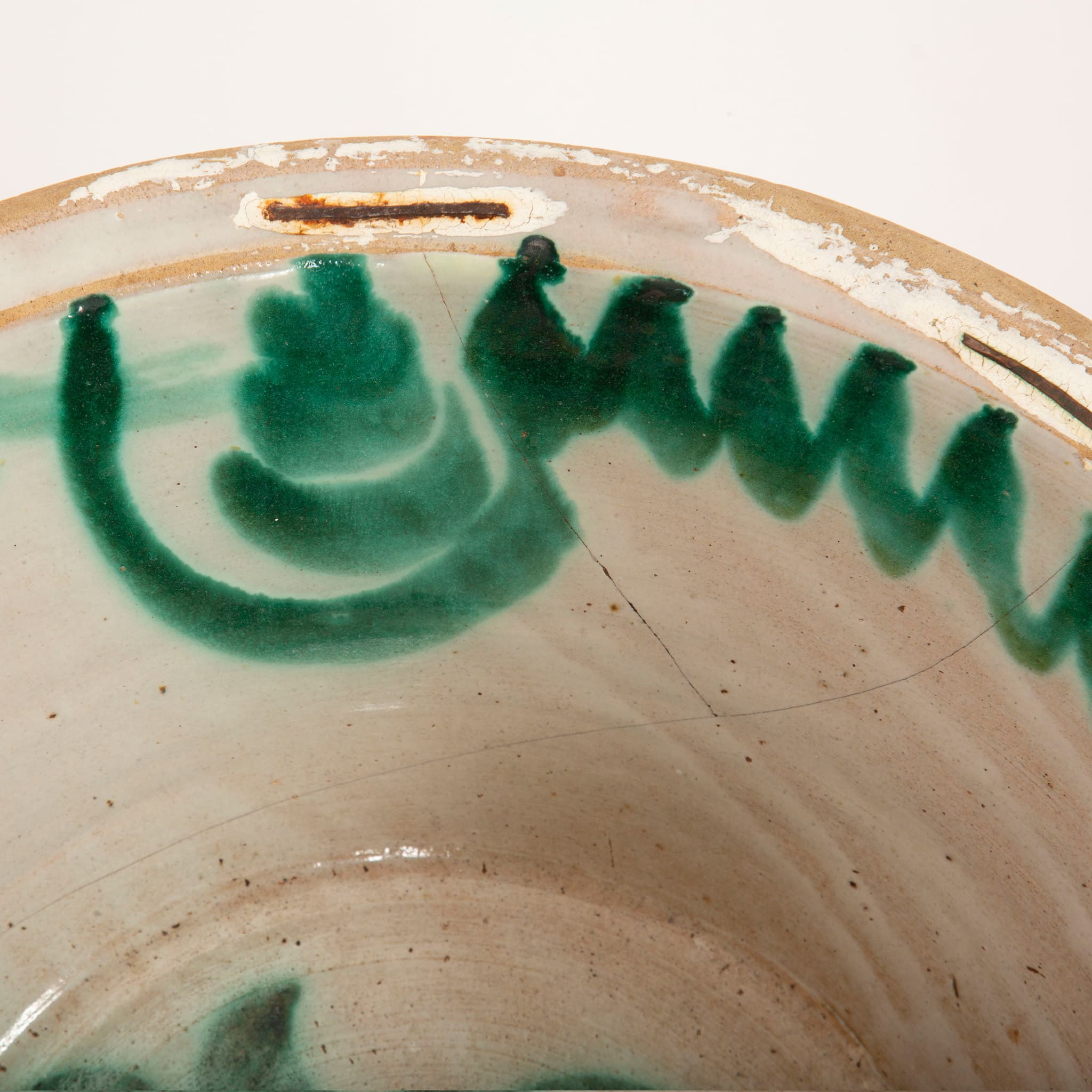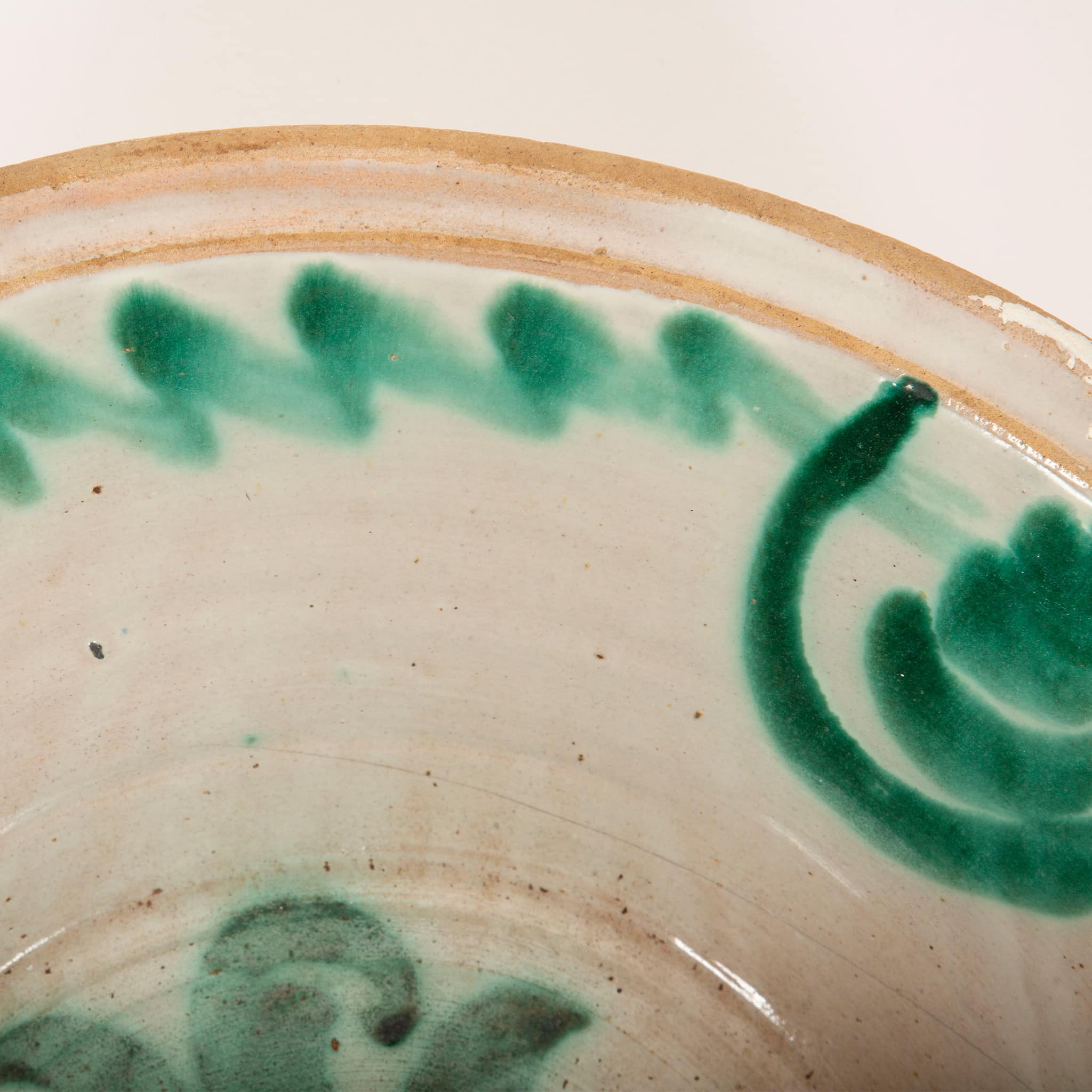 A 19th-century Spanish Fajalauza lebrillo from Granada, measuring 20.5 inches in diameter. A lebrillo is a wide ceramic bowl with a pronounced rim, first produced in Andalusia in the 15th century and traditionally decorated in green and white with a terracotta rim. These bowls were essential all-purpose household objects, used for laundry, food preparation, and bathing children, and were made in eight different sizes according to their function.