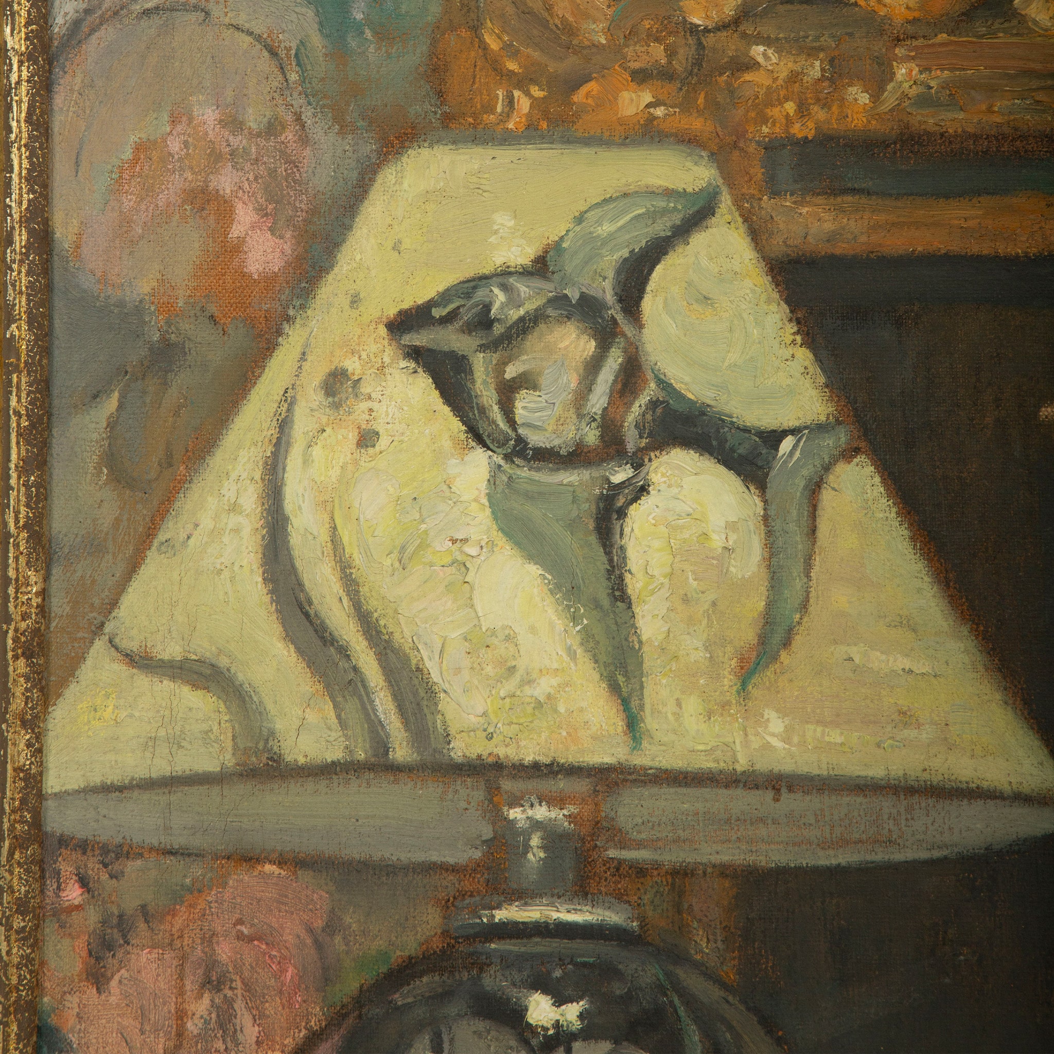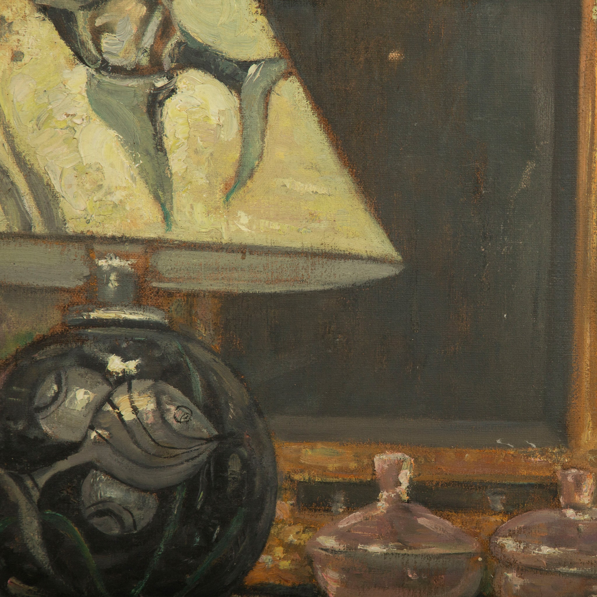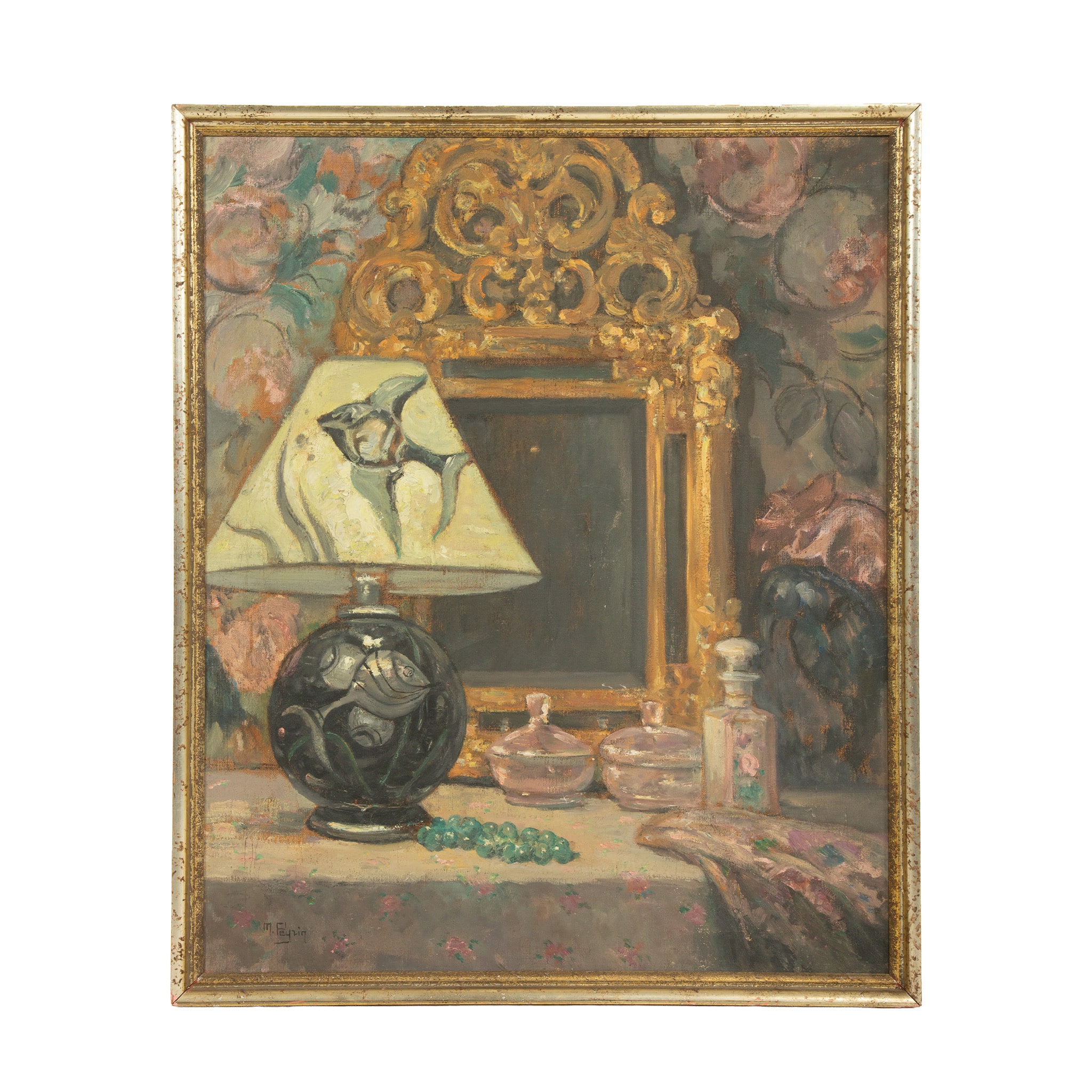 This refined mid-20th-century French interior still life depicts an intimate tabletop arrangement set before an ornate gilt mirror. Central to the composition is a sculptural table lamp with a boldly painted fish-form base, topped by a lampshade decorated with a stylized fish motif—an expressive and whimsical focal point that introduces movement and character to the scene.