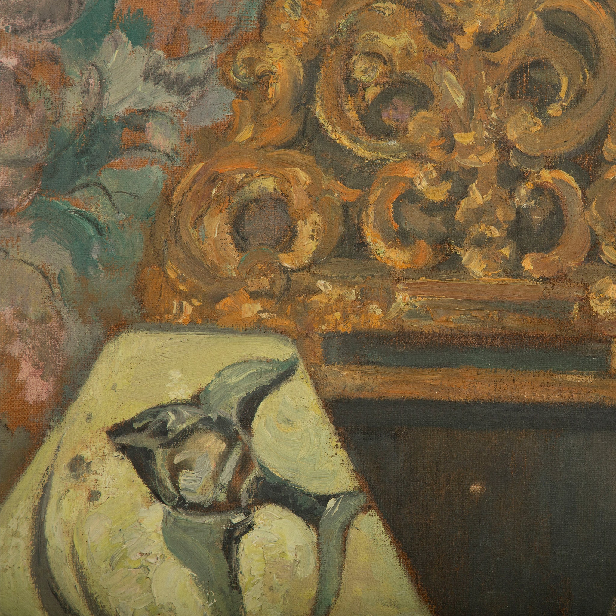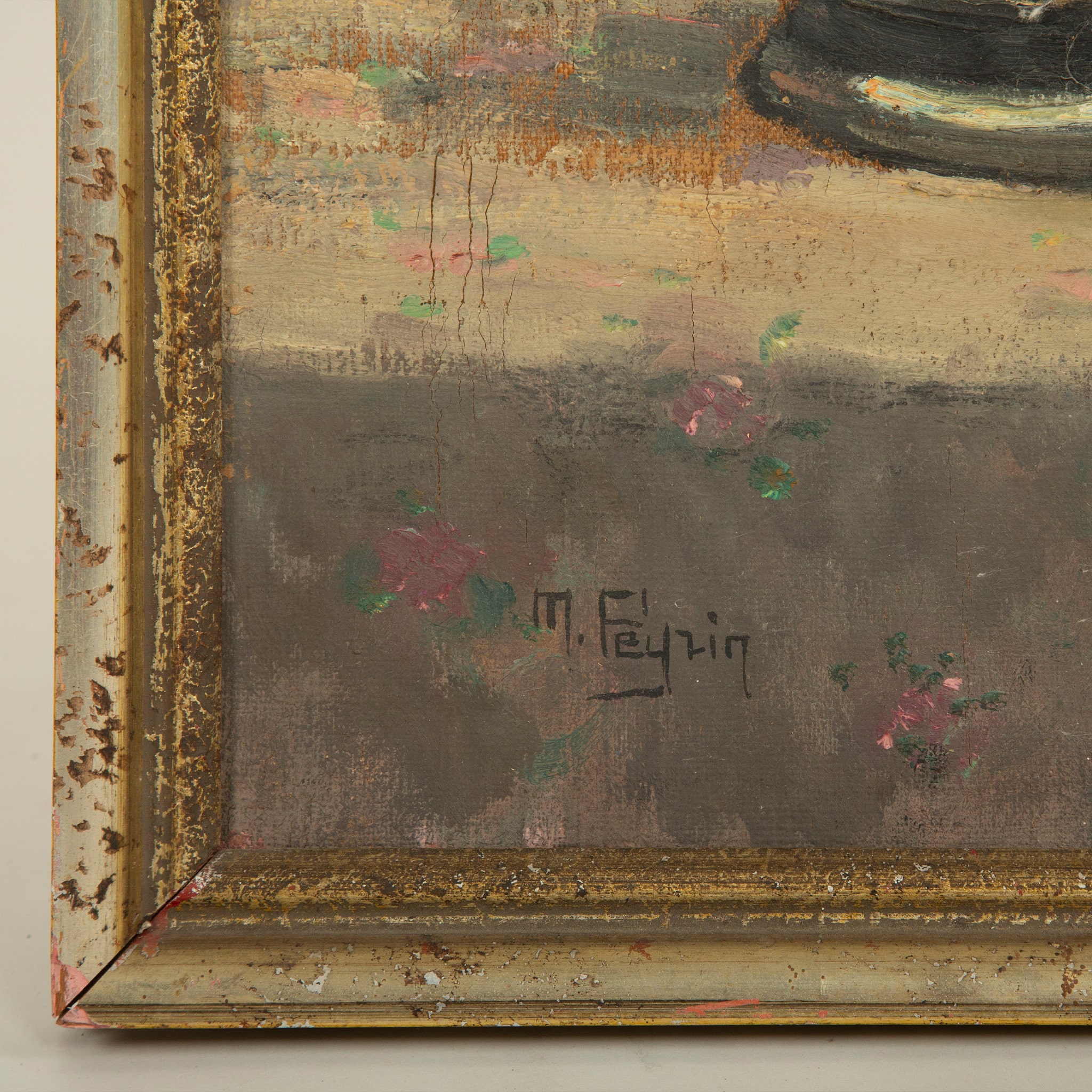 Signed by M. Peyzin, the painting reflects the enduring French tradition of interior still-life painting, blending decorative modernism with classical compositional balance. Presented in its period gilt frame, the work offers strong decorative appeal and a distinctly mid-century French sensibility.