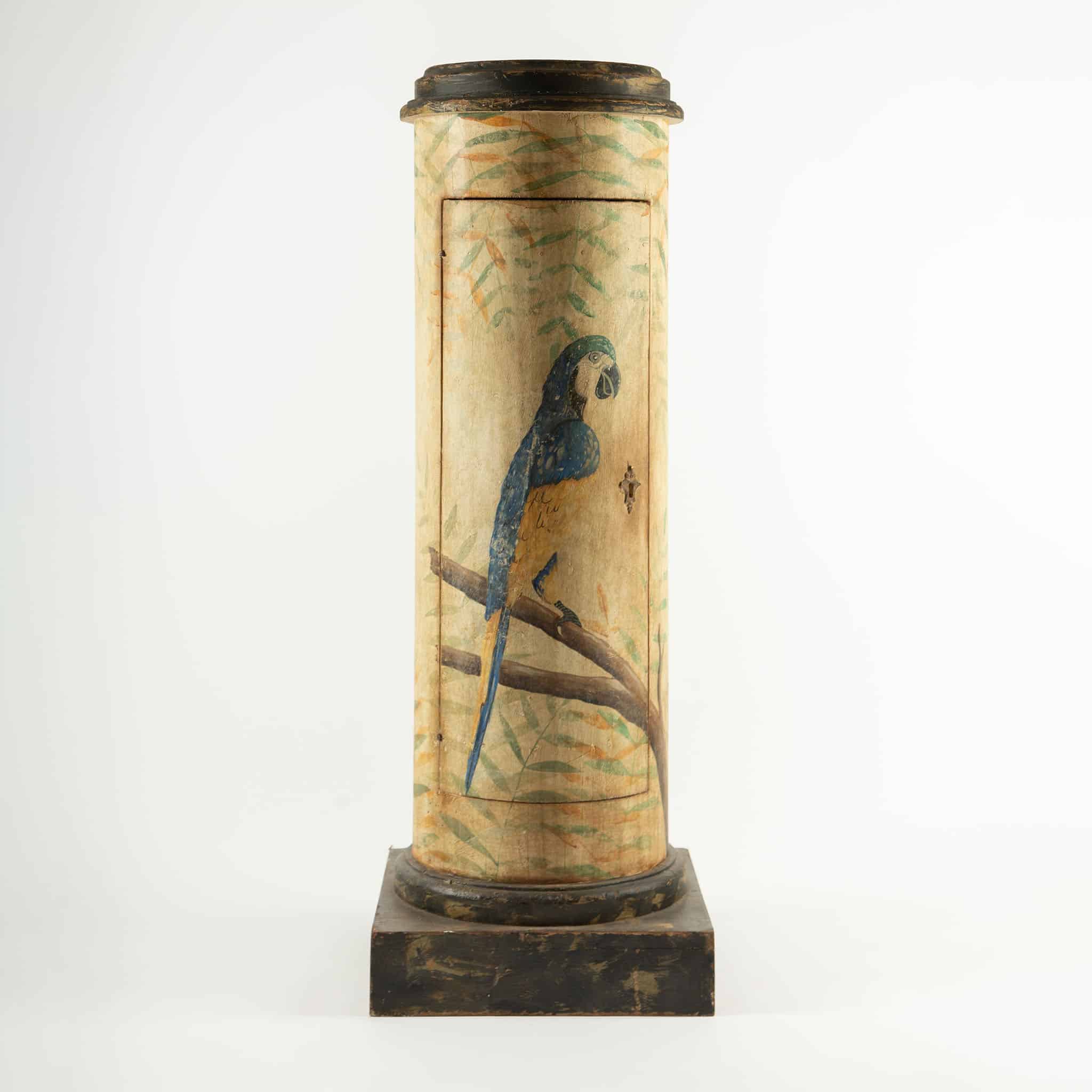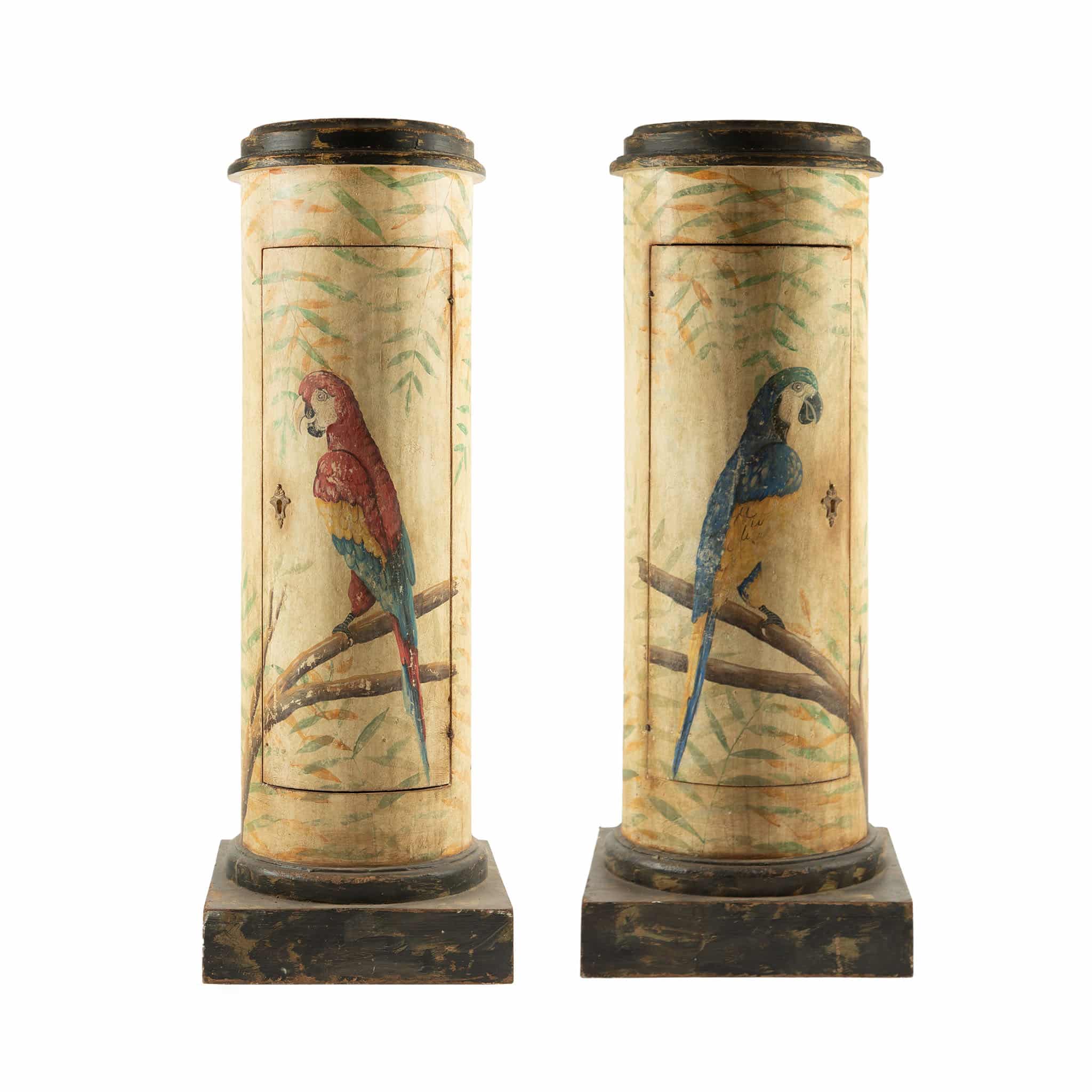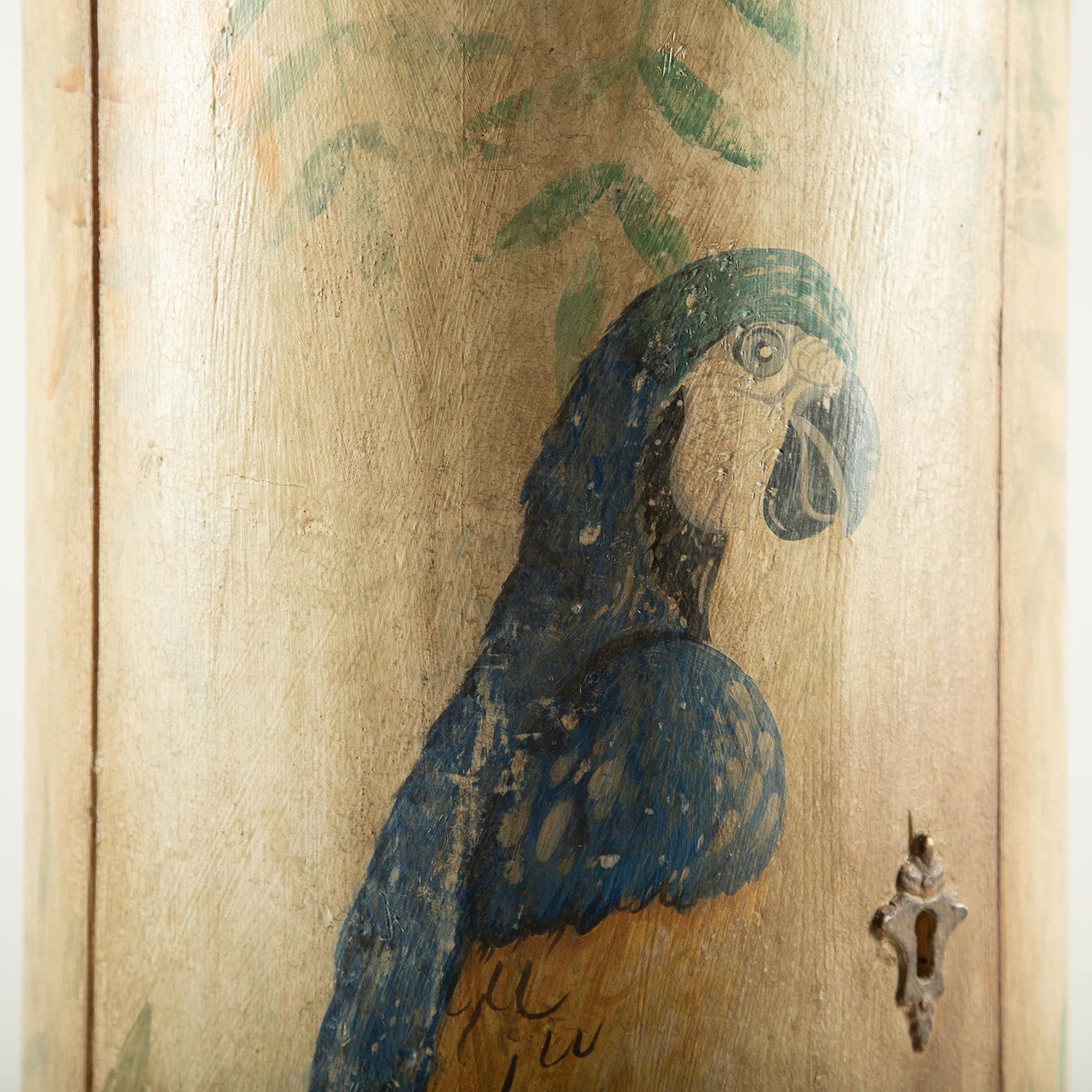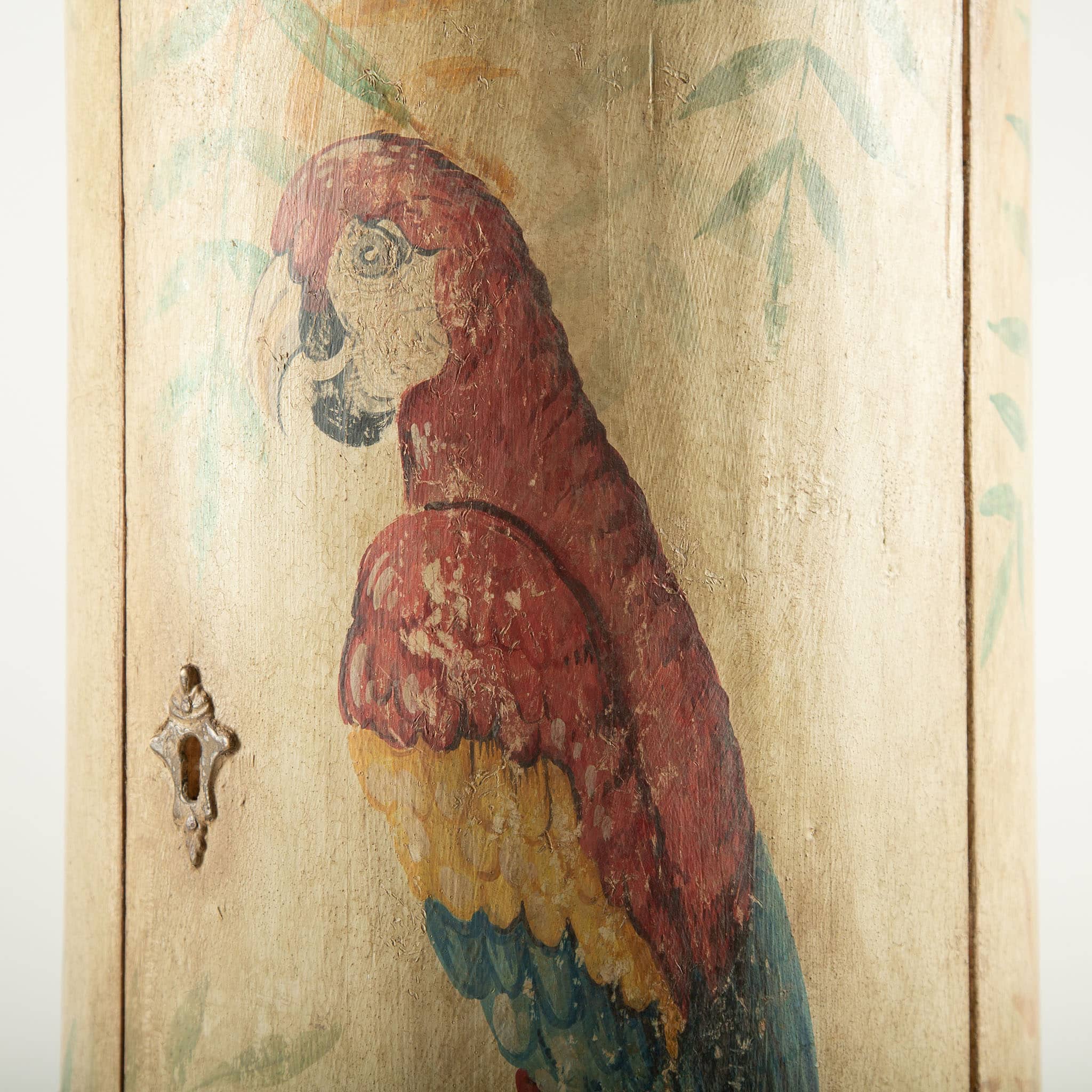 A rare matched pair of cylindrical pedestal cabinets, hand-crafted from pine and poplar and entirely polychrome-painted in the lacche povere manner prized in 18th-century Venice. Each column stands on a stepped square plinth, its hinged frontal door painted with exuberant macaws—a scarlet-green-blue ara on one pedestal and a blue-and-gold ara on the other—perched amid feathery bamboo fronds. The faux-marble capitals and bases are washed in charcoal and ochre glazes that complement the mellow cream ground. Opening with original wrought-iron escutcheons, the doors reveal two shelved compartments, making the pieces as practical as they are decorative—perfect for concealing barware, silver, or curios while presenting plants, sculpture, or lamps above. Surfaces show the gentle craquelure, scuffs, and small touch-ups consistent with more than two centuries of Venetian life, preserving an irresistible patina. Italian, Venice, c. 1780s. Measurement across the top is 12" width: 15.75" depth: 15.75" height: 44.25