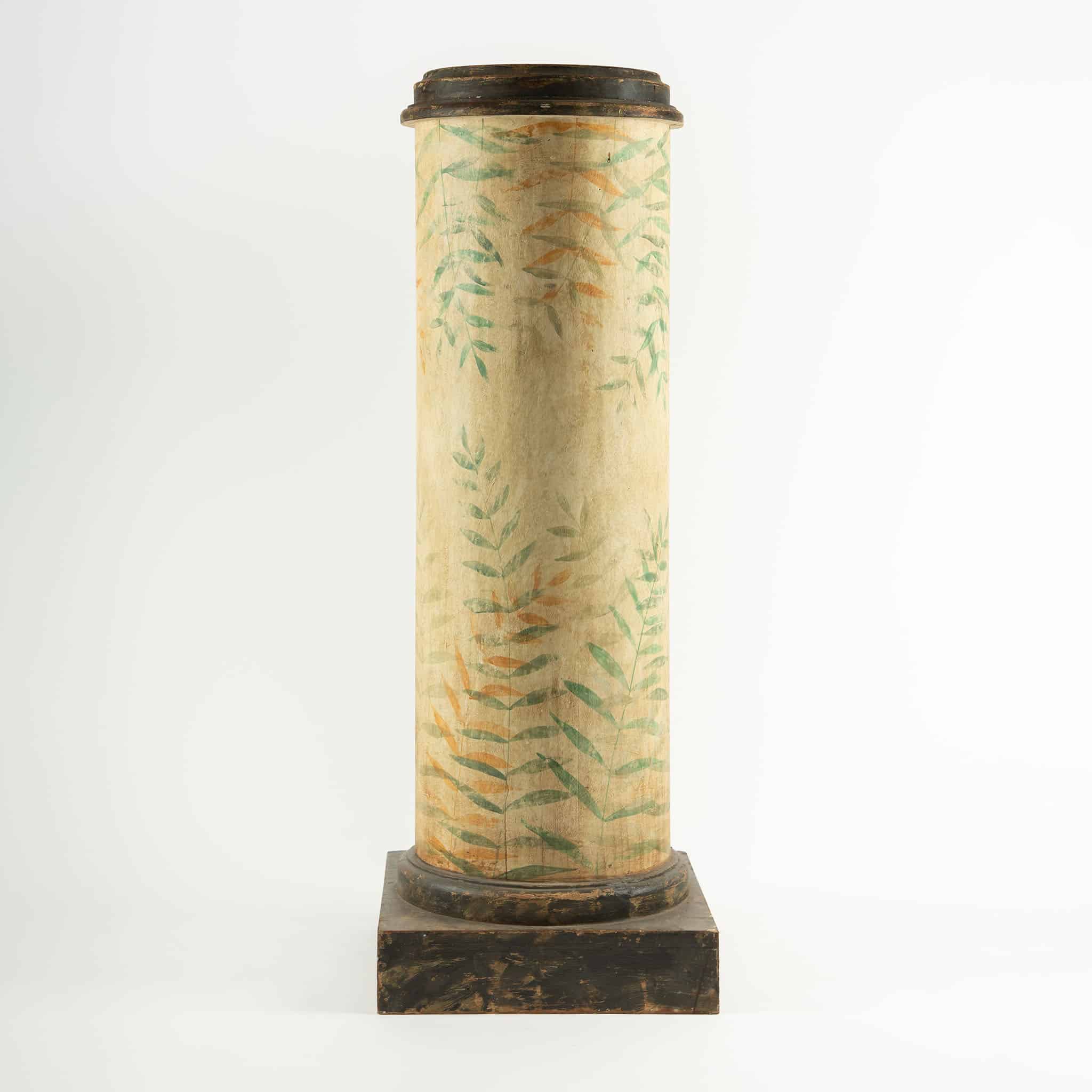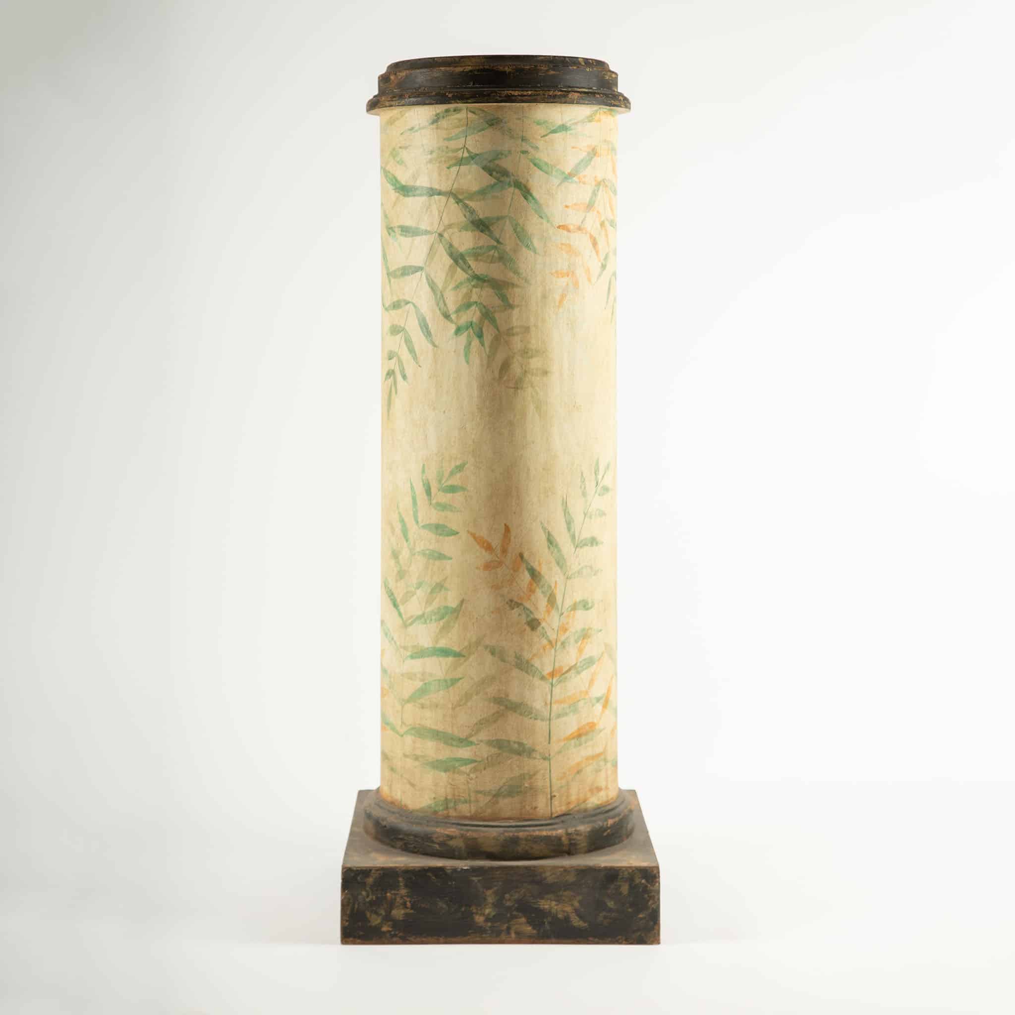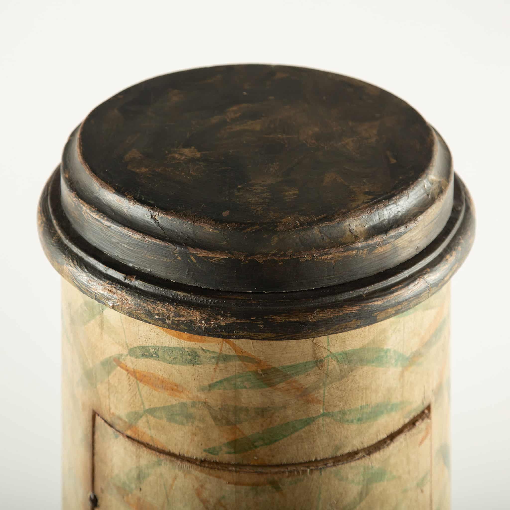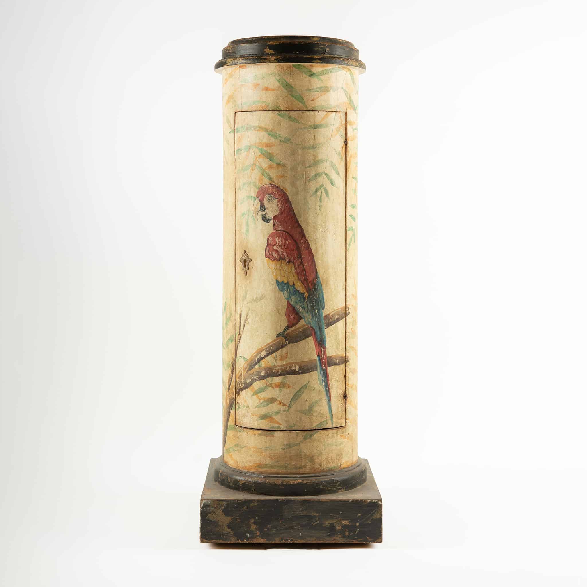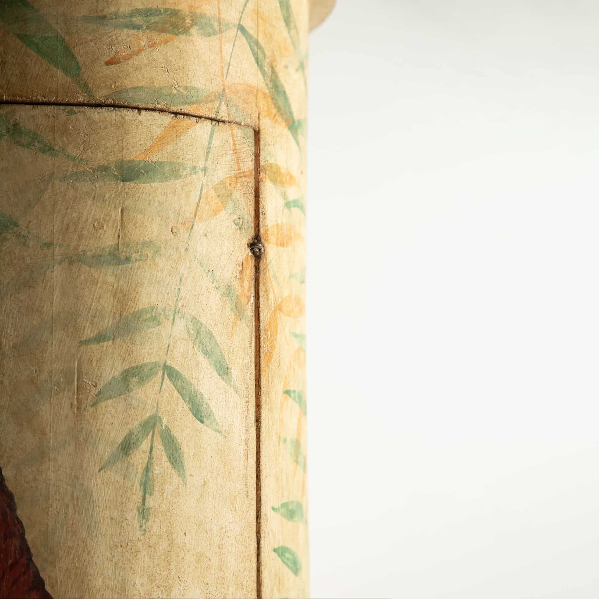 A rare matched pair of cylindrical pedestal cabinets, hand-crafted from pine and poplar and entirely polychrome-painted in the lacche povere manner prized in 18th-century Venice. Each column stands on a stepped square plinth, its hinged frontal door painted with exuberant macaws—a scarlet-green-blue ara on one pedestal and a blue-and-gold ara on the other—perched amid feathery bamboo fronds. The faux-marble capitals and bases are washed in charcoal and ochre glazes that complement the mellow cream ground. Opening with original wrought-iron escutcheons, the doors reveal two shelved compartments, making the pieces as practical as they are decorative—perfect for concealing barware, silver, or curios while presenting plants, sculpture, or lamps above. Surfaces show the gentle craquelure, scuffs, and small touch-ups consistent with more than two centuries of Venetian life, preserving an irresistible patina. Italian, Venice, c. 1780s. Measurement across the top is 12" width: 15.75" depth: 15.75" height: 44.25