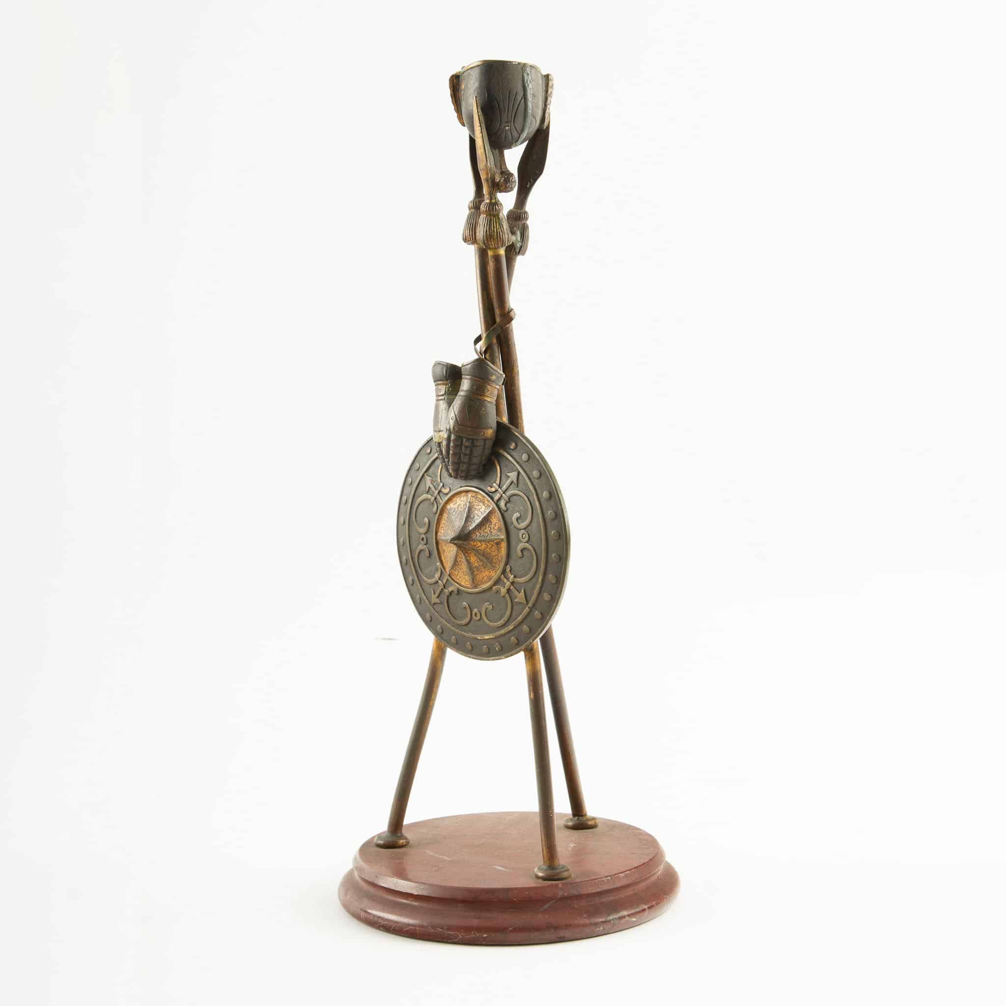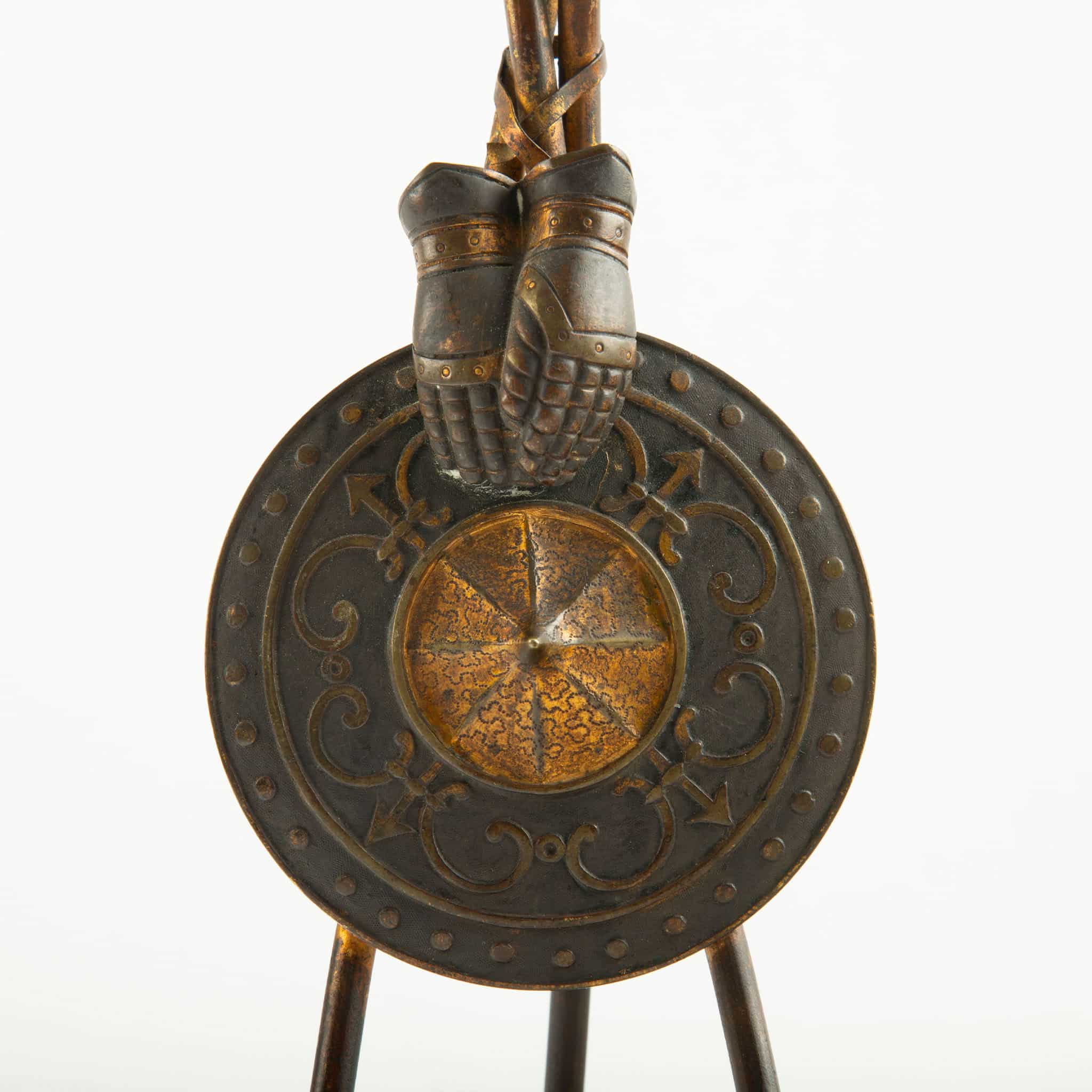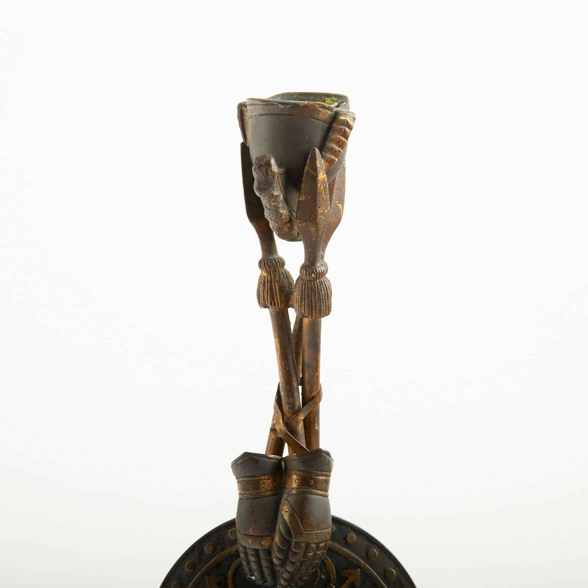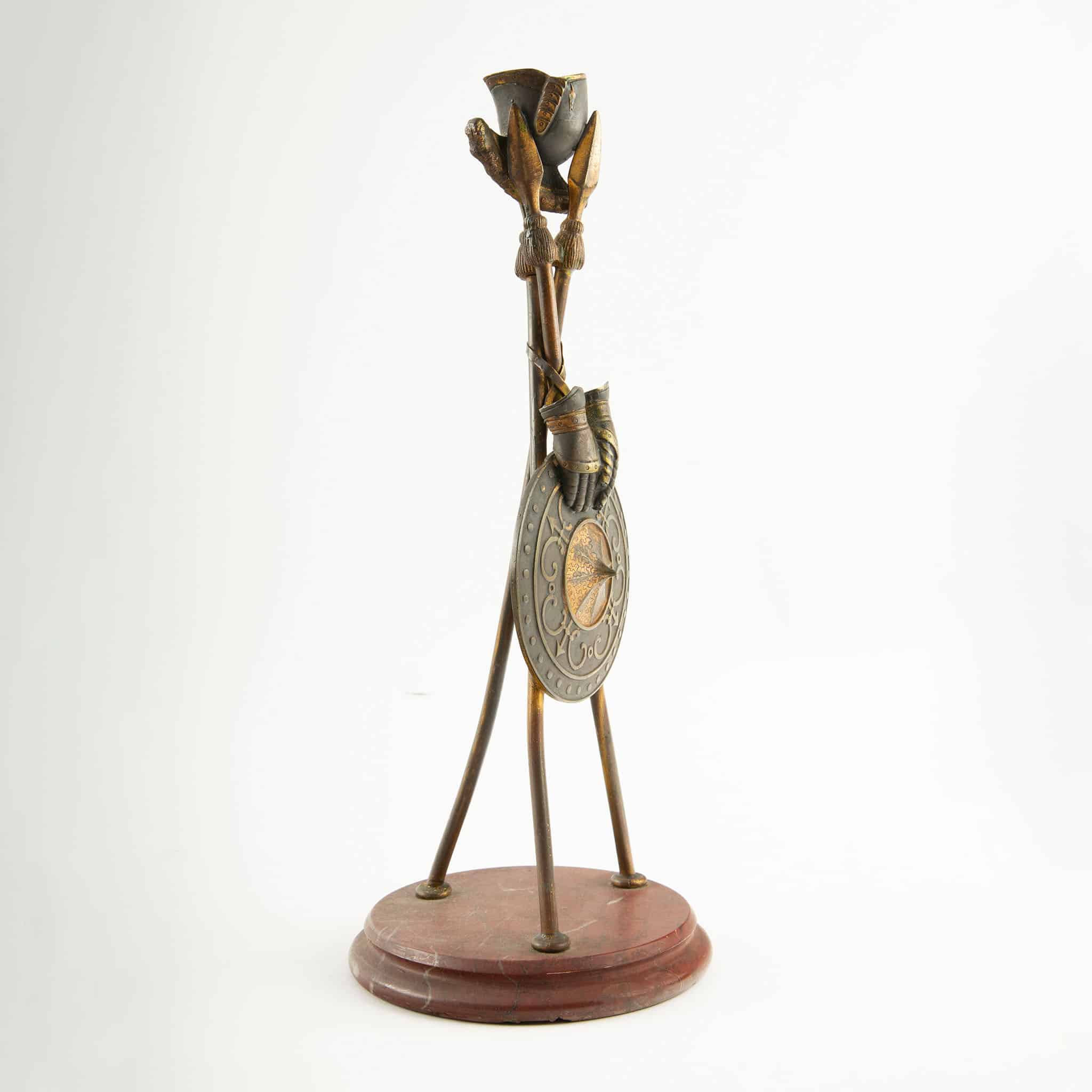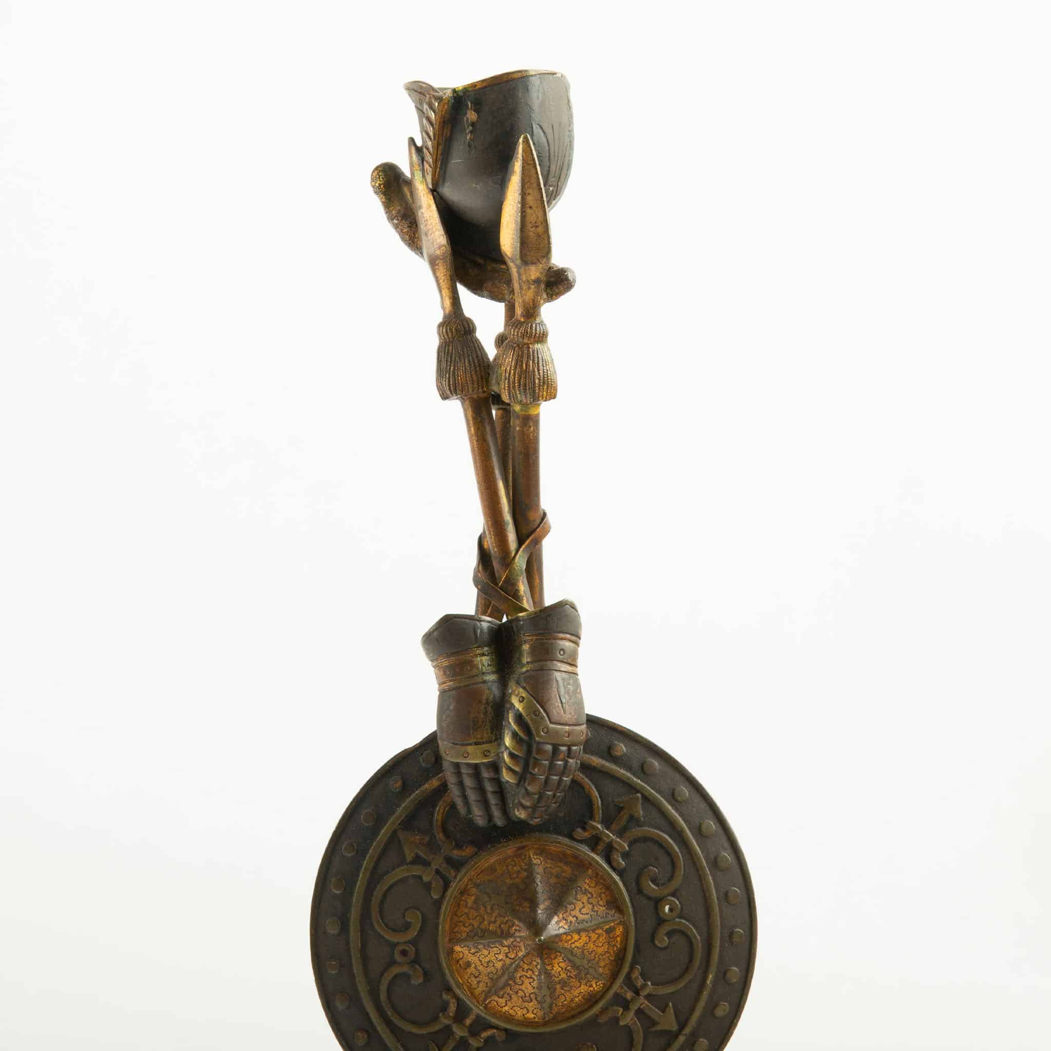 Pair of 19th-Century Bronze Candlesticks with Martial Motifs, France, mid-19th century (circa 1850–1870), Second Empire period. Each candlestick is conceived as a sculptural tripod formed by crossed spears, rising from circular rouge marble bases. The shafts are enriched with finely cast and chased military attributes, including a round shield decorated with scrolling ornament and a central boss, crossed gloves, tasselled elements, and a helmet-form candle cup above, evoking classical and Renaissance-inspired arms and armor.