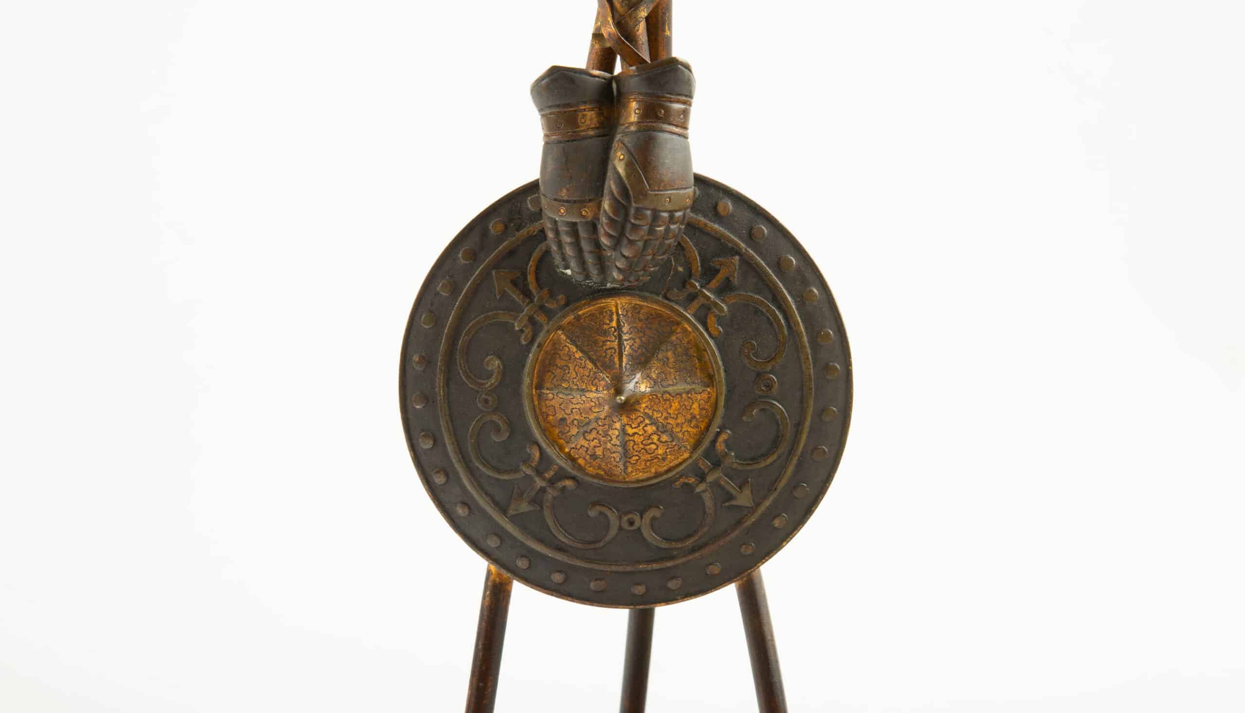 Executed in patinated bronze with gilt highlights, these candlesticks reflect the strong taste for historicism and martial symbolism prevalent during the reign of Napoleon III, when decorative objects often drew inspiration from antiquity and the Renaissance. The bronze elements are crisply detailed, with contrasting dark and warm tones, and the marble bases provide both visual weight and stability. Minor wear to the patina and light surface marks to the marble are consistent with age. A dramatic and uncommon pair, well-suited to collectors of 19th-century French decorative arts or interiors with a neoclassical or eclectic character.