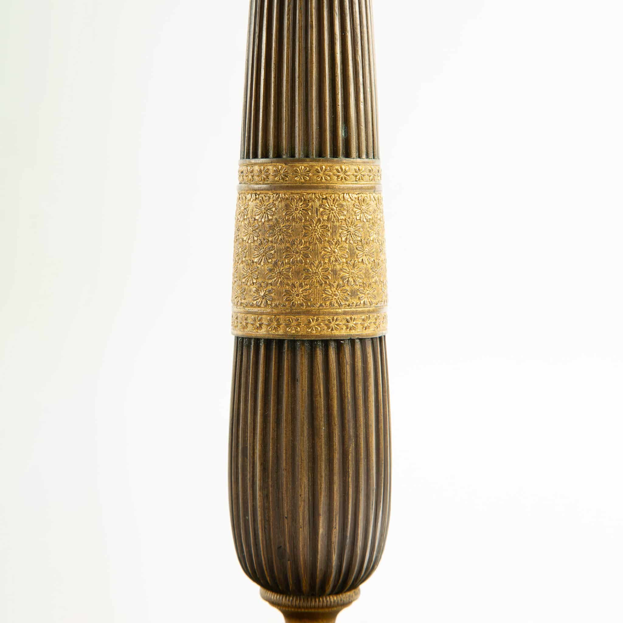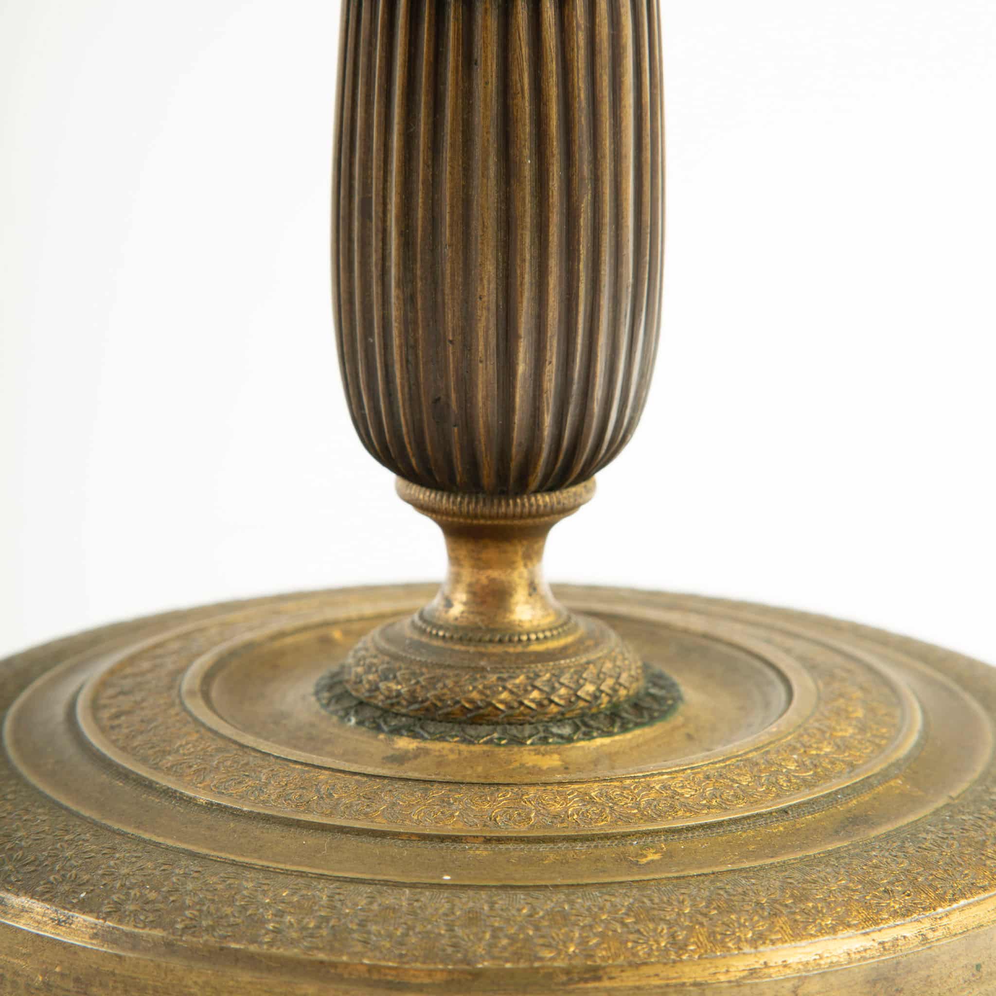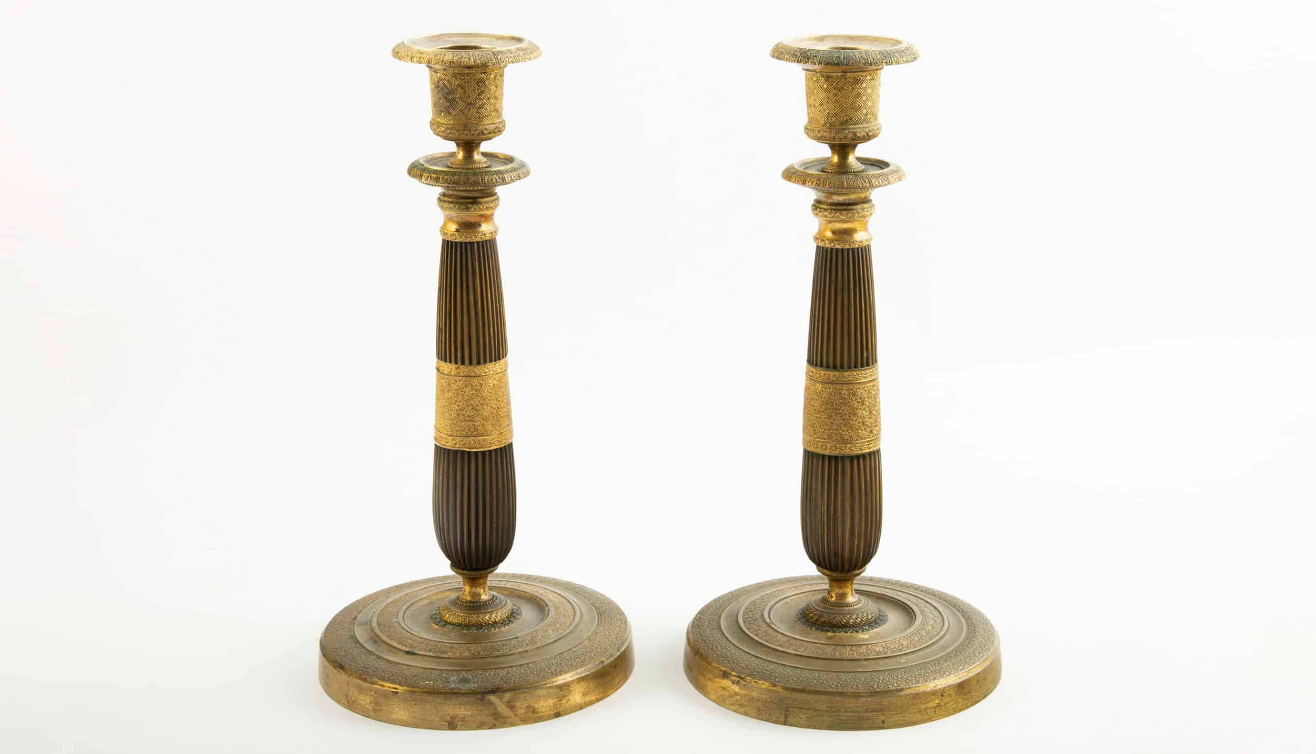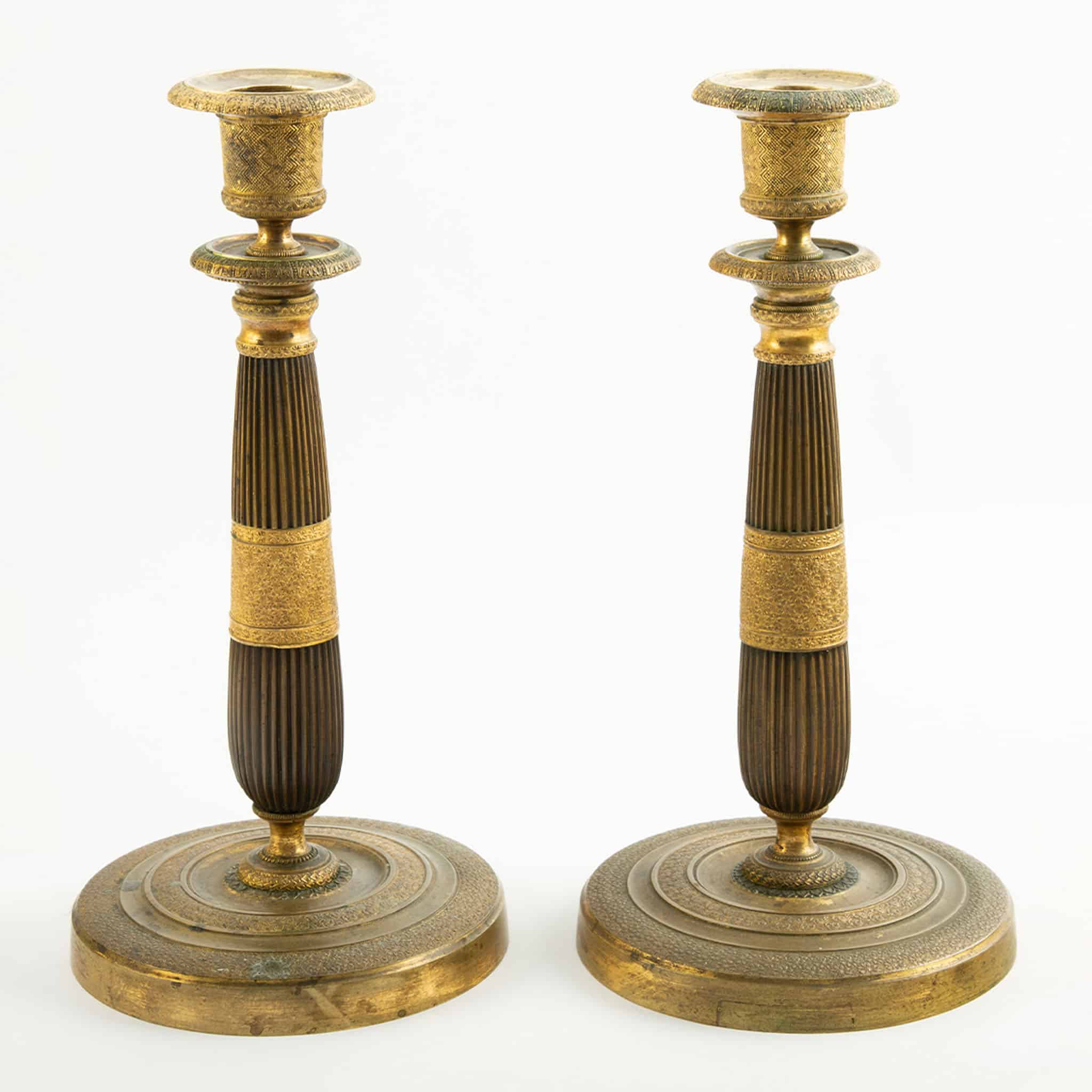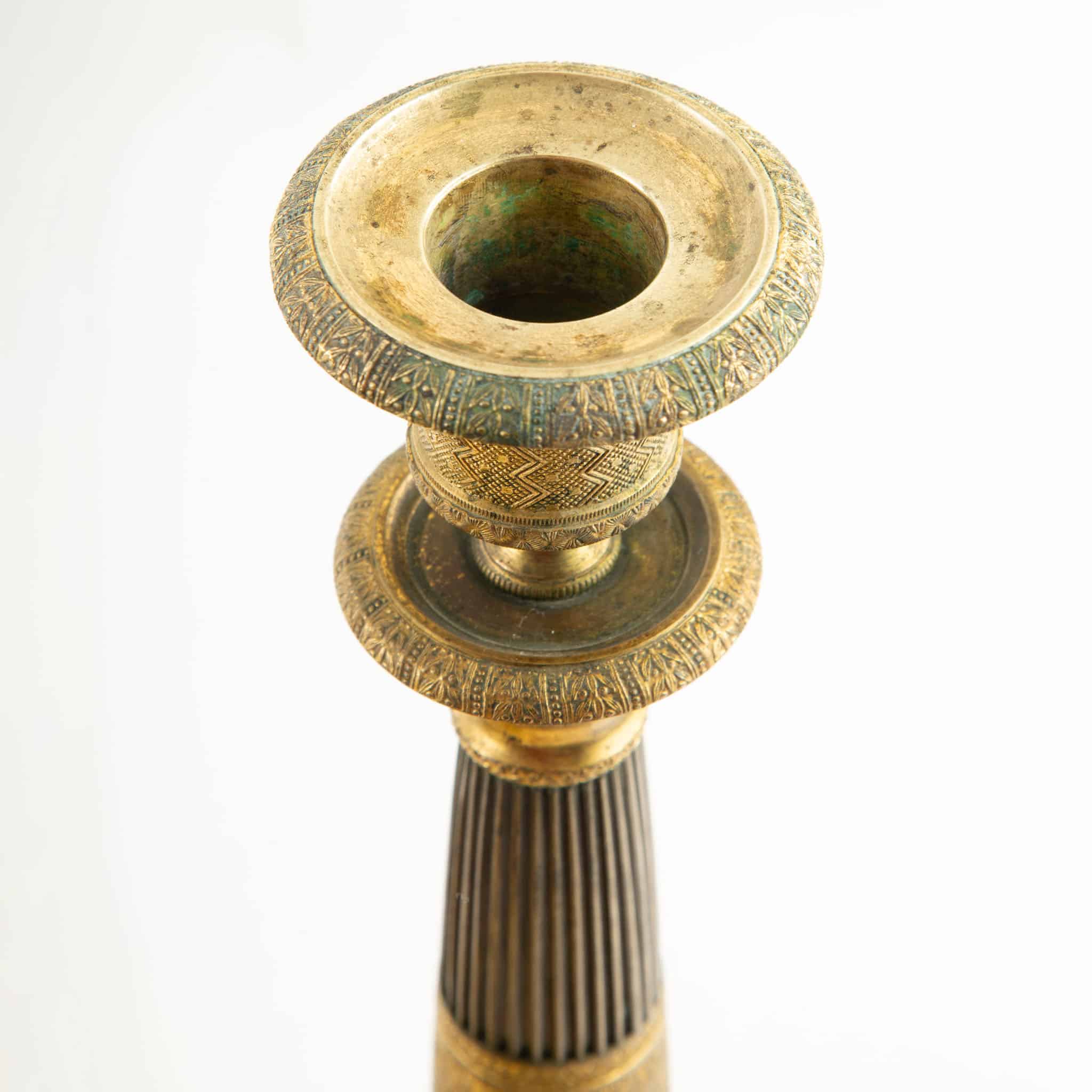 Cast, turned, and hand-chased in gilt bronze, likely retaining original mercury fire-gilding, with a warm matte-gold surface and areas of gentle wear consistent with age and use. Subtle patination and minor rubbing are present, enhancing the depth of the decoration without detracting from the overall harmony. A well-matched and elegant pair, characteristic of French decorative bronze work from the Restoration period and well suited to classical or transitional interiors.
